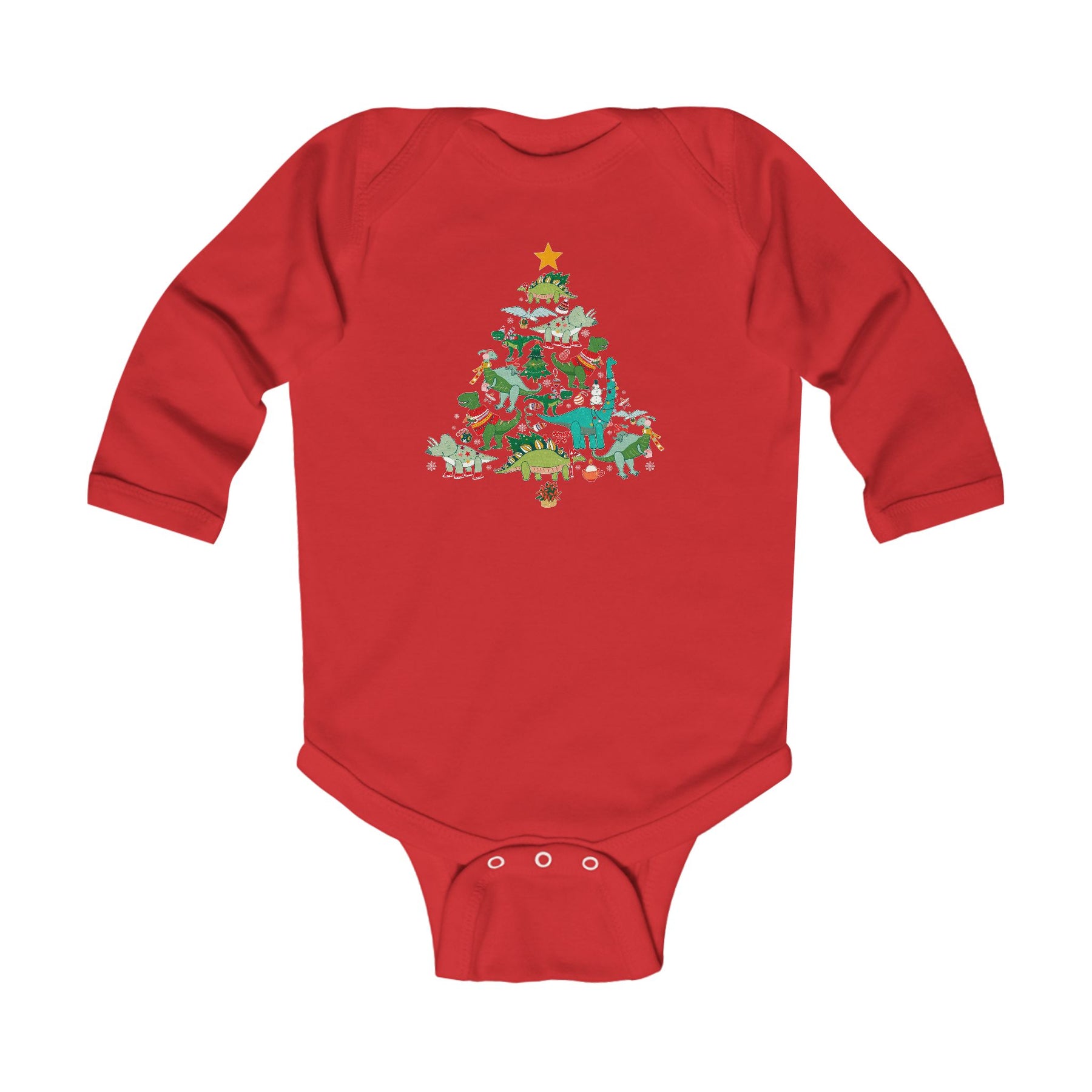 Baby Dino Tree Onesie: Red long-sleeve bodysuit with a Christmas tree of dinosaurs graphic, featuring holiday ornaments and a star. Soft, durable fabric with easy-snap closure.