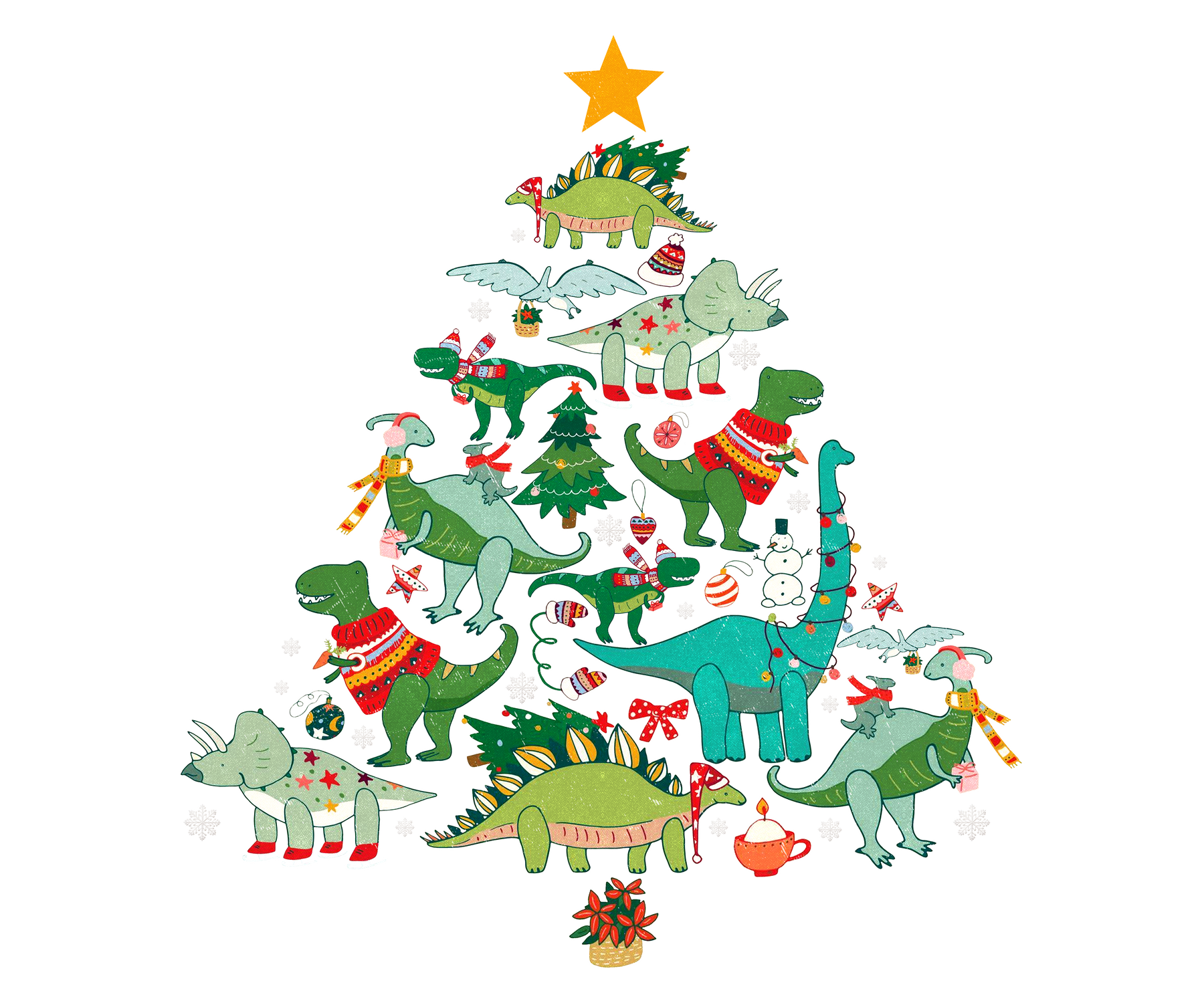 Baby Dino Tree Onesie: Cartoon dinosaurs in holiday gear form a Christmas tree shape with festive elements like snowflakes and gifts, emphasizing playful holiday spirit.