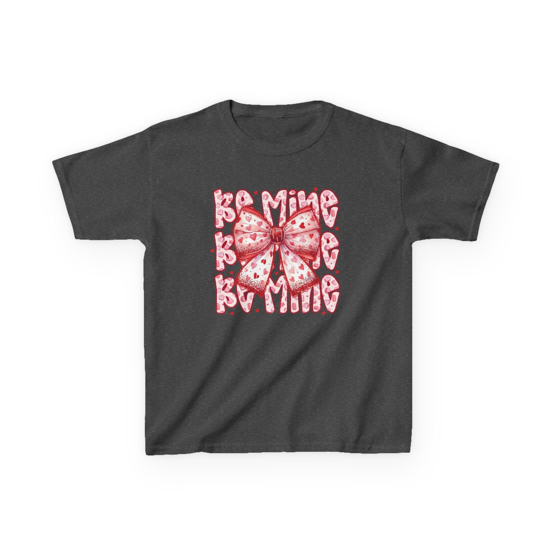 Be Mine Kids Tee features a charcoal-gray design with a pink-and-red heart bow and BE MINE in a heart-patterned, bubbly typeface, perfect for everyday wear.