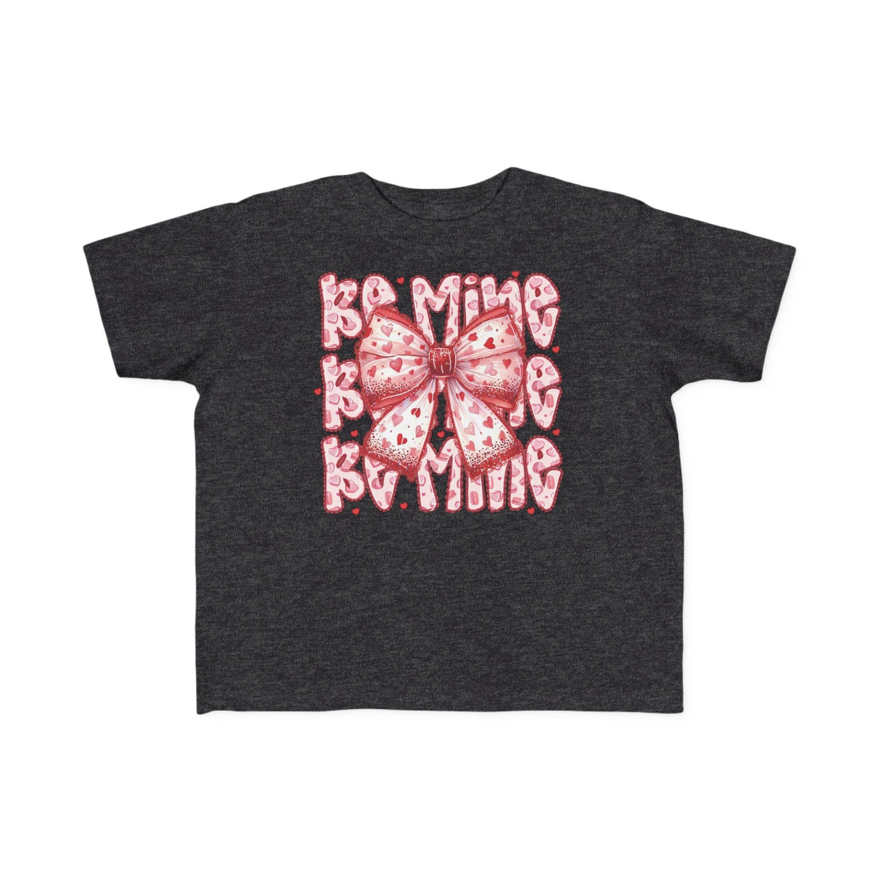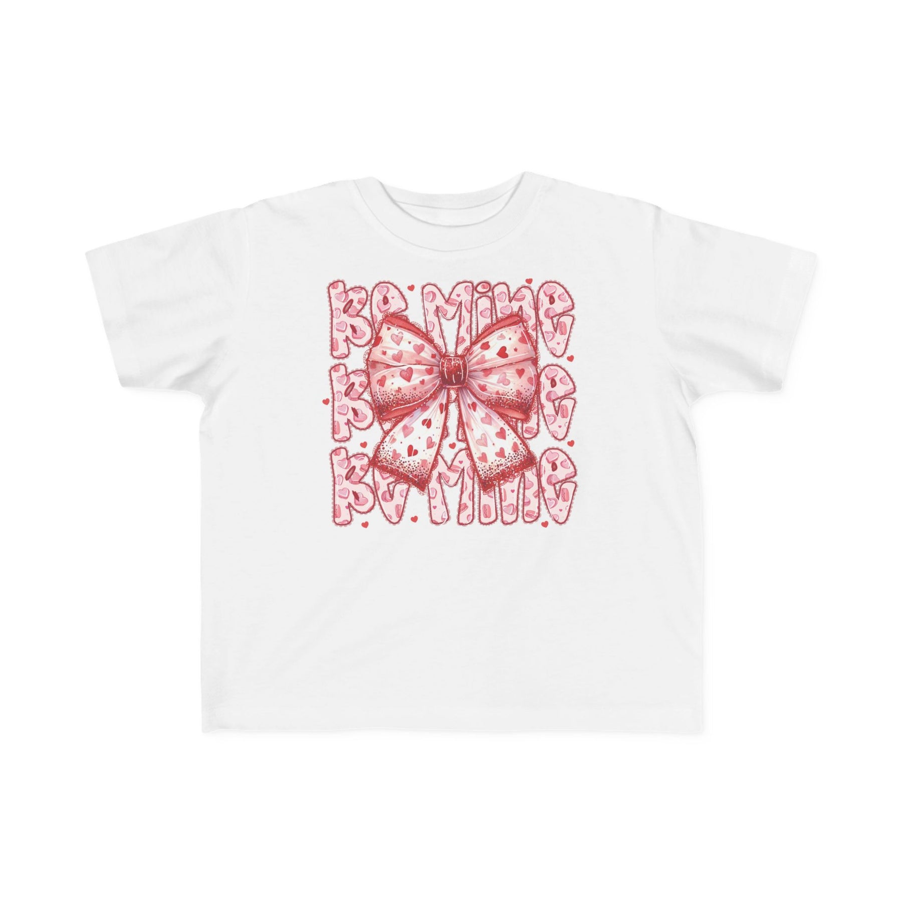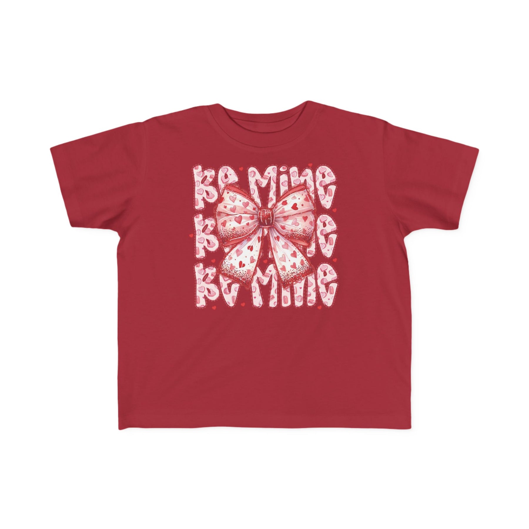 Be Mine Toddler Tee featuring a central ribbon-style bow with red hearts and BE MINE in heart-patterned letters, crafted for toddler comfort and durability.