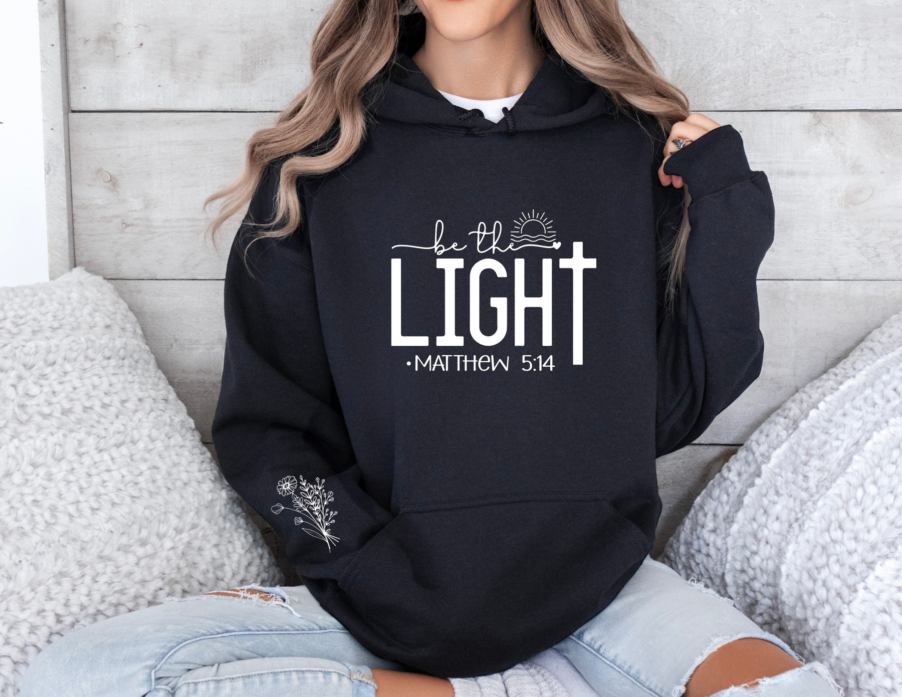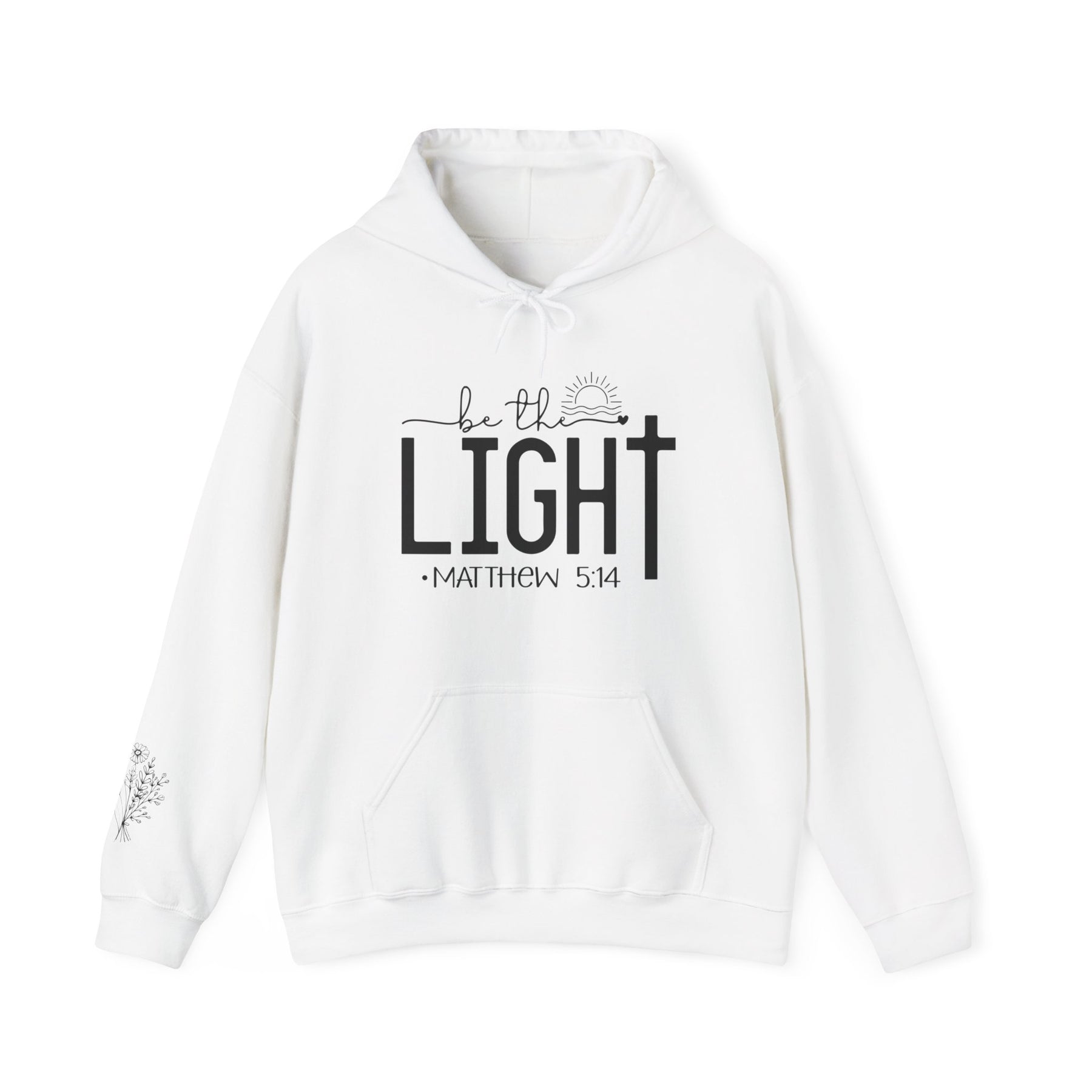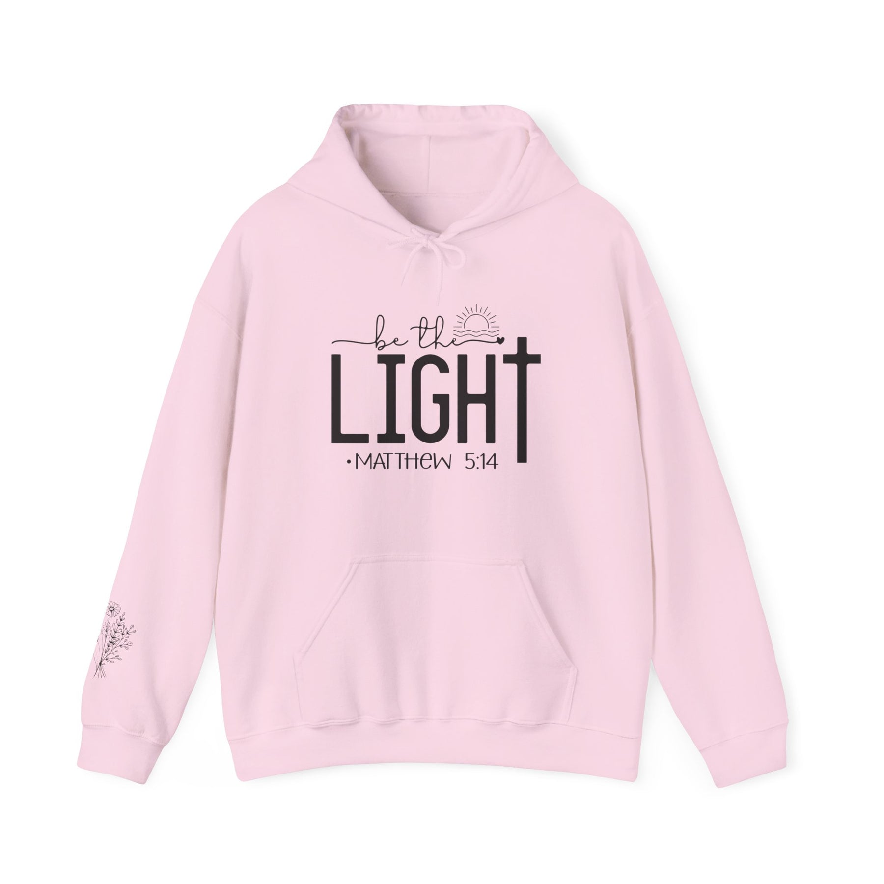 A unisex Be the Light Hoodie, a cozy blend of cotton and polyester, featuring a kangaroo pocket and matching drawstring hood. Medium-heavy fabric for warmth and comfort. Perfect for chilly days.