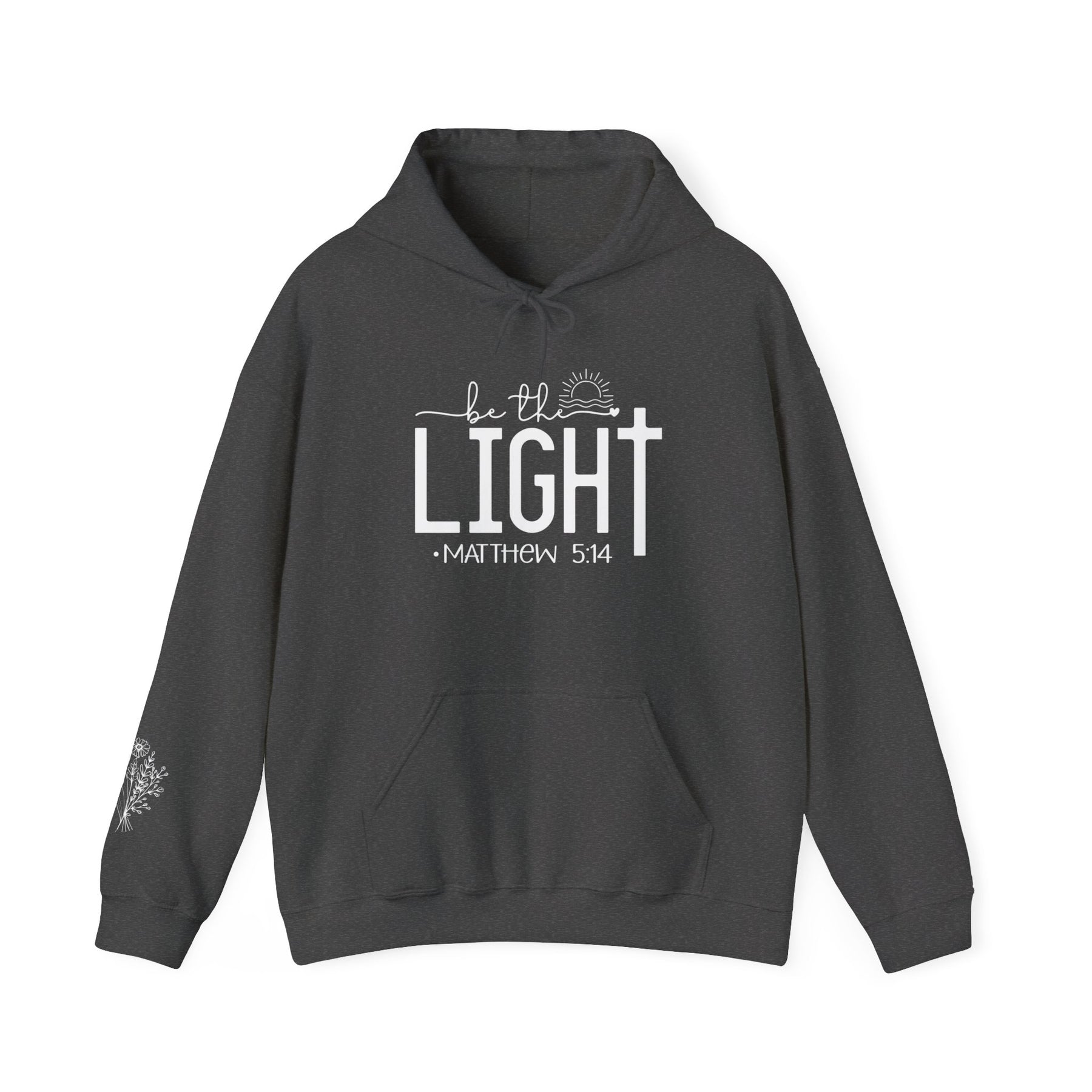 Unisex Be the Light Hoodie: Grey sweatshirt with white text. Thick cotton-polyester blend for warmth. Kangaroo pocket and matching drawstring. Classic fit, tear-away label, true to size.