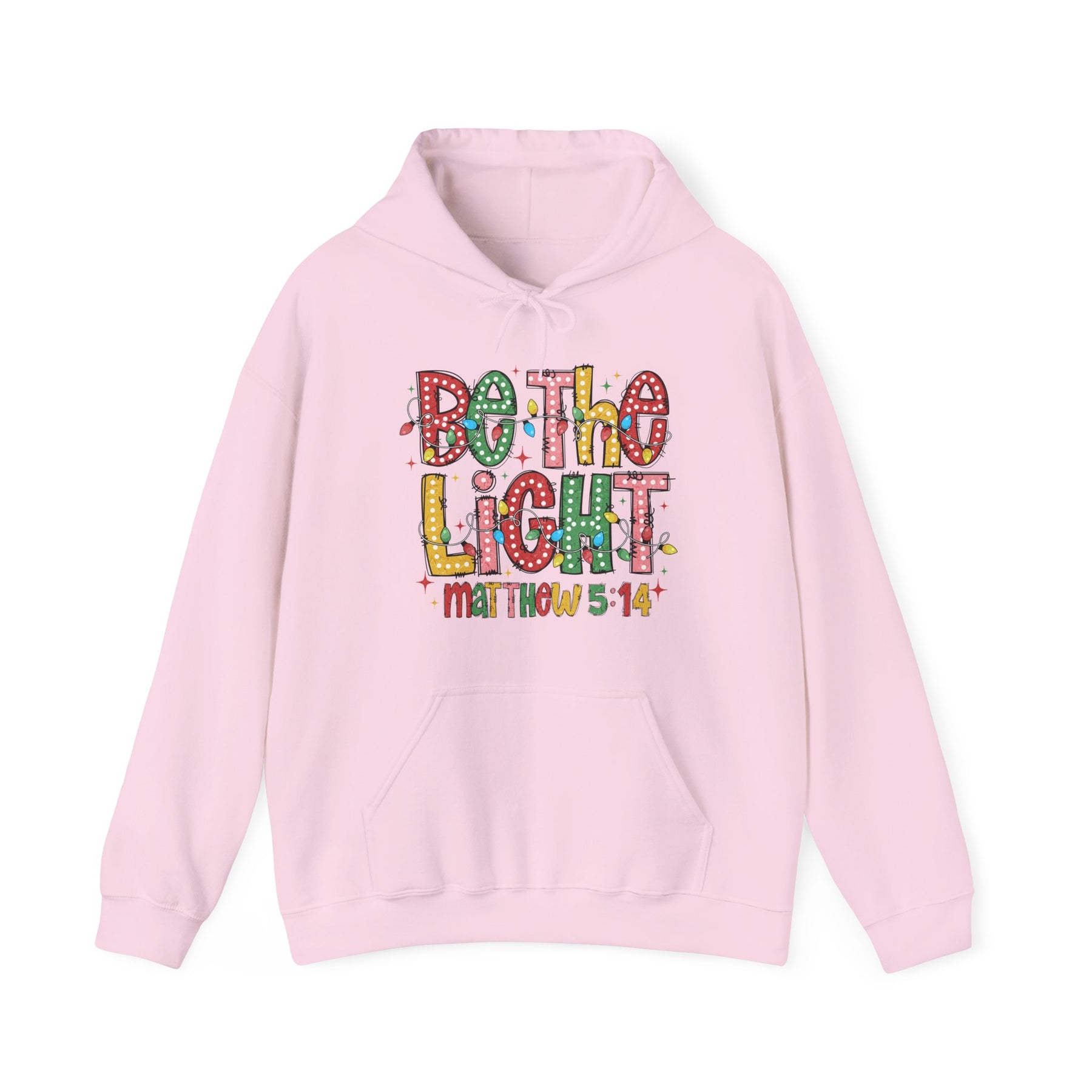 Light-pink Be the Light hoodie with multicolored letters and Christmas lights graphic, featuring a kangaroo pocket and drawstring hood, perfect for cozy days.