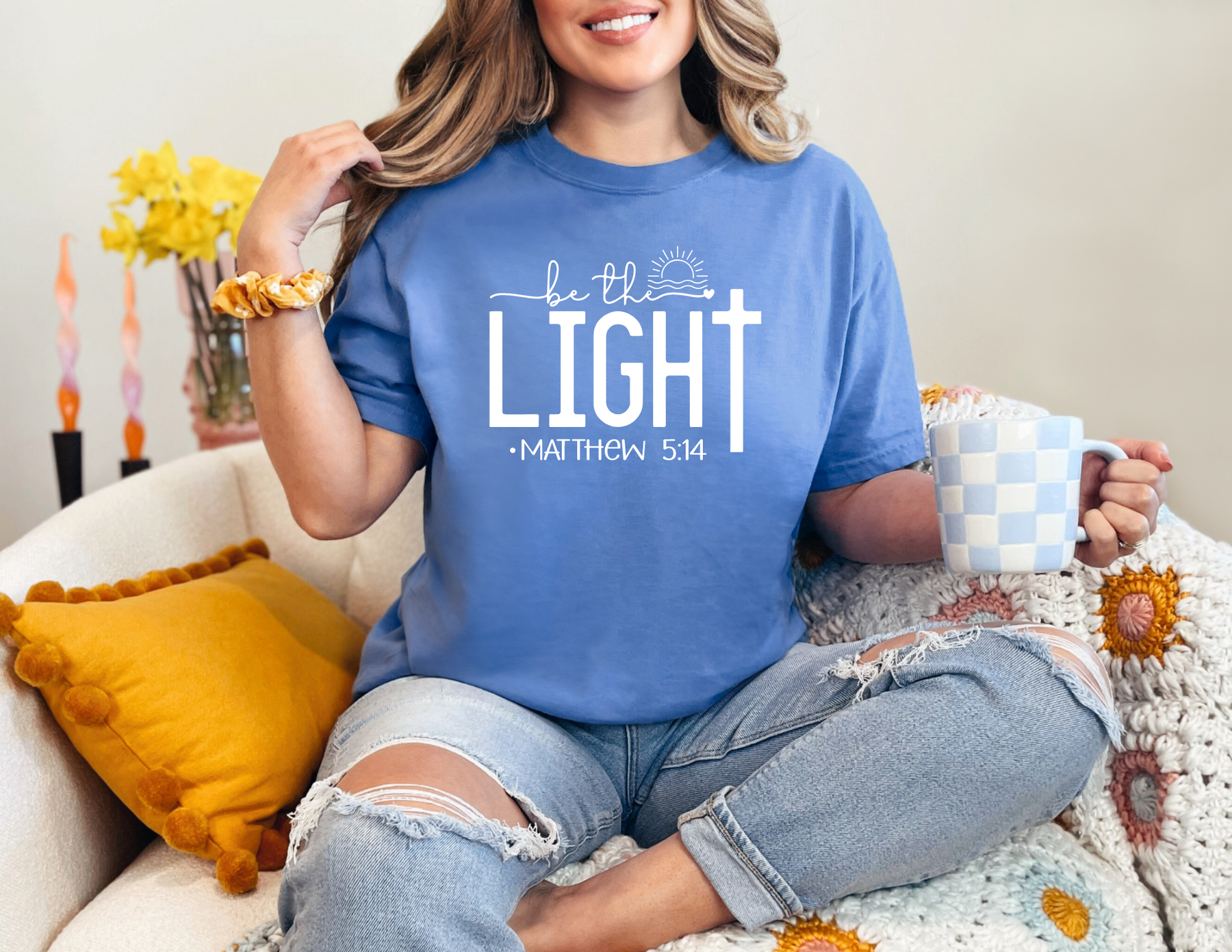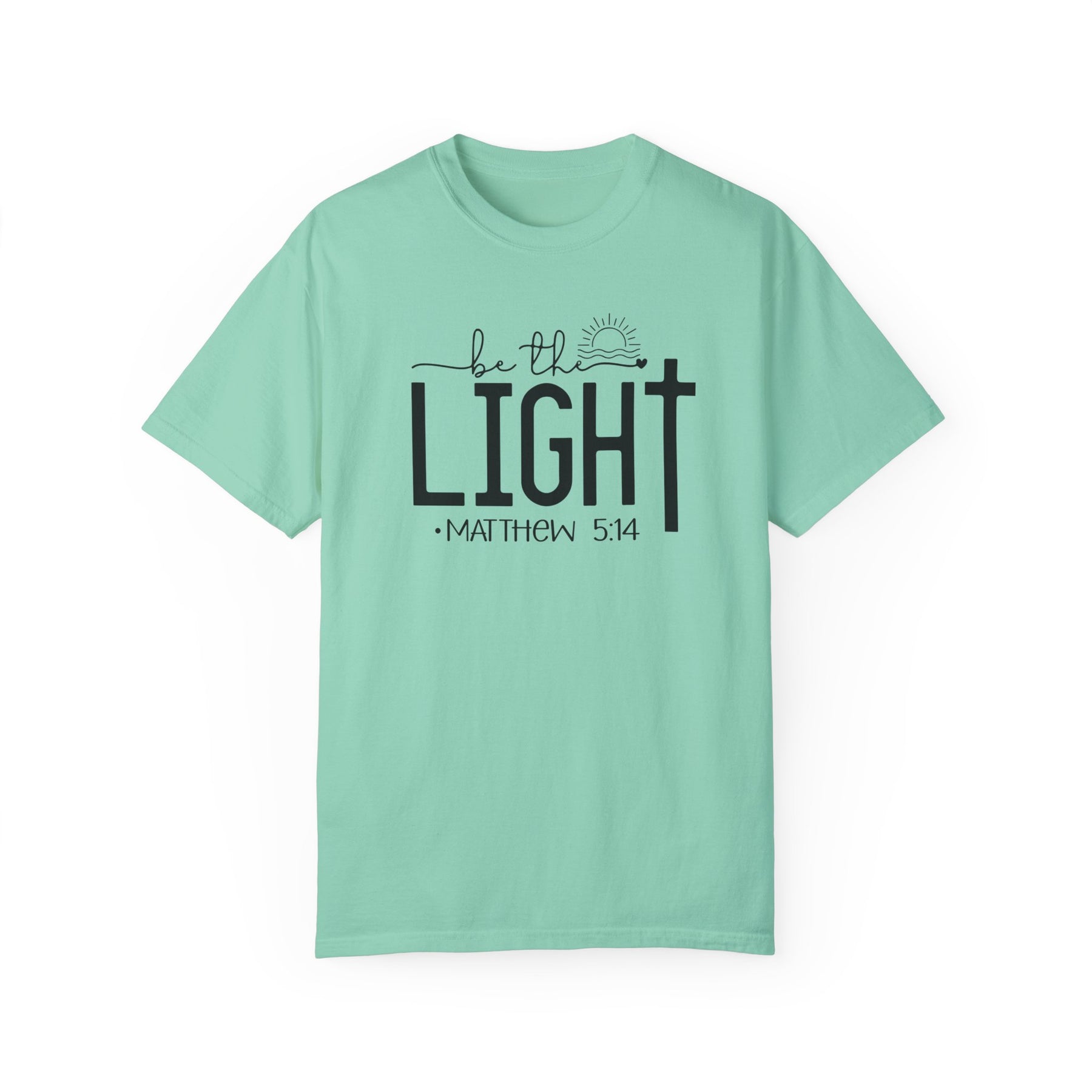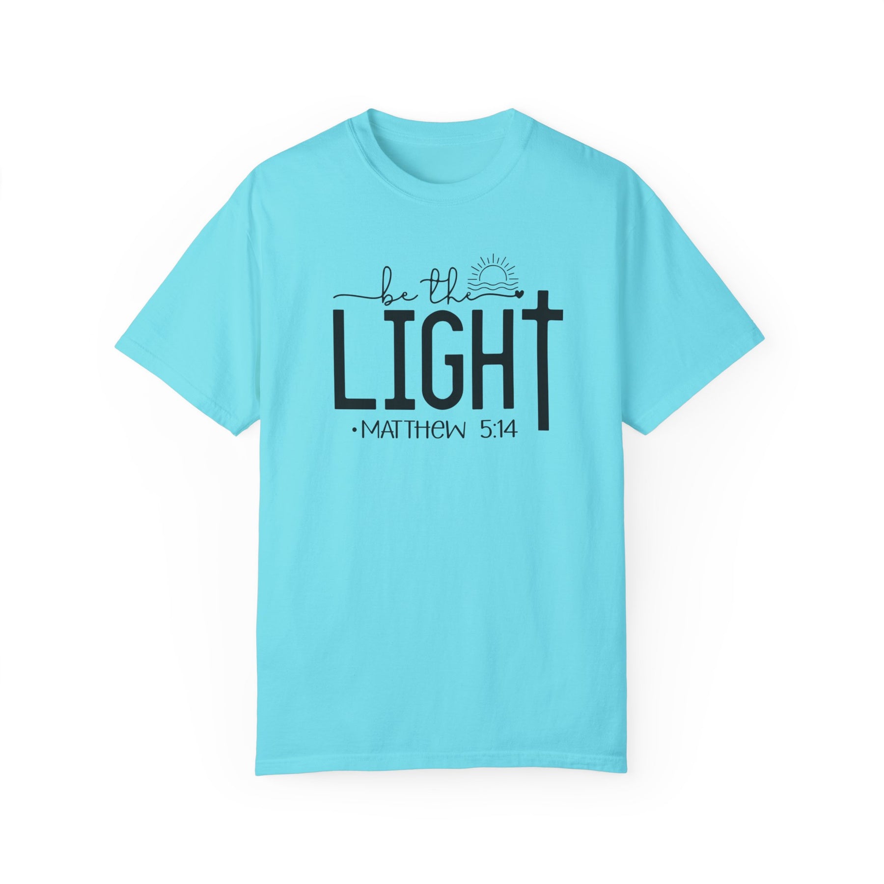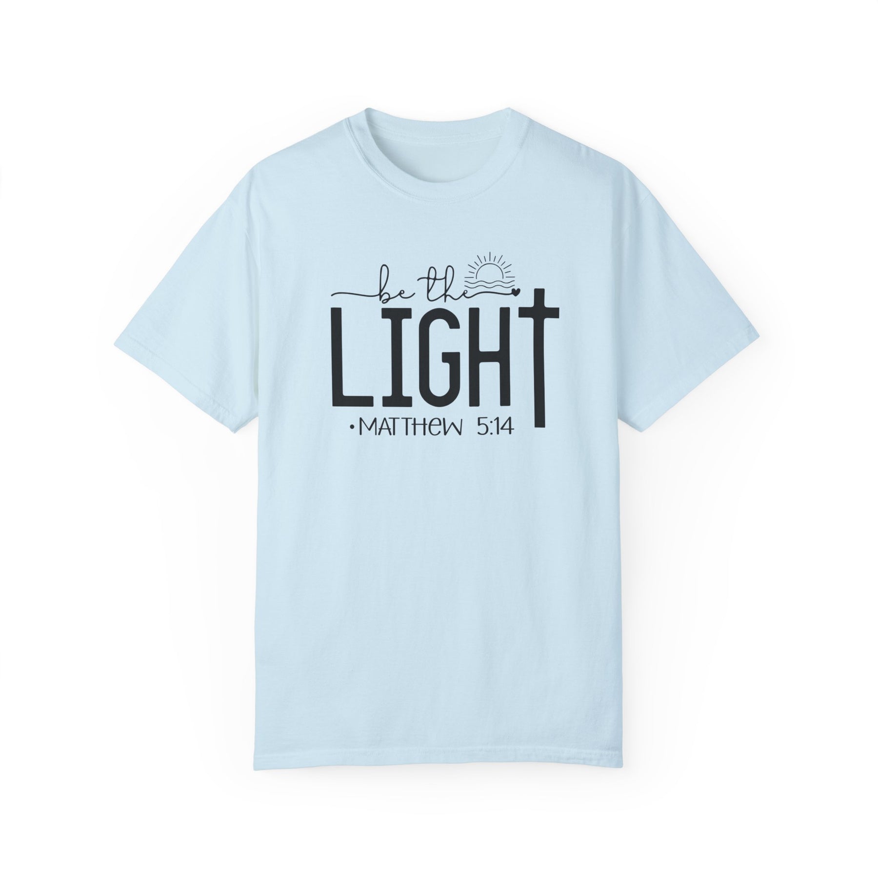 A light blue Be the Light Tee, 100% ring-spun cotton, garment-dyed for coziness. Relaxed fit, double-needle stitching, no side-seams for durability and shape retention.