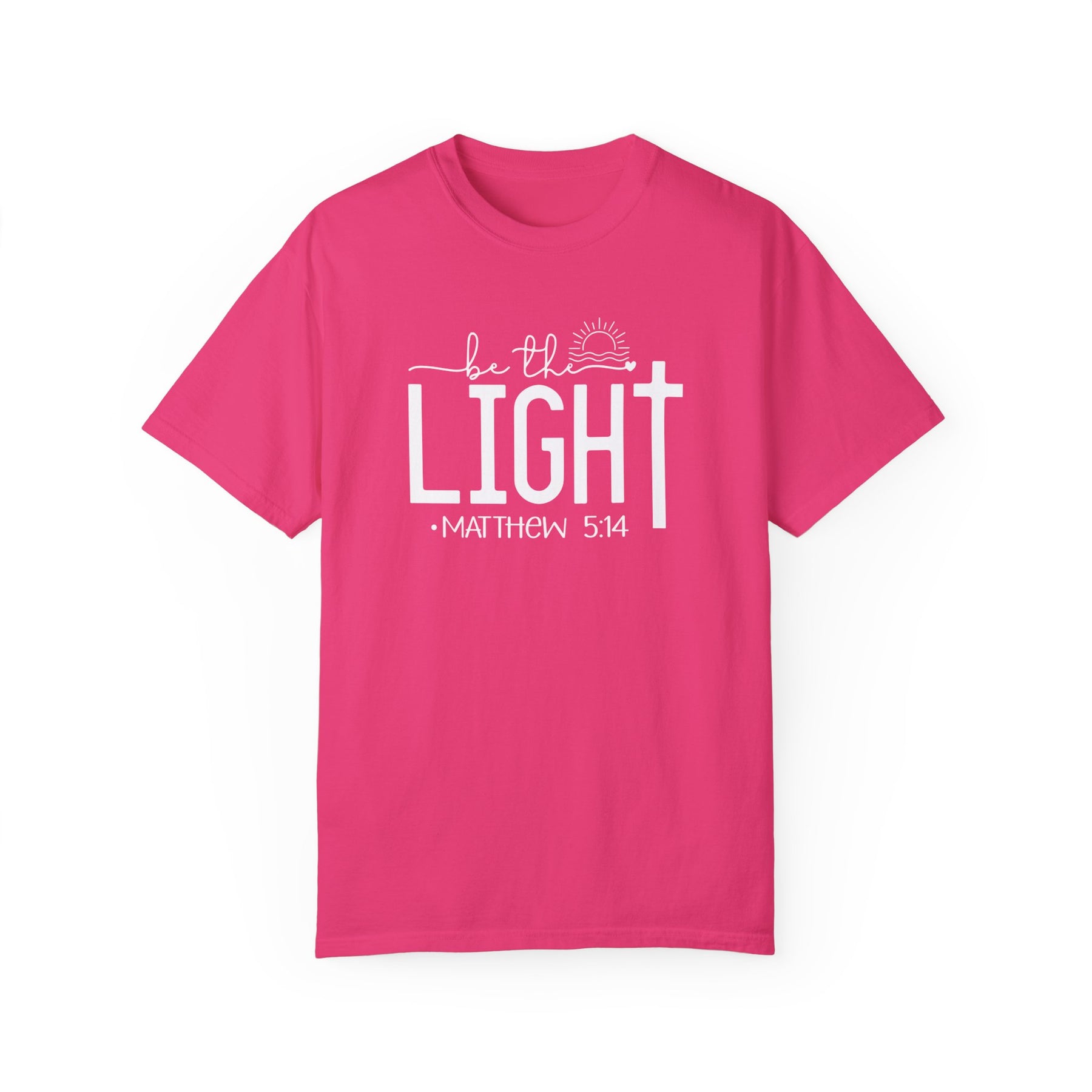 A ring-spun cotton Be the Light Tee in pink with white text. Garment-dyed for coziness, featuring a relaxed fit, double-needle stitching, and no side-seams for durability and shape retention.