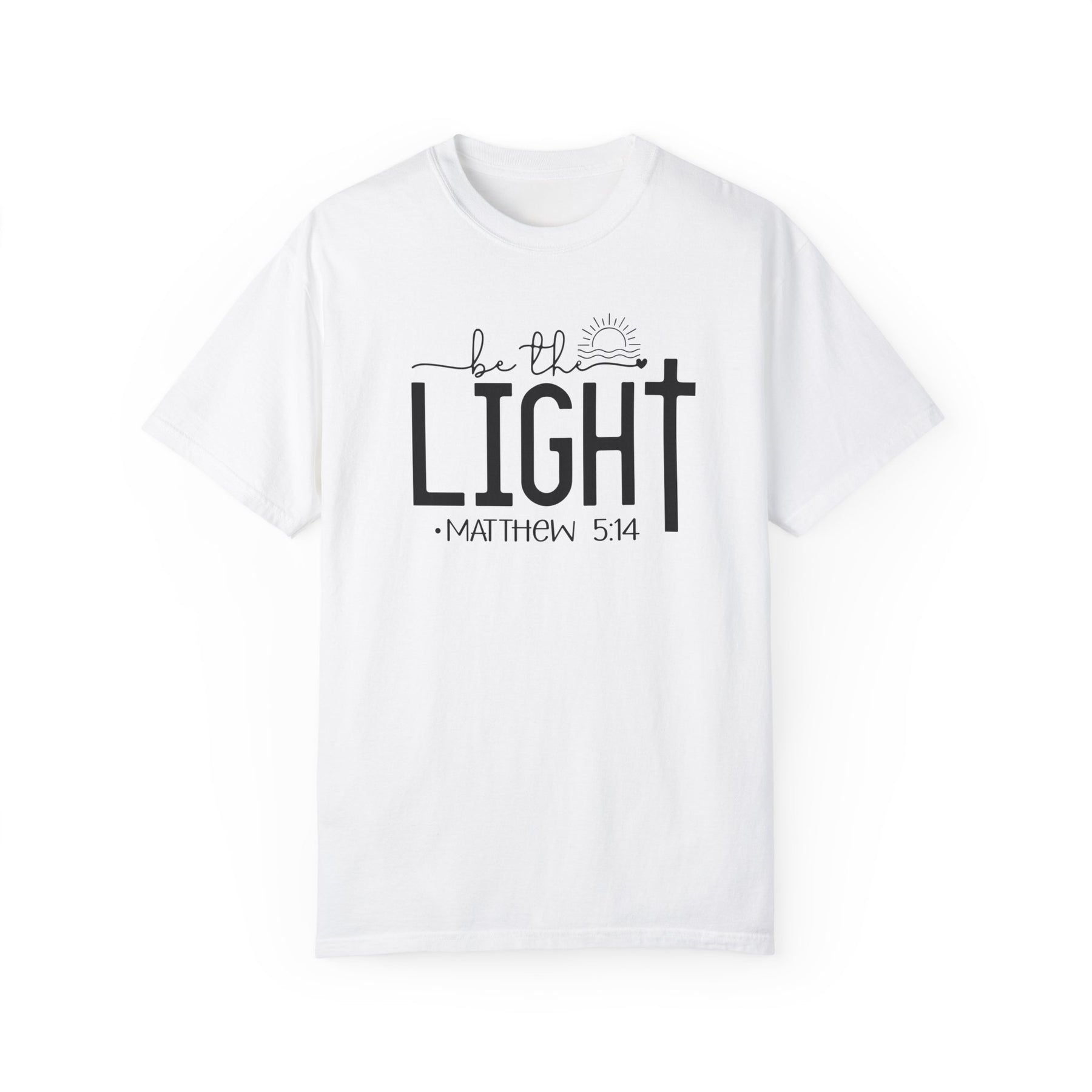 A white Be the Light Tee, crafted from 100% ring-spun cotton. Soft-washed and garment-dyed for coziness, with a relaxed fit and durable double-needle stitching. No side-seams for a sleek silhouette.