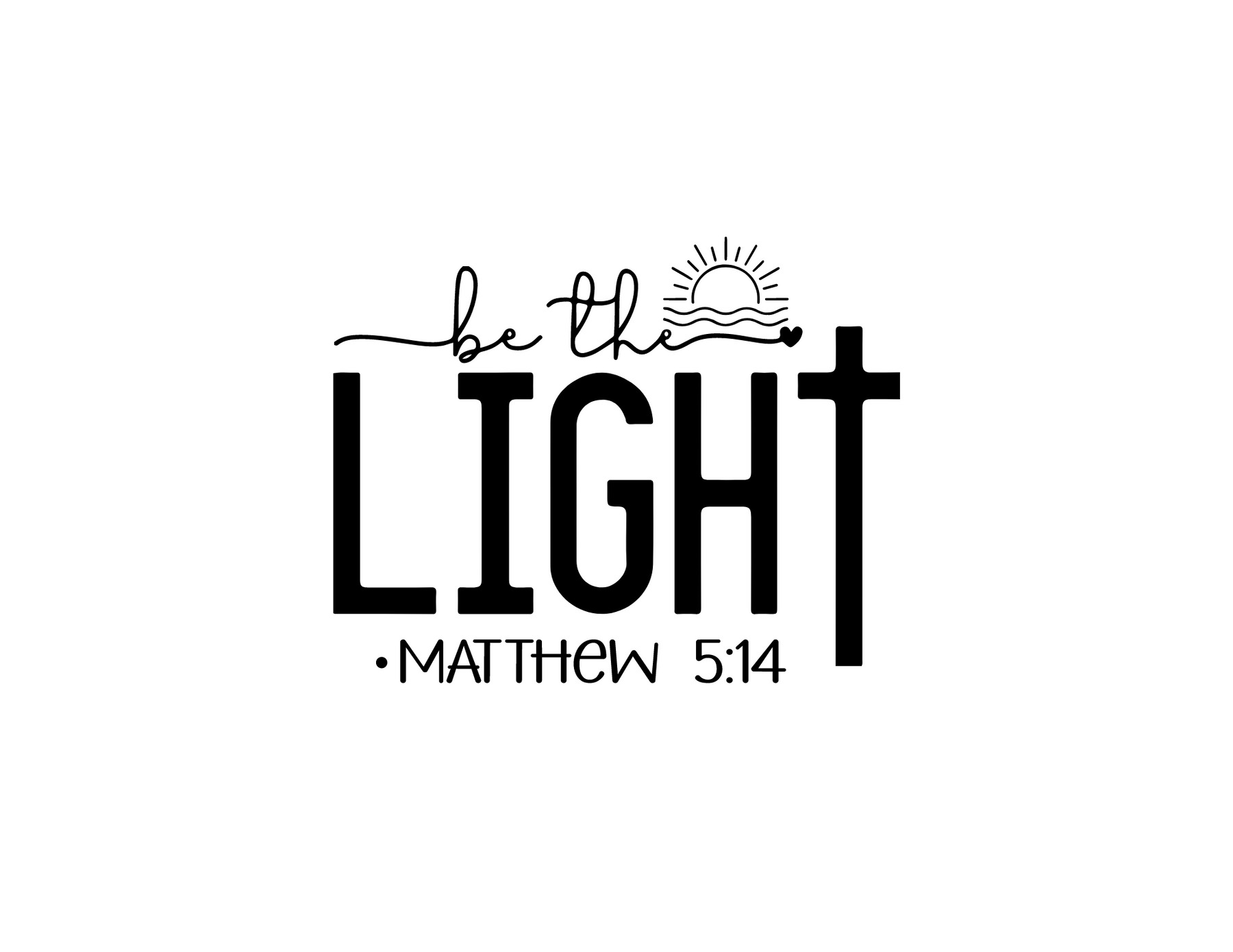 Black text with a sun, waves, and clouds on a white background. Be the Light Tee: 100% ring-spun cotton, medium weight, relaxed fit, durable double-needle stitching, no side-seams.
