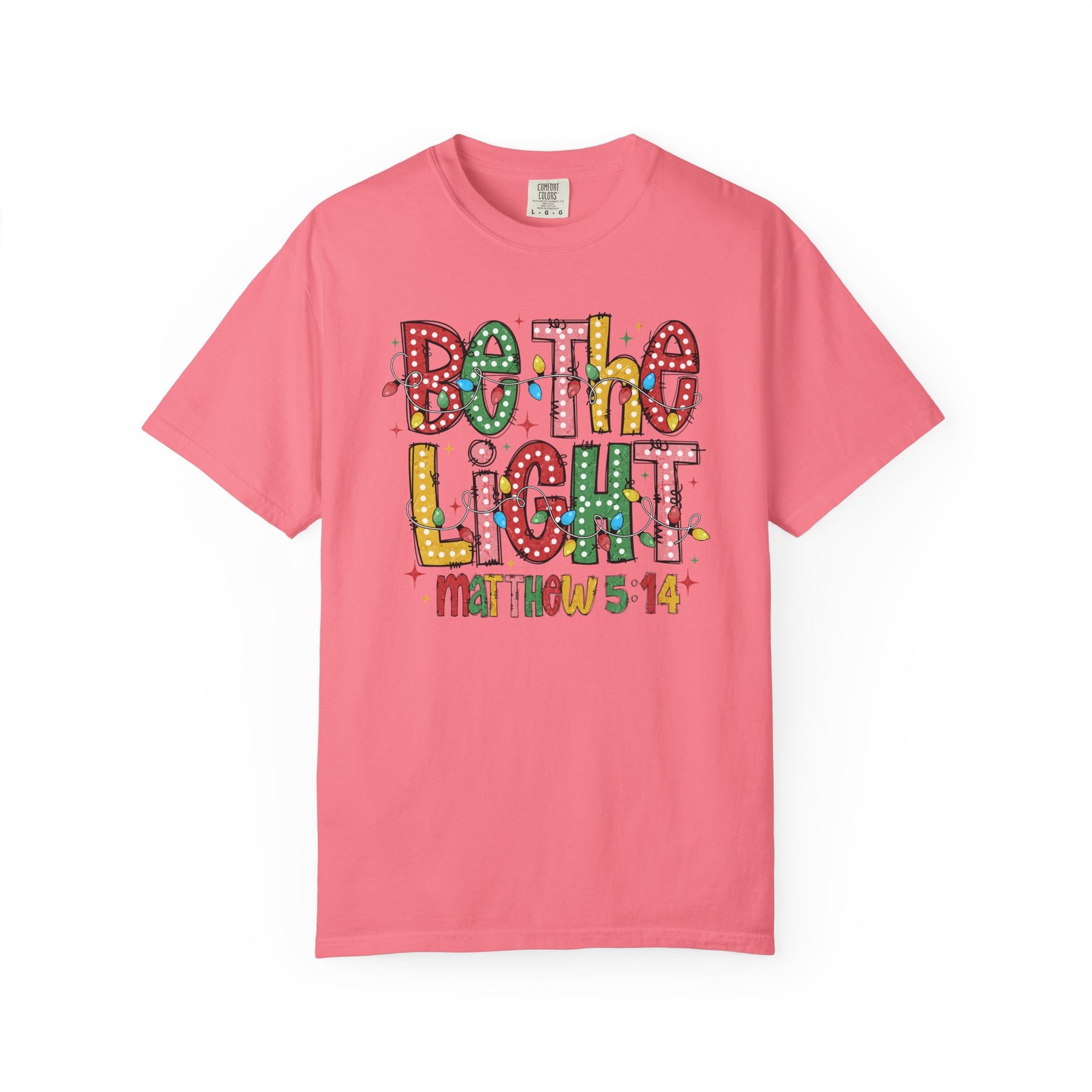 Coral-pink short-sleeve Be the Light T-shirt with festive lettering and Christmas lights design, referencing Matthew 5:14, by Faith Family Designs.