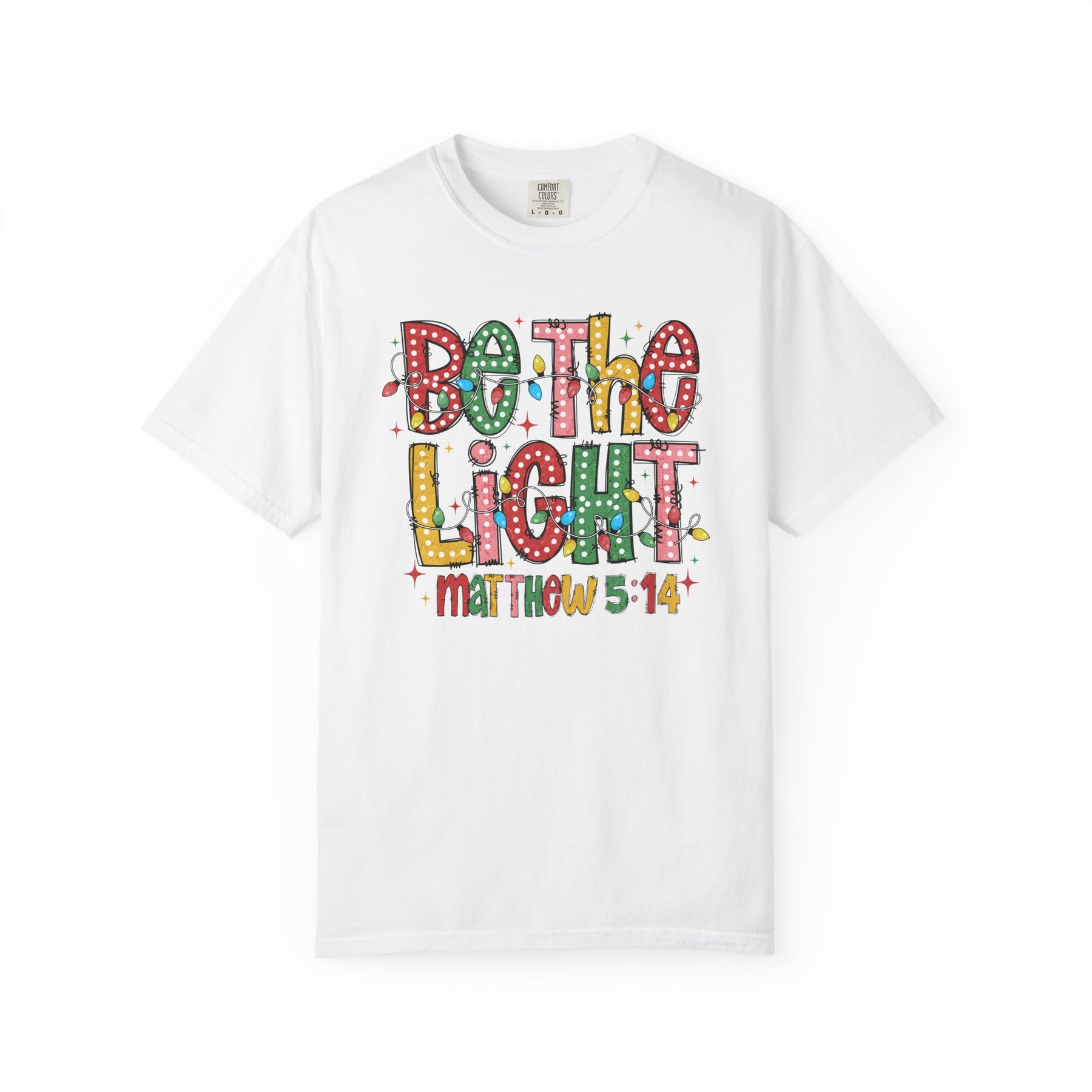 Be the Light Tee featuring Christmas light-themed 'BE THE LIGHT' graphic and 'Matthew 5:14' on a white short-sleeve shirt.