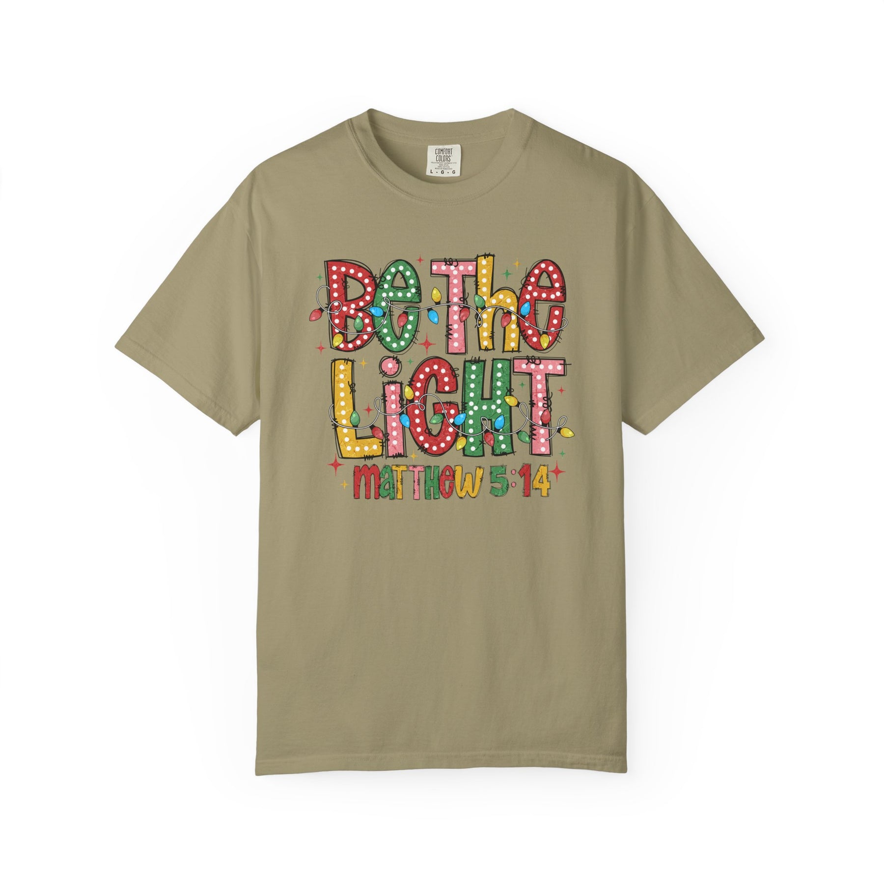 Be the Light Tee featuring Be the Light in multicolored letters and Matthew 5:14, with cartoon string-lights on an olive-green Comfort Colors T-shirt.