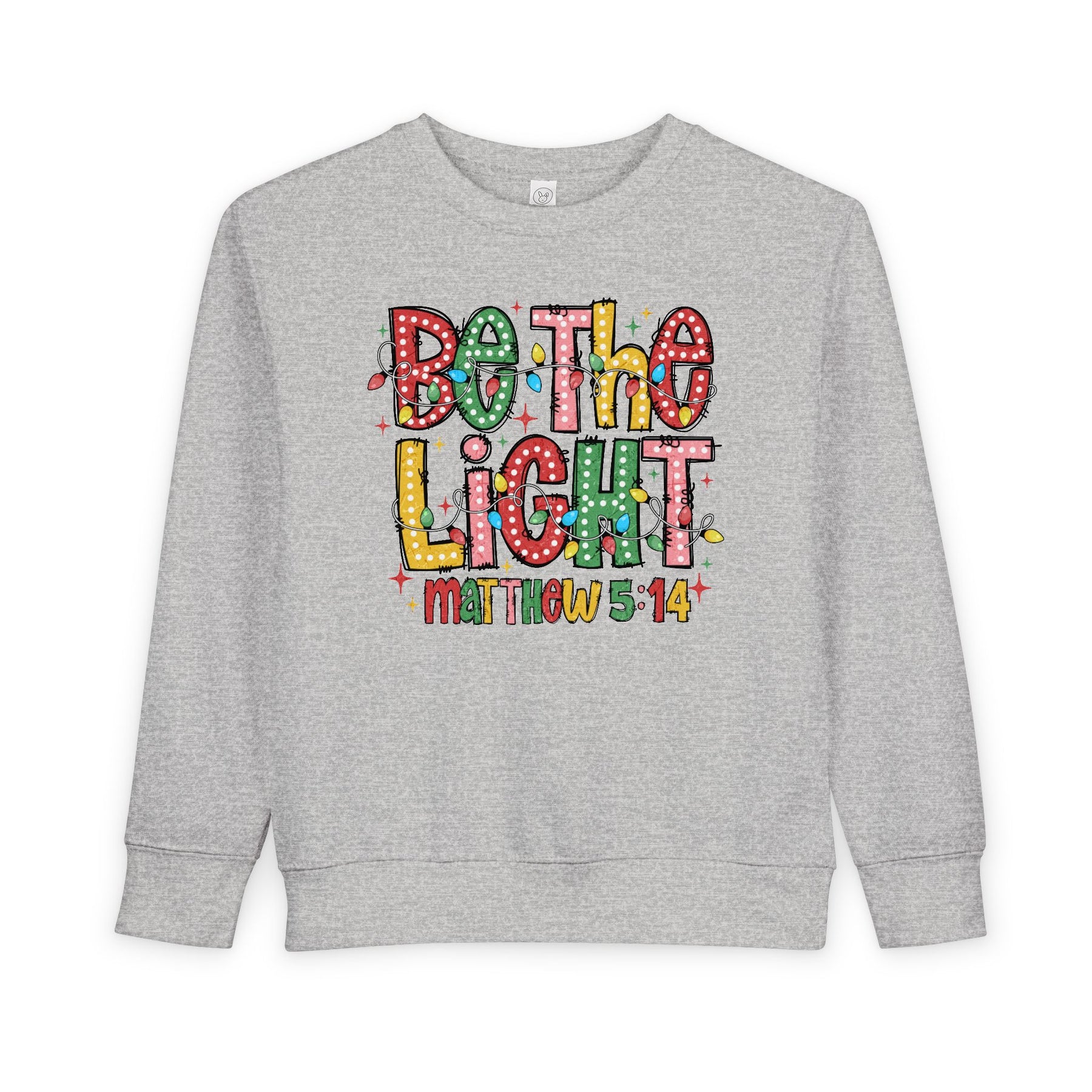 Light-beige toddler sweatshirt with colorful Be the Light graphic resembling Christmas lights, featuring Matthew 5:14 underneath, crafted for warmth and comfort.