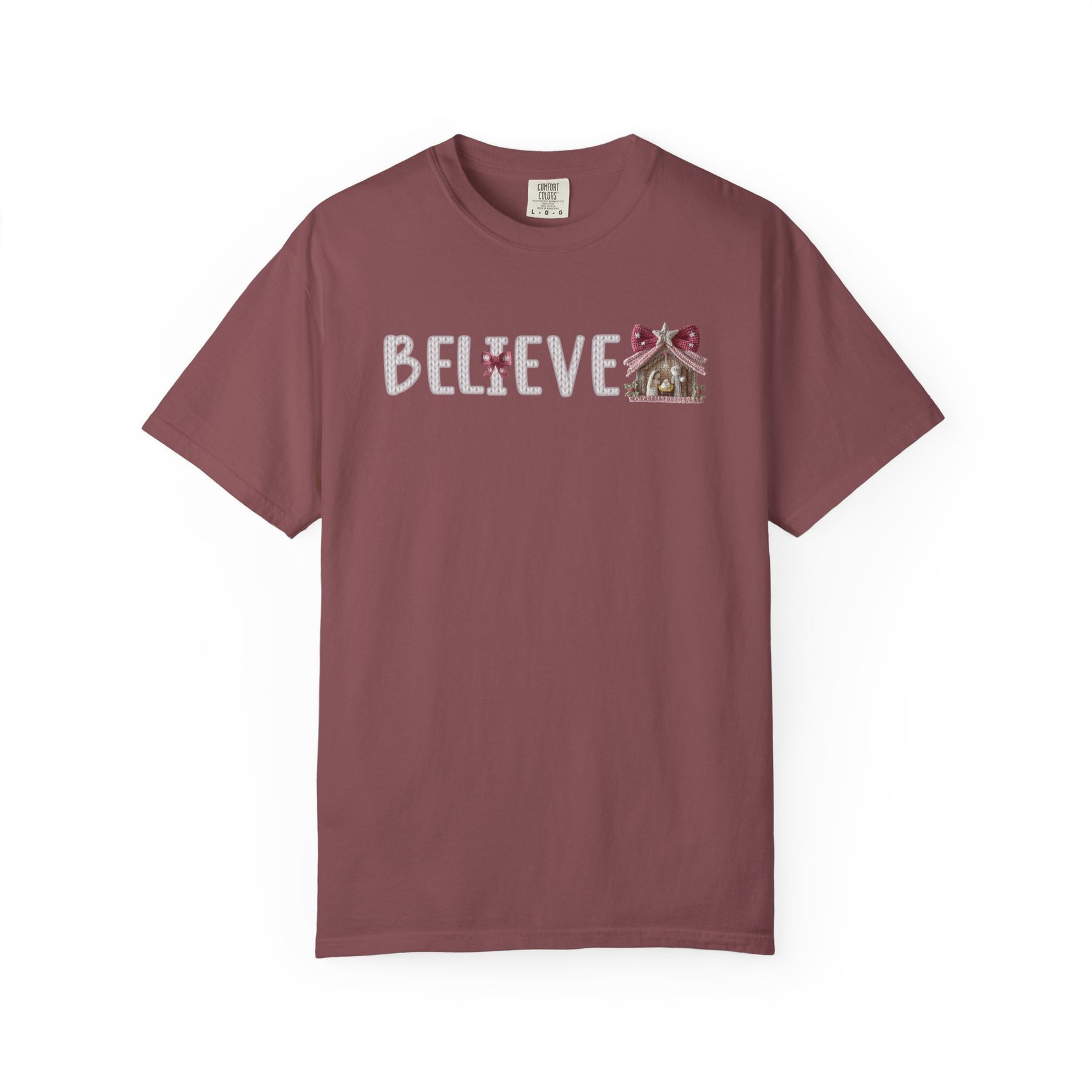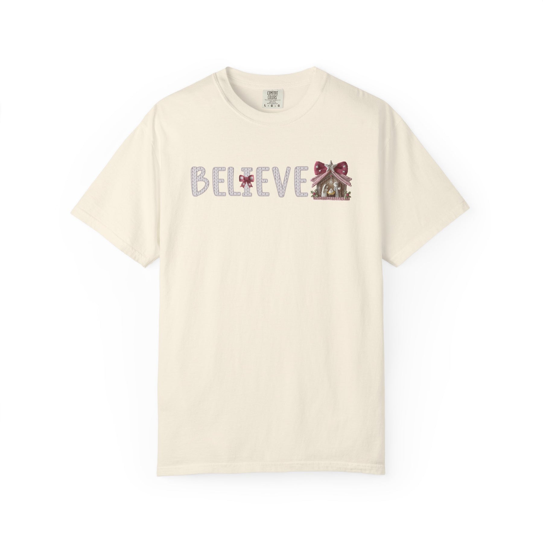 Unisex Believe T-shirt with knitted-look letters and nativity scene, featuring red bows. Classic crew-neck design, perfect for holiday festivities.