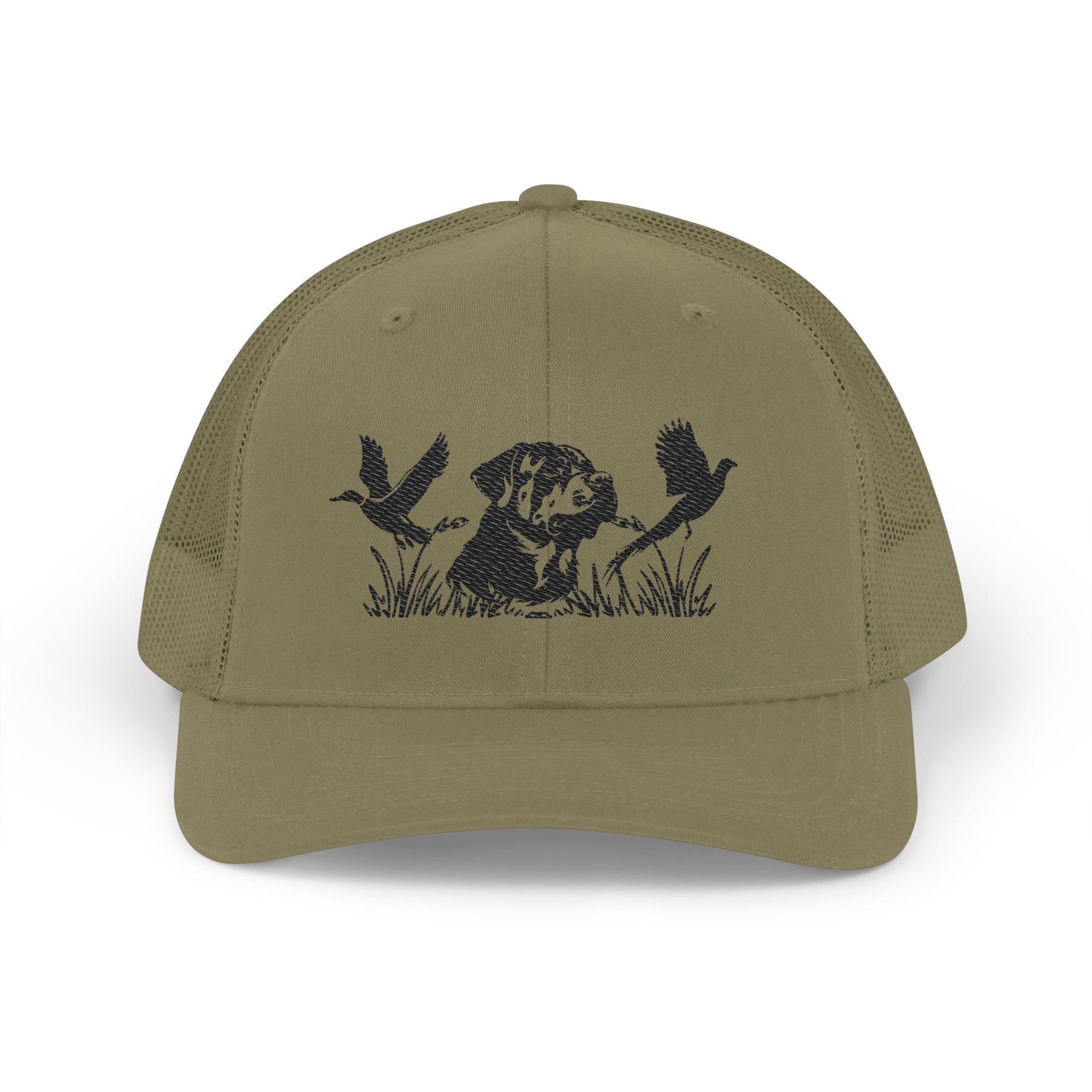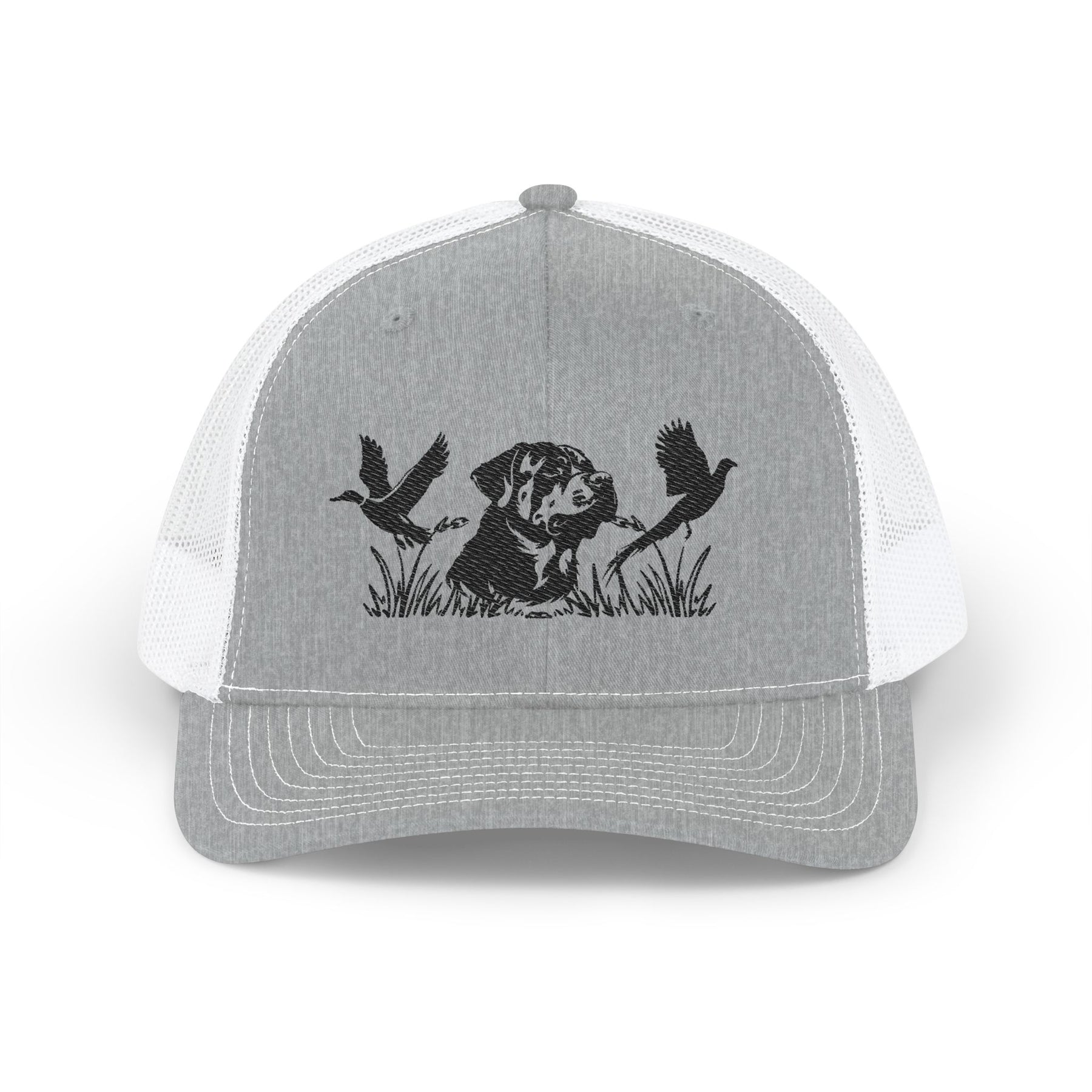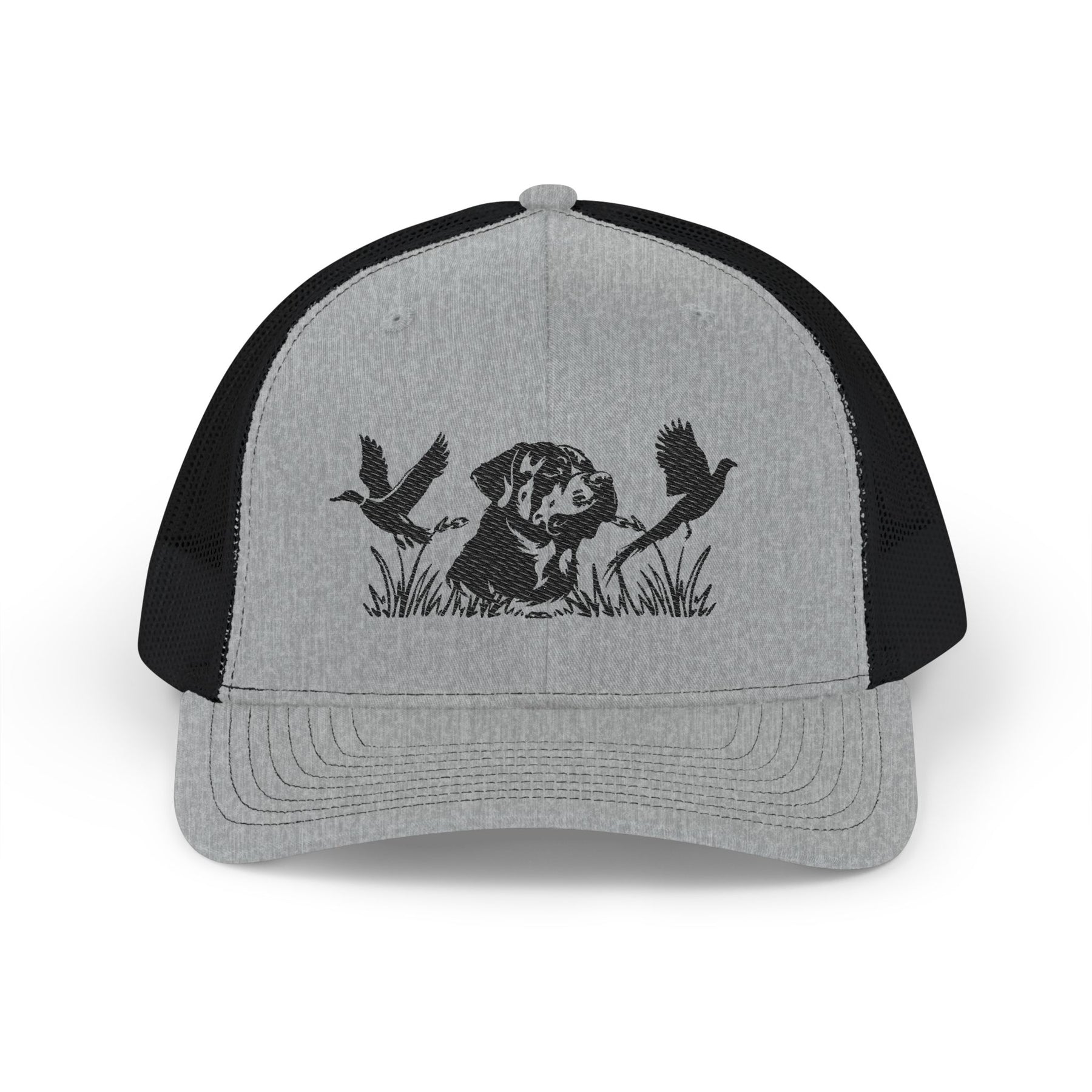 Bird Hunting Snapback Trucker Cap features an embroidered hunting dog and game birds, offering a stylish, breathable fit with a classic 6-panel design and adjustable snap closure.