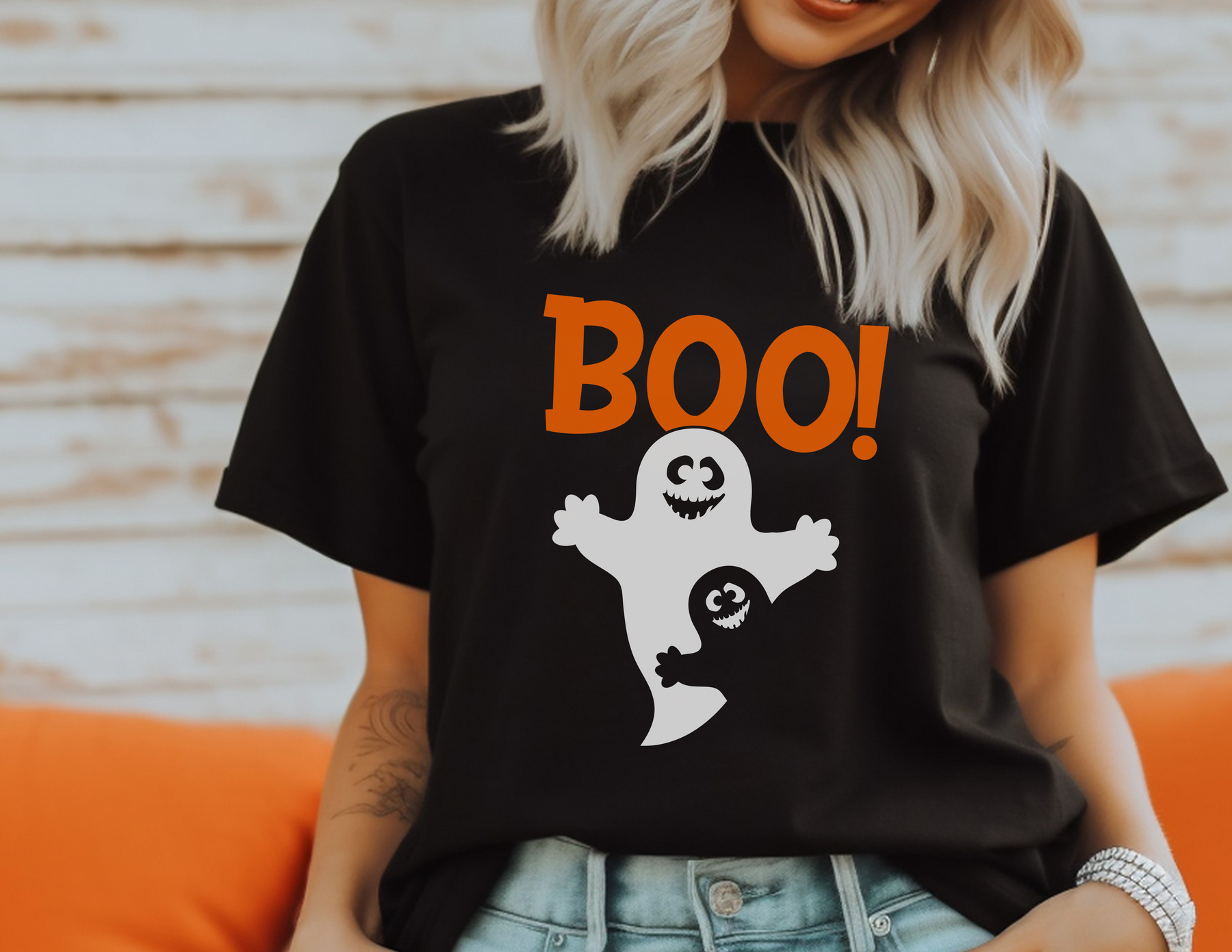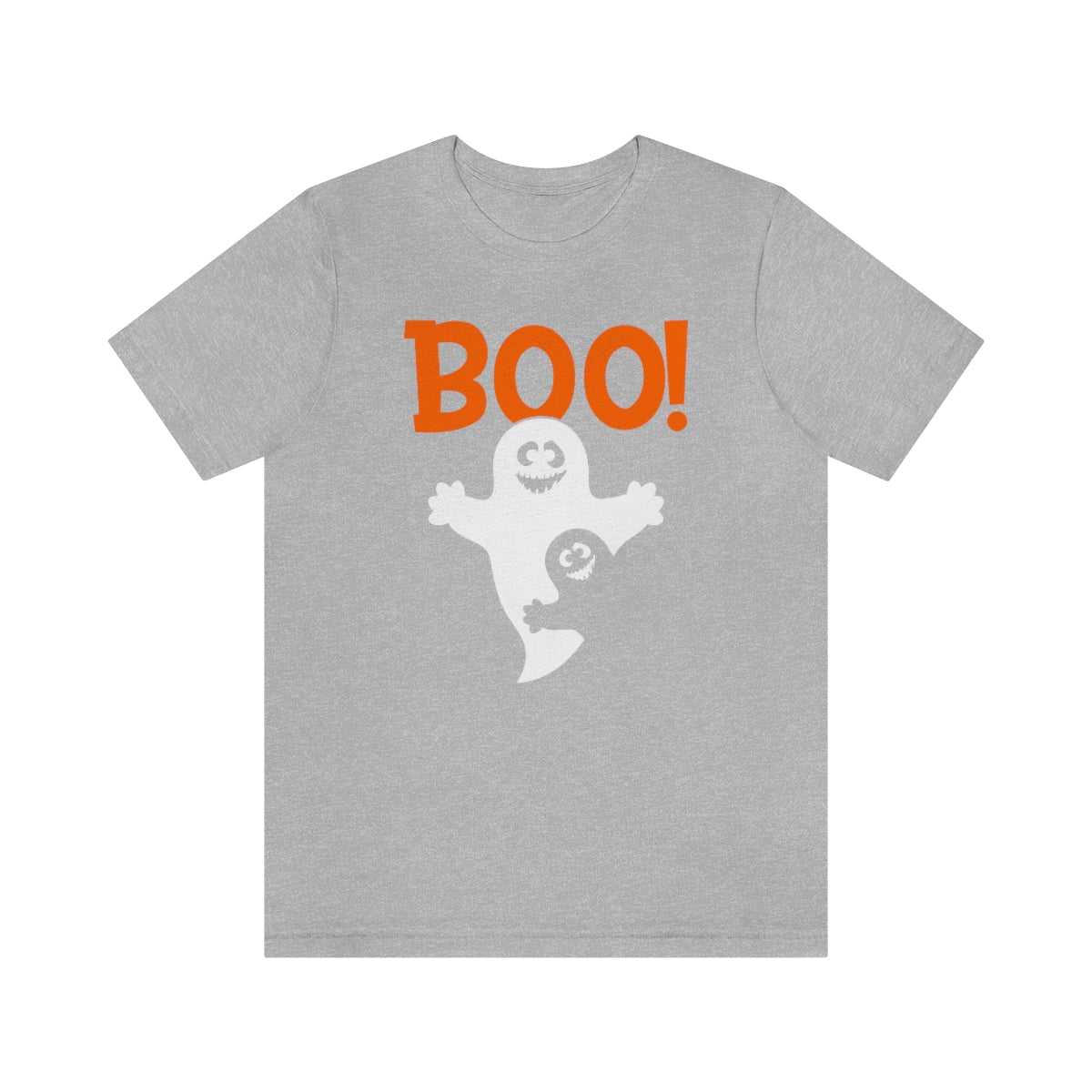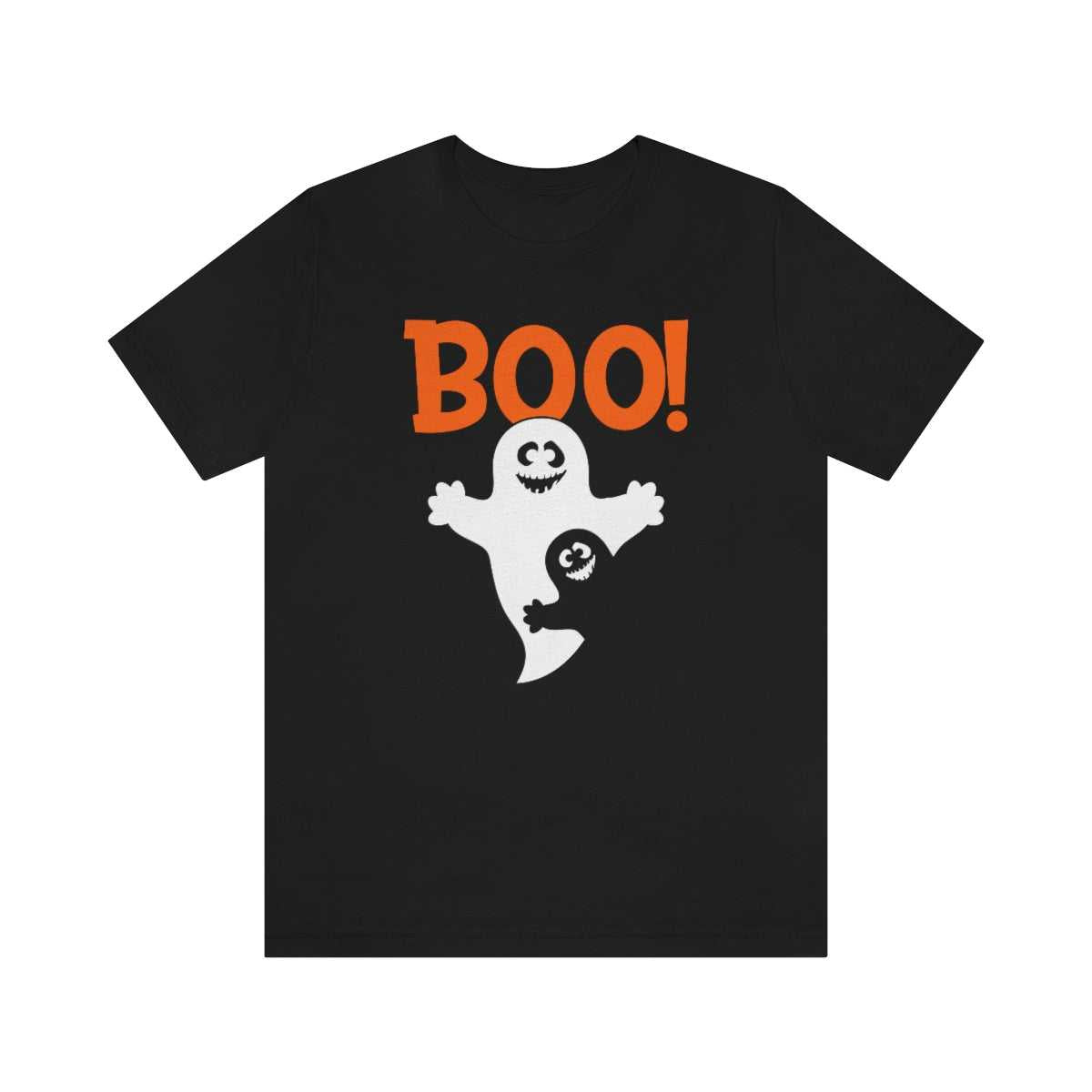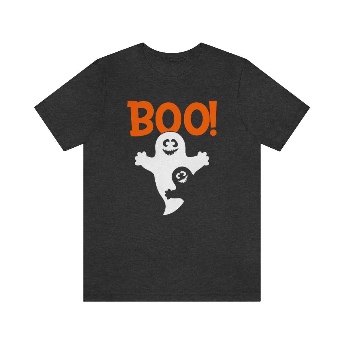A unisex jersey tee featuring a ghost design, the Boo Tee. Made of soft cotton with ribbed knit collars, taping on shoulders, and dual side seams for durability. From Worlds Worst Tees.