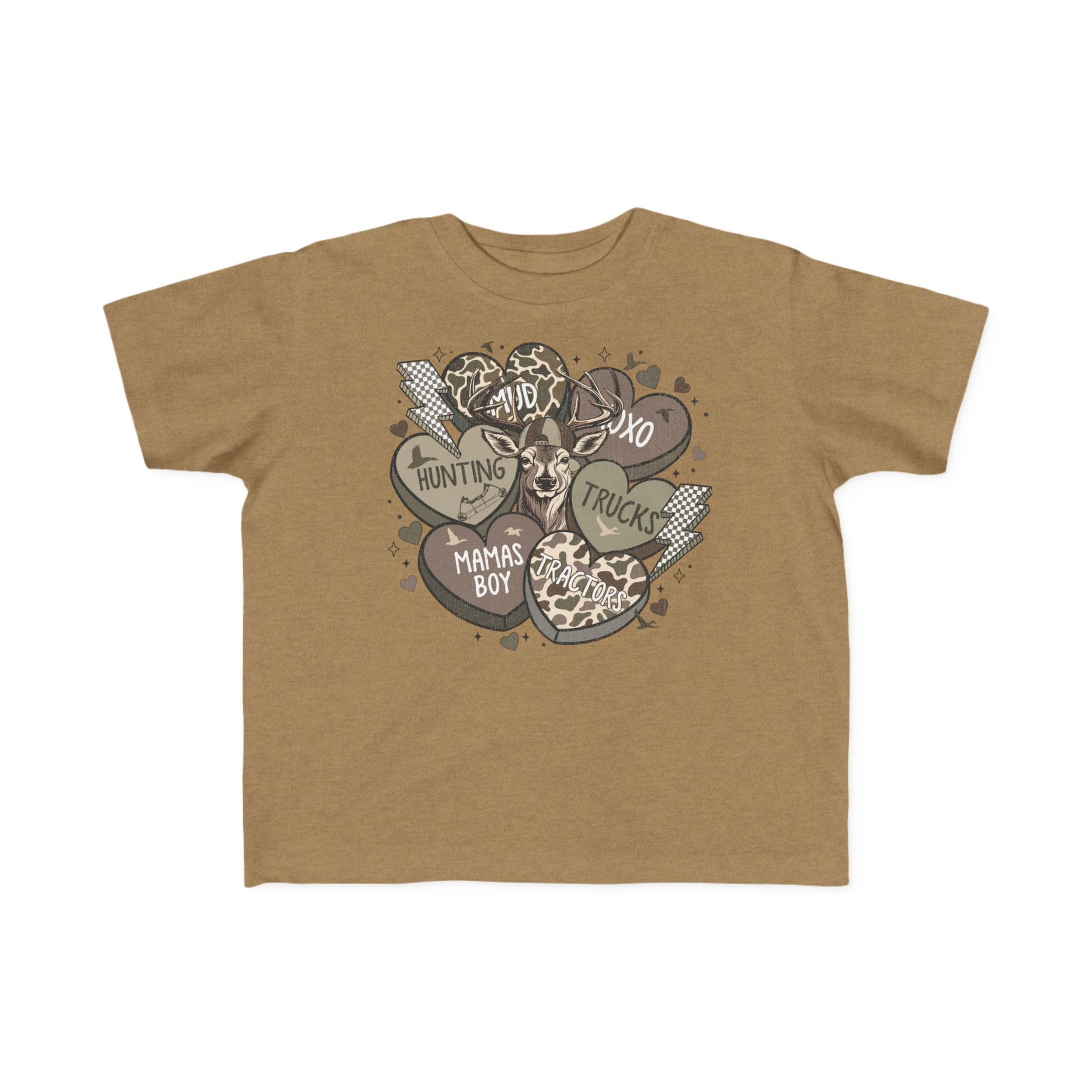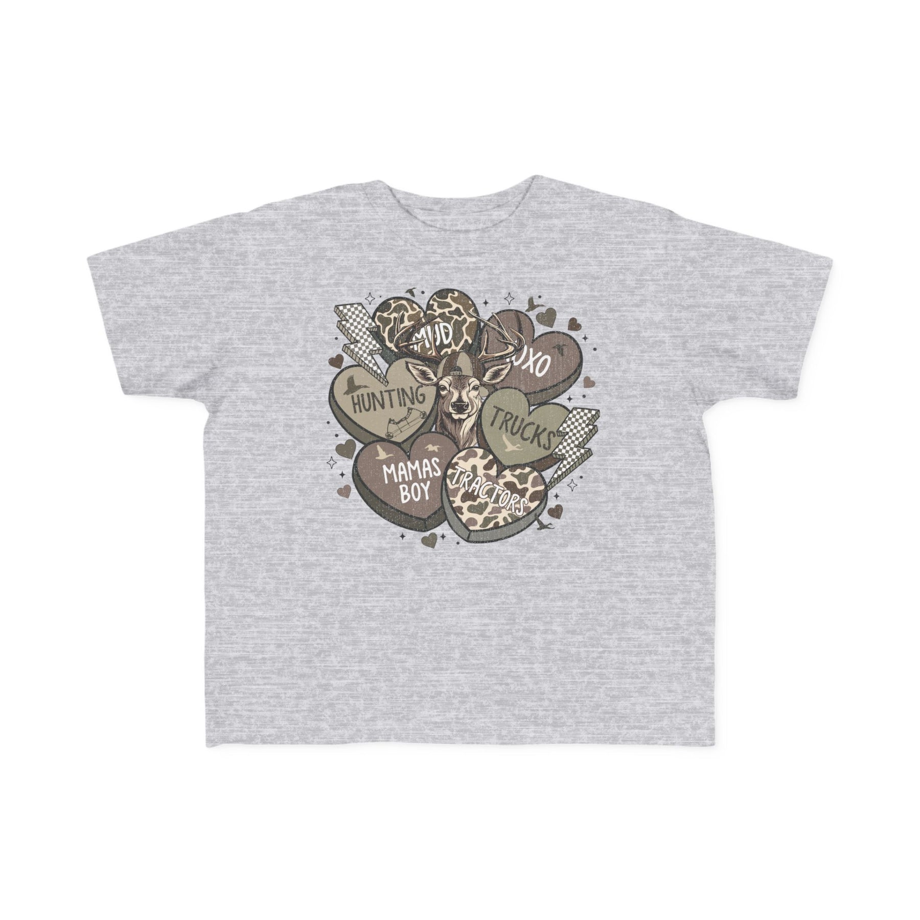Boy Valentine Toddler Tee features a deer head with six earth-tone hearts labeled Hunting, Mud, XOXO, Trucks, Mama's Boy, Tractors, perfect for toddlers.