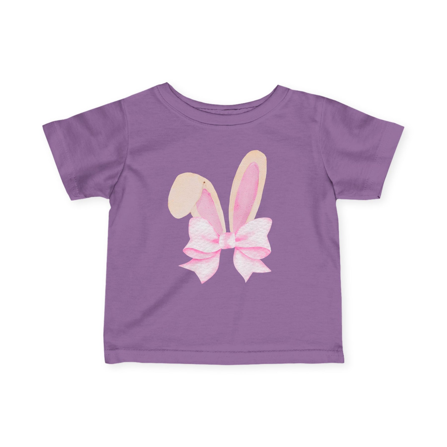 Bunny Bow Baby Tee: Toddler-sized purple T-shirt featuring watercolor bunny ears with a pink bow, crafted from soft, durable cotton for comfort and fit.