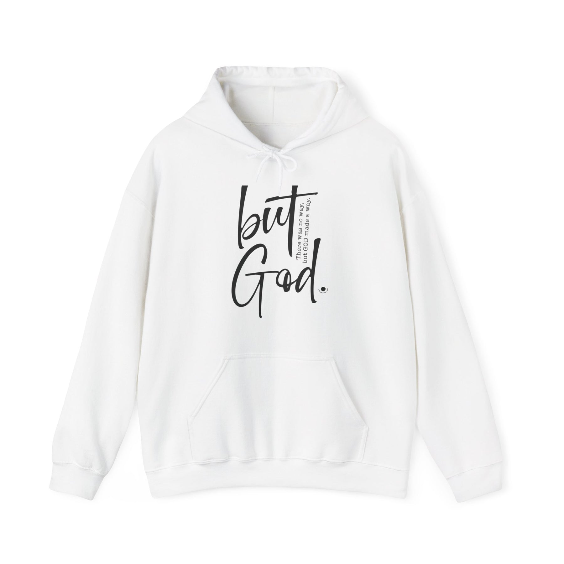 A cozy unisex heavy blend hooded sweatshirt, the But God Hoodie by Worlds Worst Tees. Made of 50% cotton and 50% polyester, featuring a kangaroo pocket and color-matching drawstring. Classic fit, tear-away label, and medium-heavy fabric.