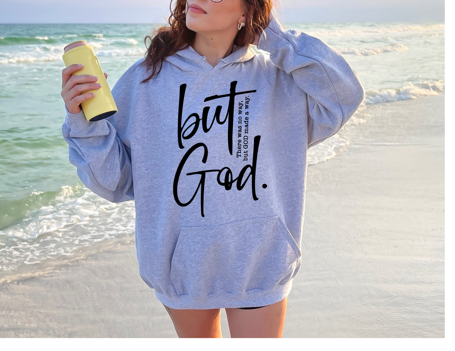 A cozy unisex But God Hoodie, blending cotton and polyester for warmth. Features a kangaroo pocket and matching drawstring hood for style. Ideal for chilly days. Classic fit, tear-away label, true to size.
