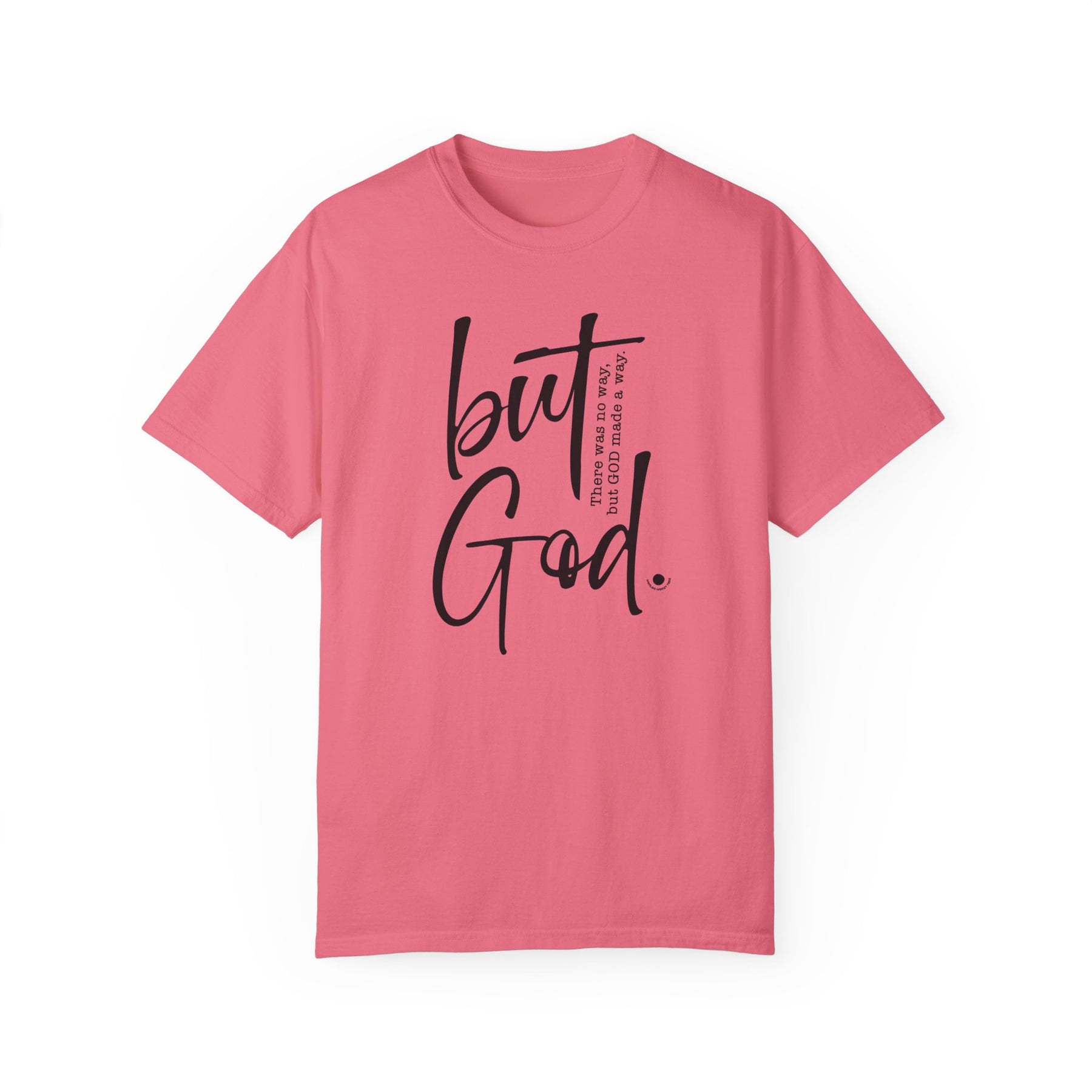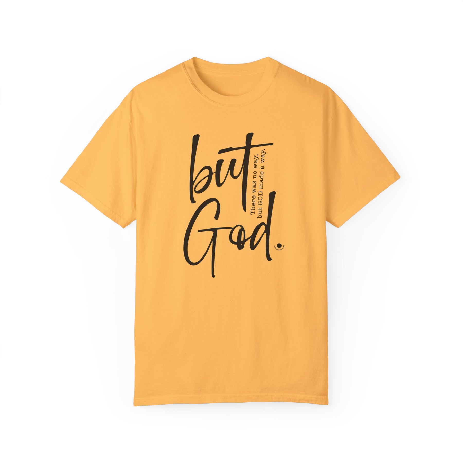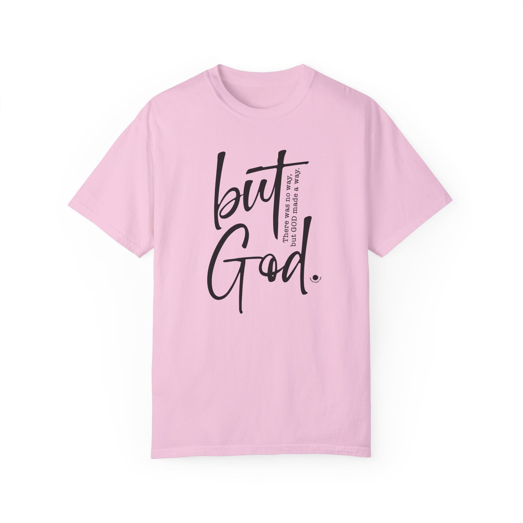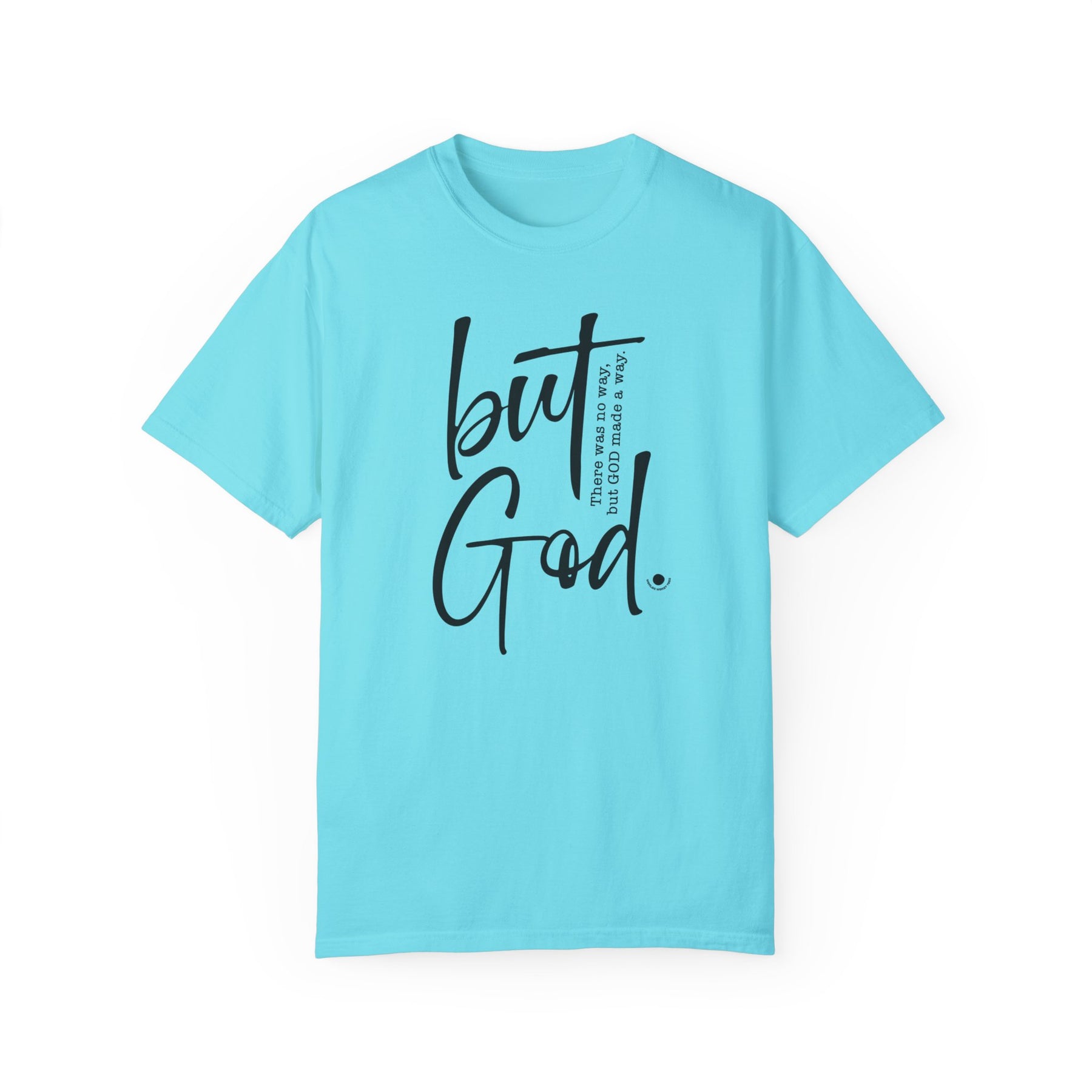 Relaxed fit But God Tee, medium weight, 100% ring-spun cotton. Garment-dyed for coziness, durable double-needle stitching, tubular shape. Sizes: S, M, L, XL, 2XL, 3XL.