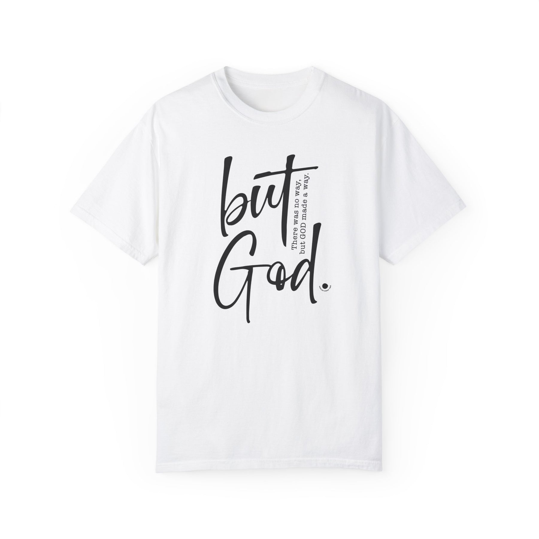 A black and white But God Tee design on a soft, ring-spun cotton t-shirt. Relaxed fit, double-needle stitching, and seamless sides for durability and comfort. Ideal for daily wear.