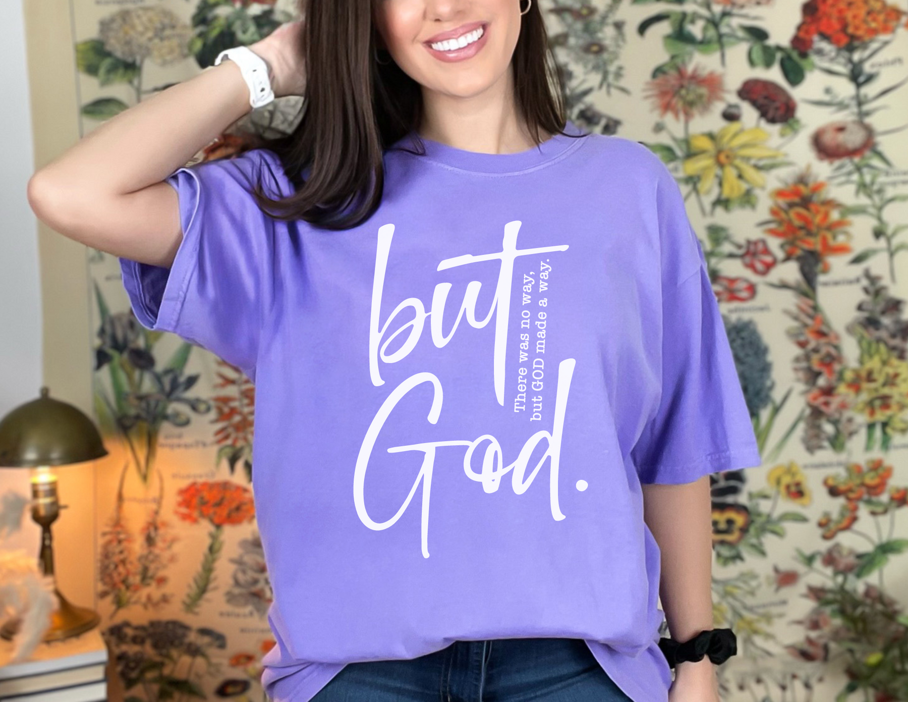 A relaxed fit But God Tee in ring-spun cotton, featuring a woman smiling with her hand on her head. Garment-dyed for coziness, with double-needle stitching for durability. Ideal for daily wear.