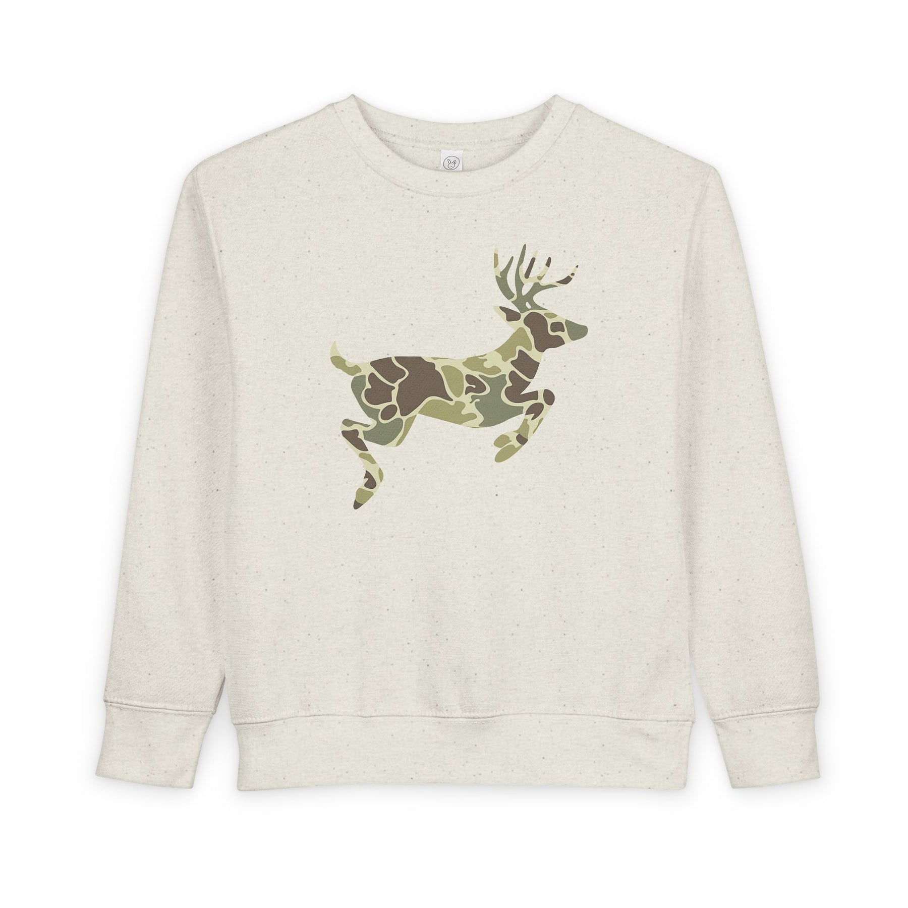 Camo Deer Toddler Crew: Light-beige sweatshirt featuring a green and brown camouflage deer silhouette, crafted for warmth and durability with a soft cotton-polyester blend.