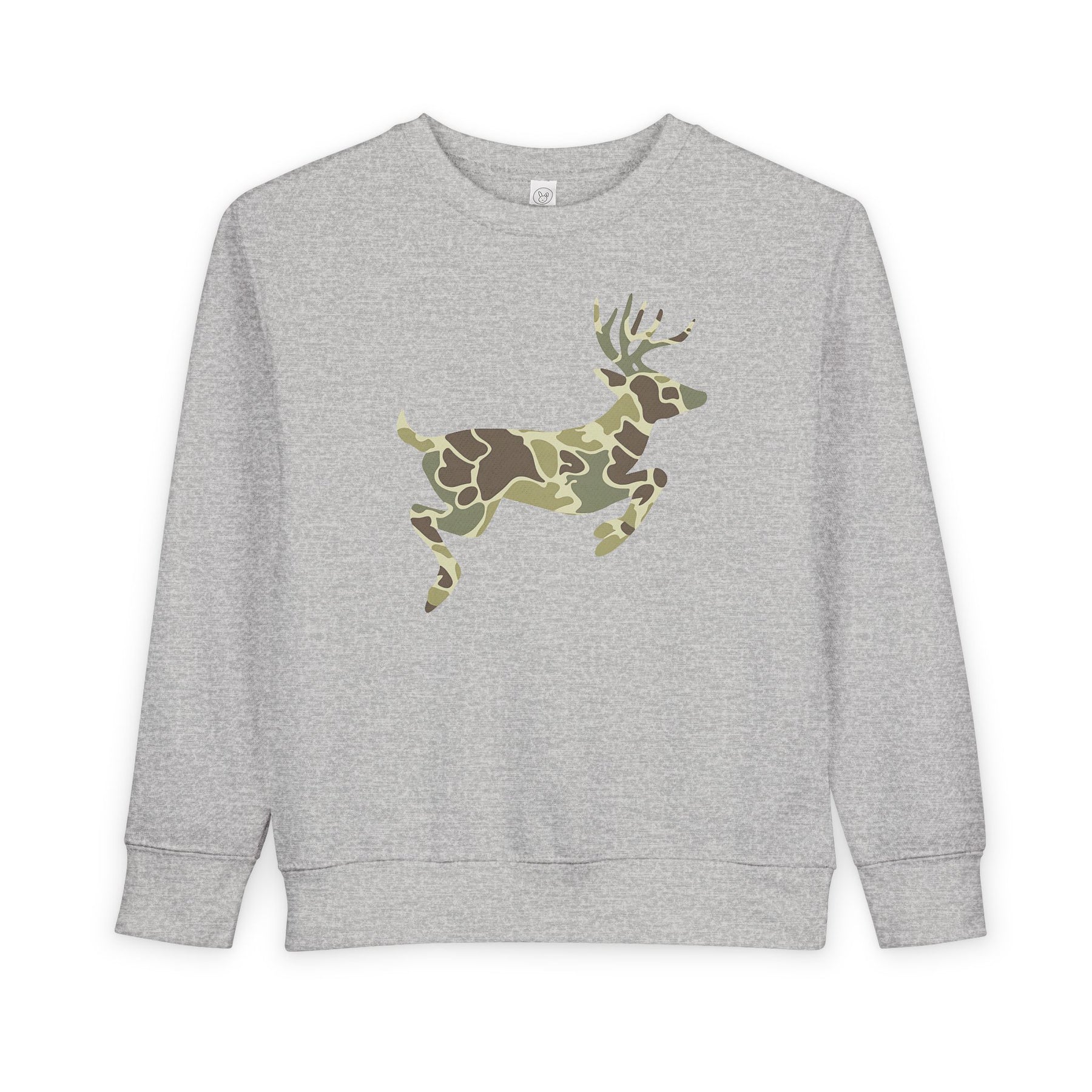 Camo Deer Toddler Crew: Light-gray sweatshirt featuring a camouflage-patterned deer silhouette, perfect for cozy comfort with ribbed cuffs and waistband for toddlers.