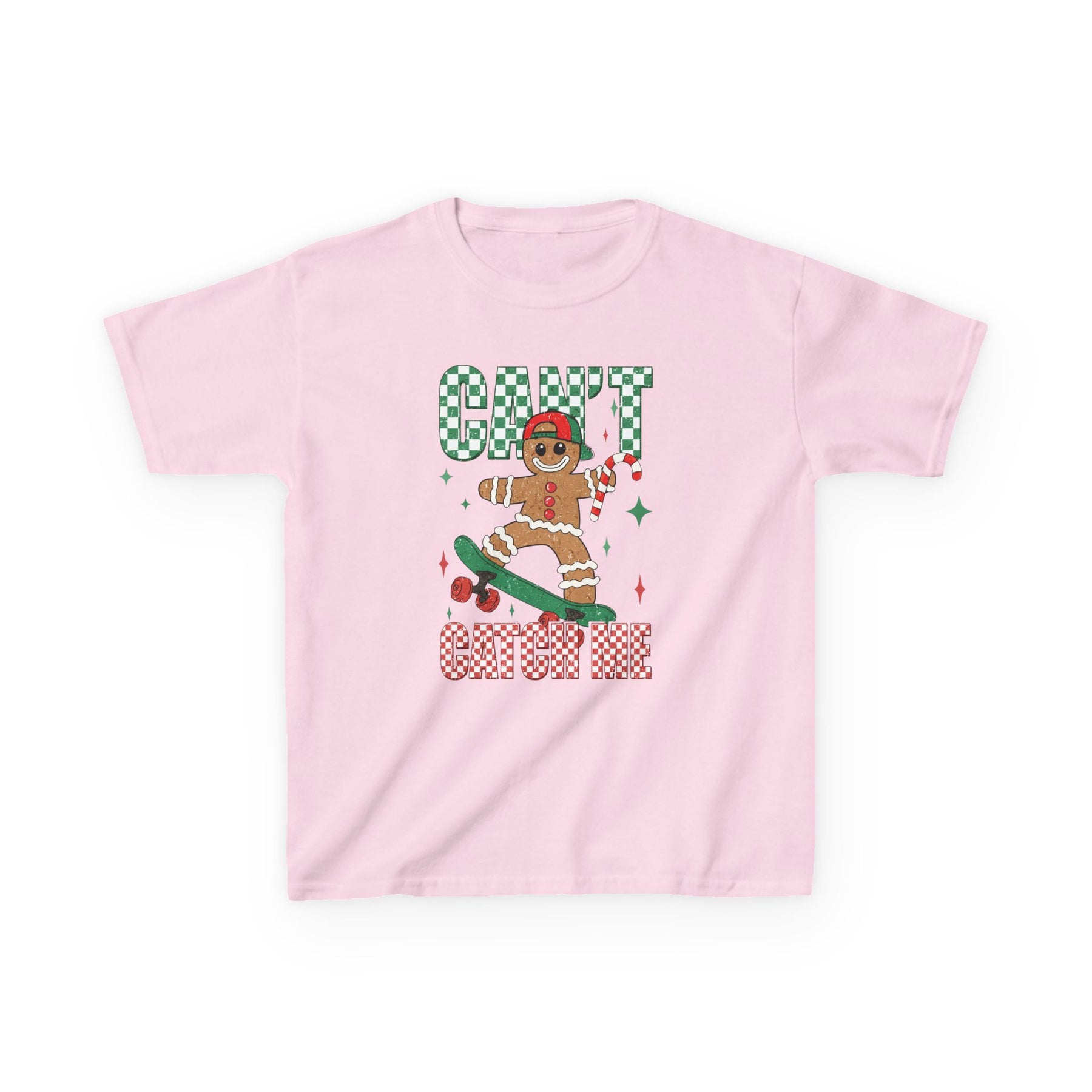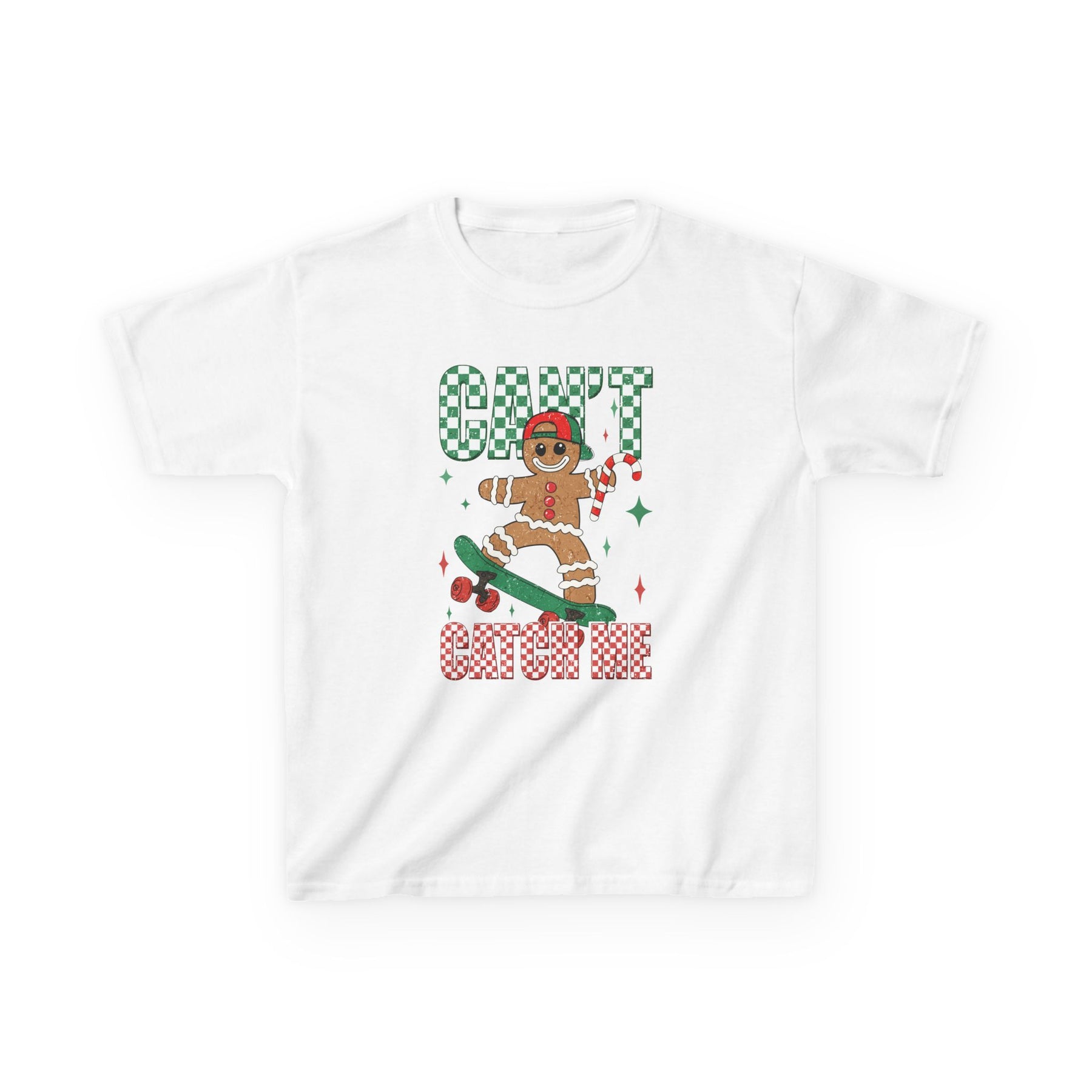 Can't Catch Me Kids Tee features a gingerbread cookie on a skateboard with holiday-themed lettering, offering a festive, durable, and comfortable design for everyday wear.