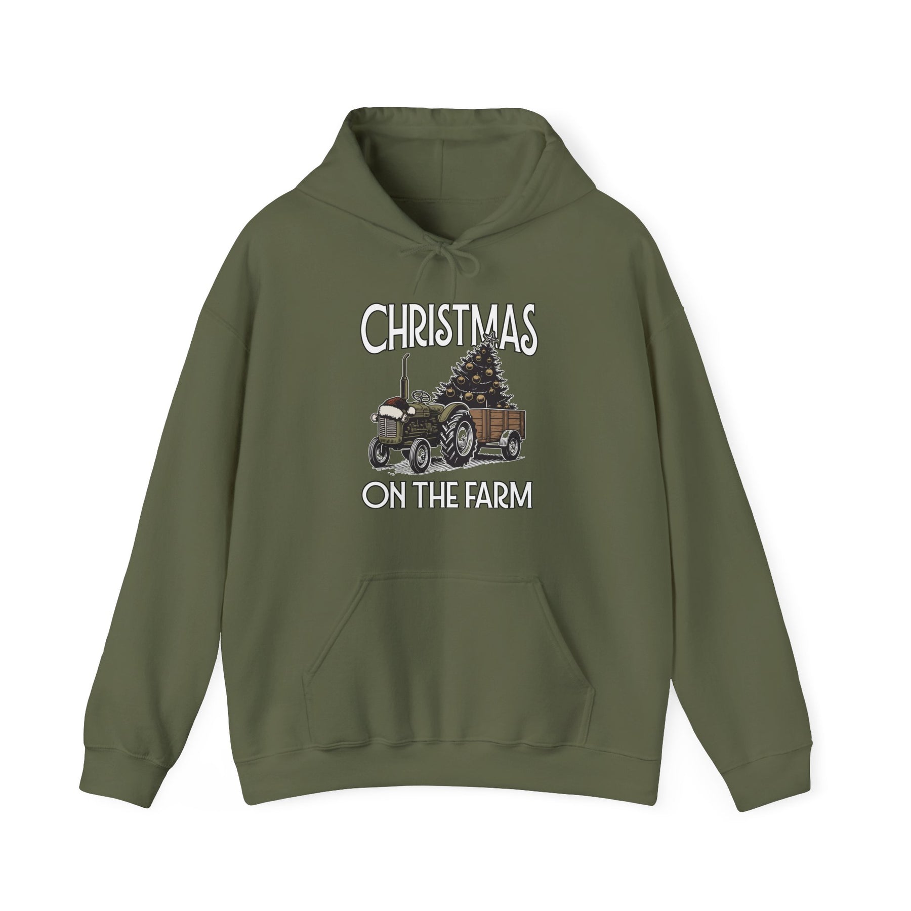 Christmas at the Farm Hoodie featuring a festive tractor and Christmas tree graphic, ideal for warmth and style in cold weather.