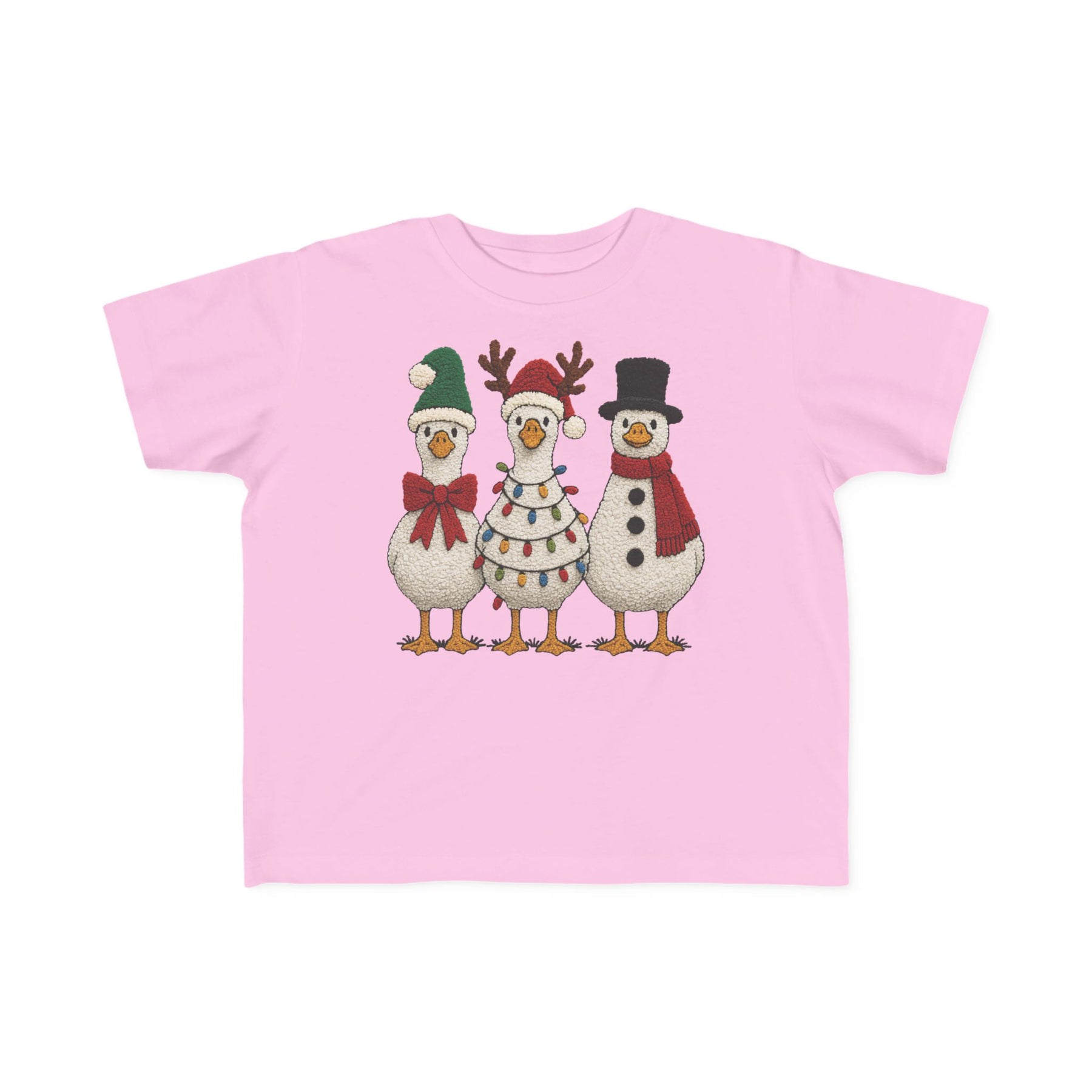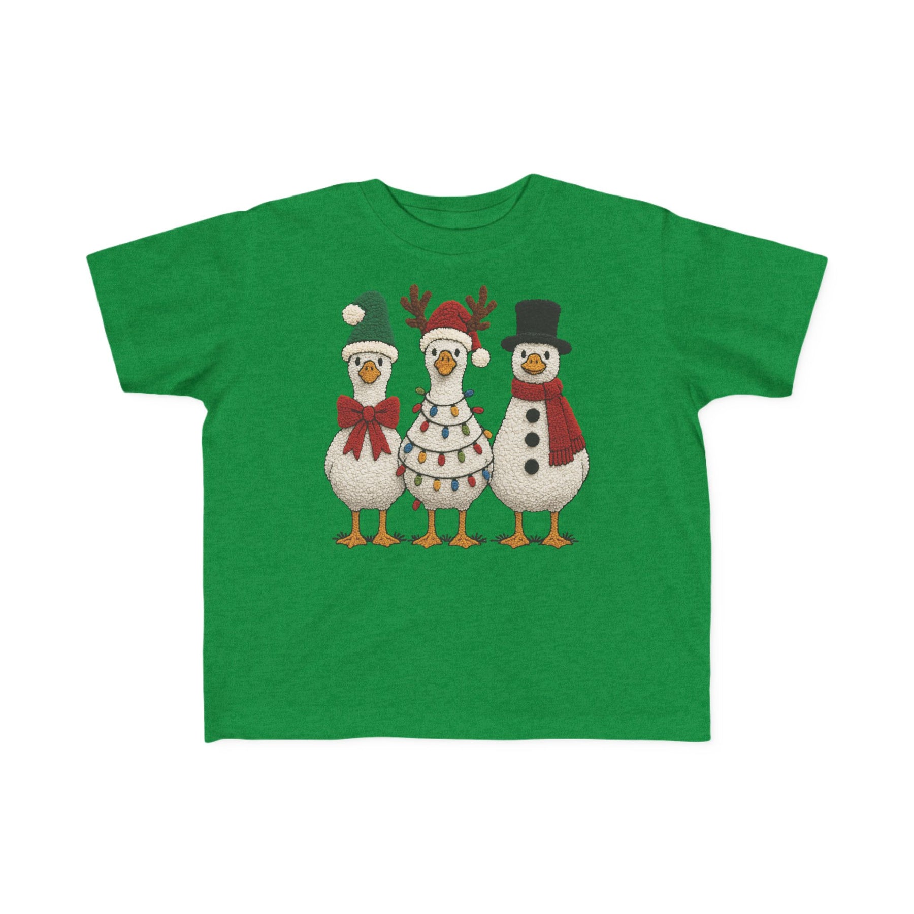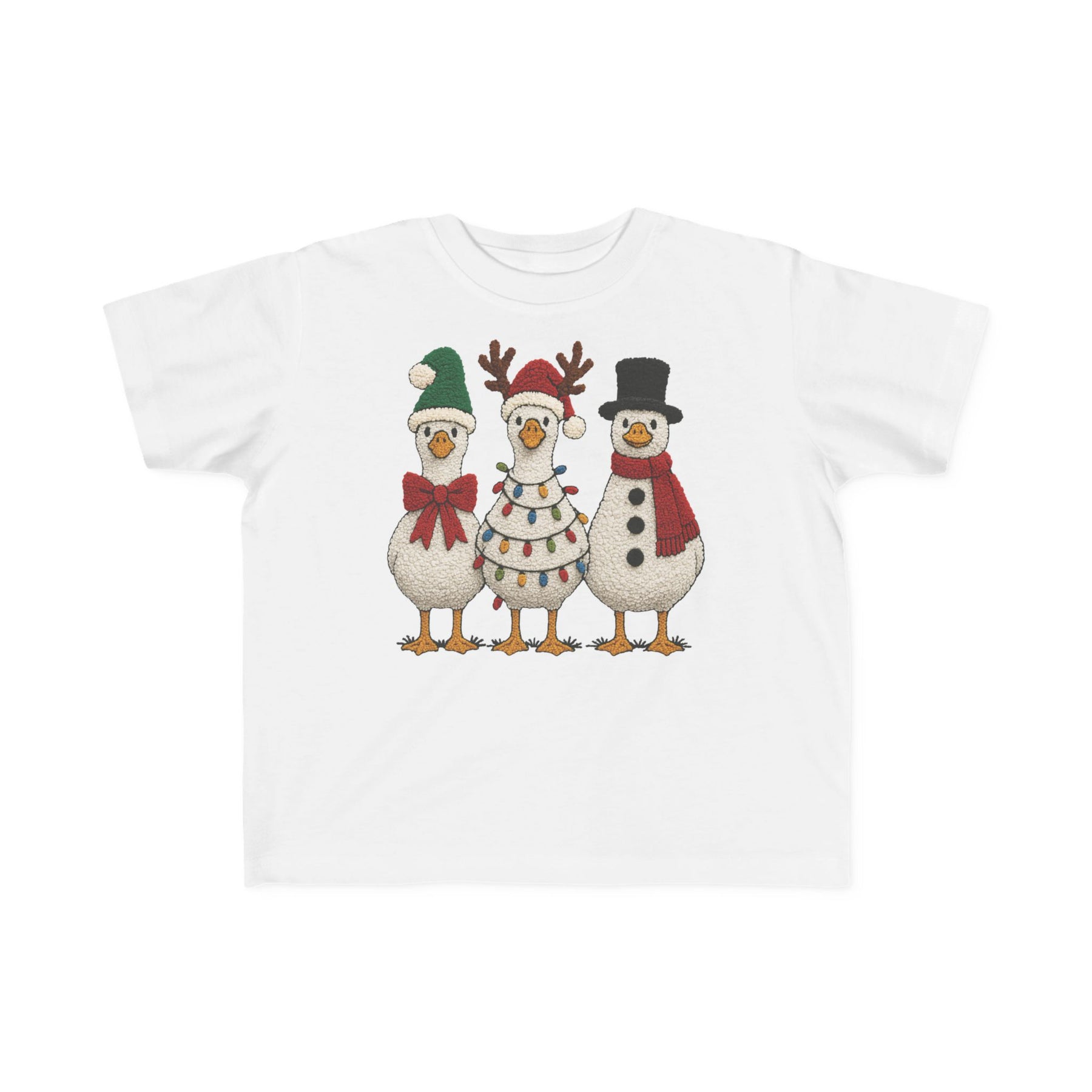 Christmas Ducks Toddler Tee featuring three festive geese in holiday attire, ideal for toddlers' sensitive skin with its soft, durable cotton fabric.
