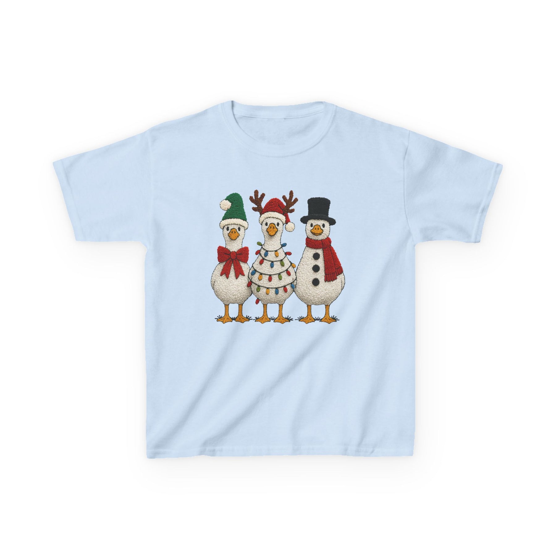 Christmas Geese Kids Tee featuring cartoon ducks in festive attire: Santa hat, reindeer antlers with lights, and snowman with top hat. Ideal for everyday use.