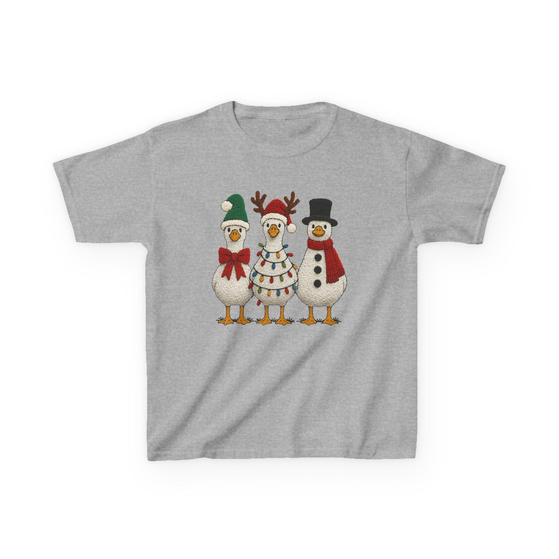 Heather-gray Christmas Geese Kids Tee featuring three festive cartoon ducks in holiday attire: Santa hat, reindeer antlers, and snowman outfit on soft, durable fabric.