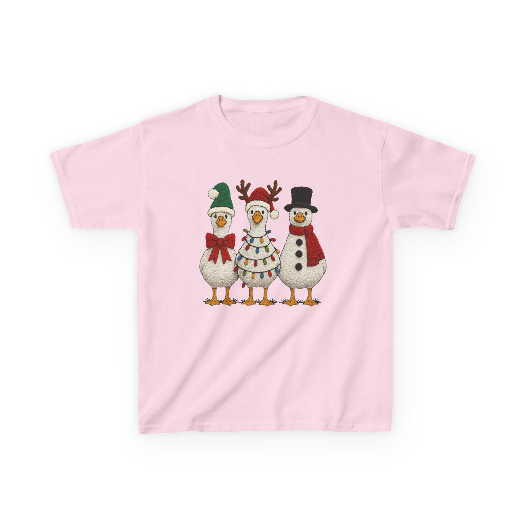 Christmas Geese Kids Tee featuring three cartoon geese in festive costumes: an elf, reindeer, and snowman, ideal for everyday wear with durable cotton fabric.