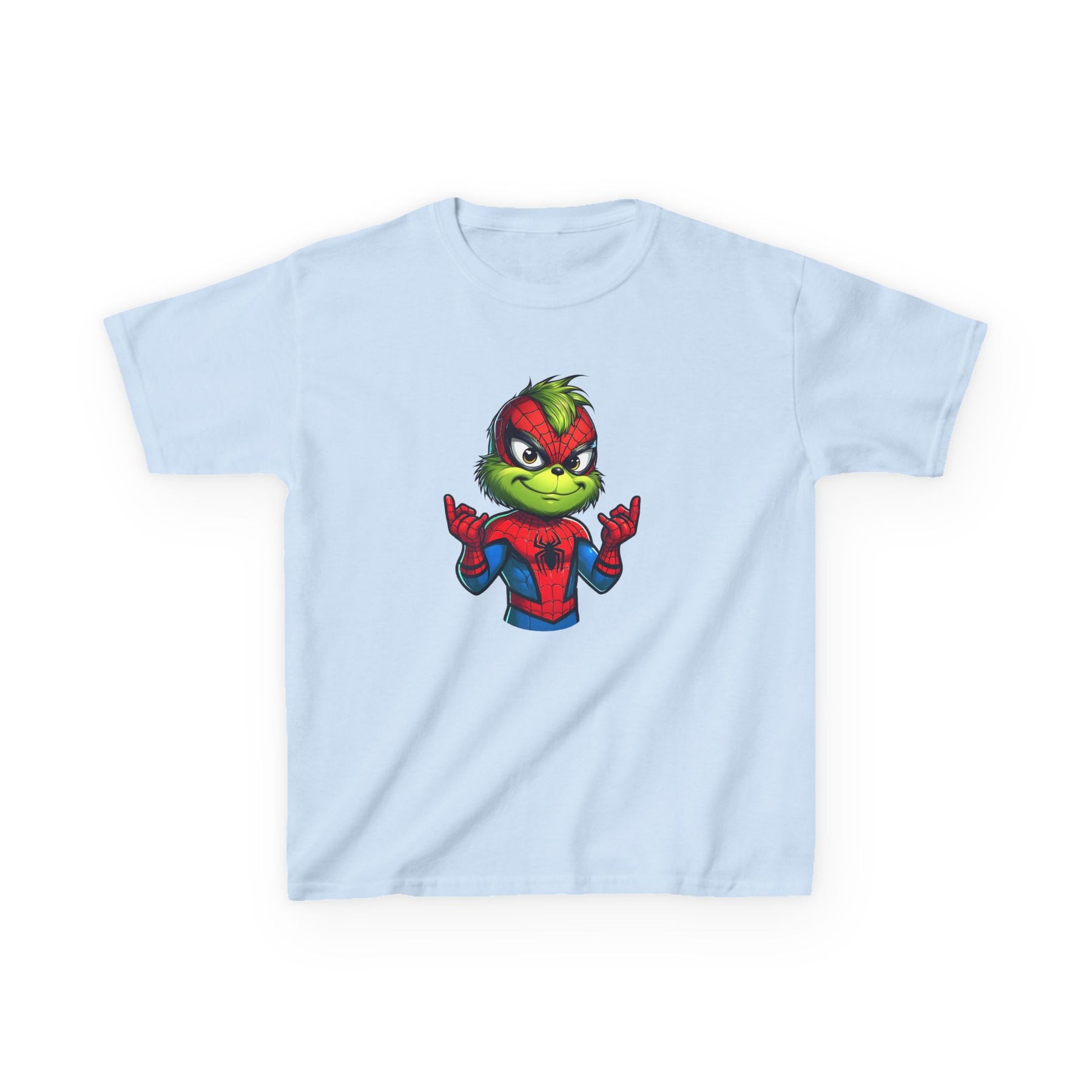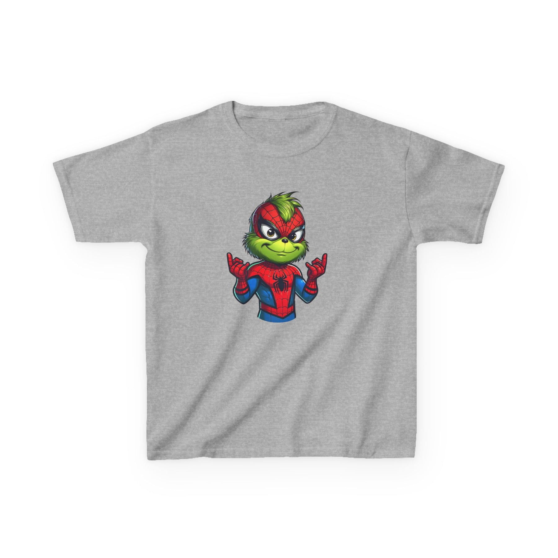 Christmas Spider Kids Tee featuring a Grinch-style character in a Spider-Man costume, perfect for everyday wear with durable, soft cotton fabric.