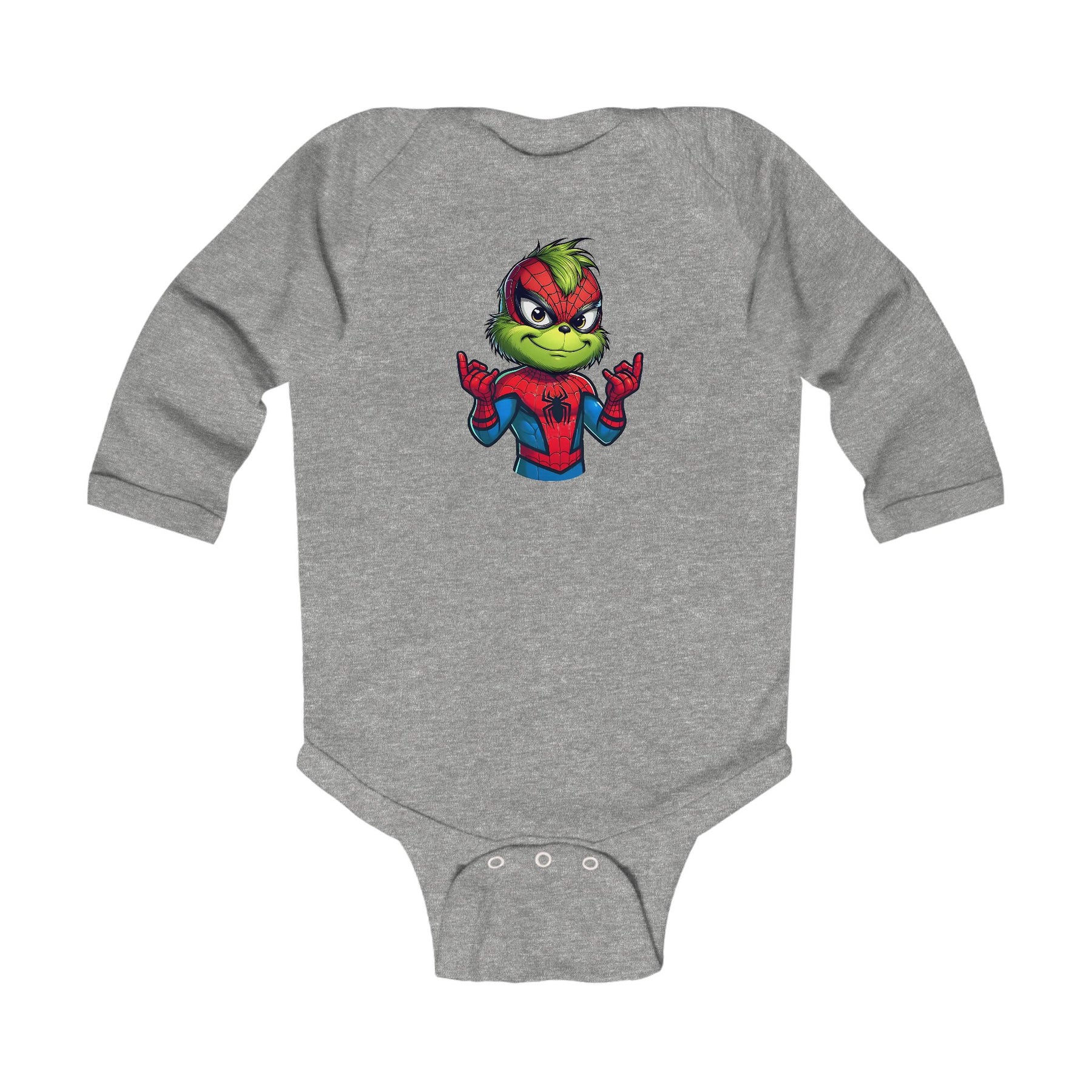 Heather-gray long-sleeve baby bodysuit featuring a small green creature in Spider-Man costume, with snap-button closures for easy changing. Christmas Spider Onesie by Faith Family Designs.