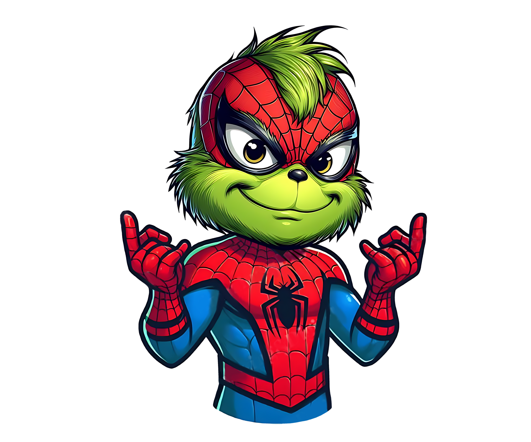 Christmas Spider Onesie: White infant bodysuit featuring a Grinch-Spider-Man mash-up design, long sleeves, and snap closures for convenience. Made from soft, durable cotton fabric.
