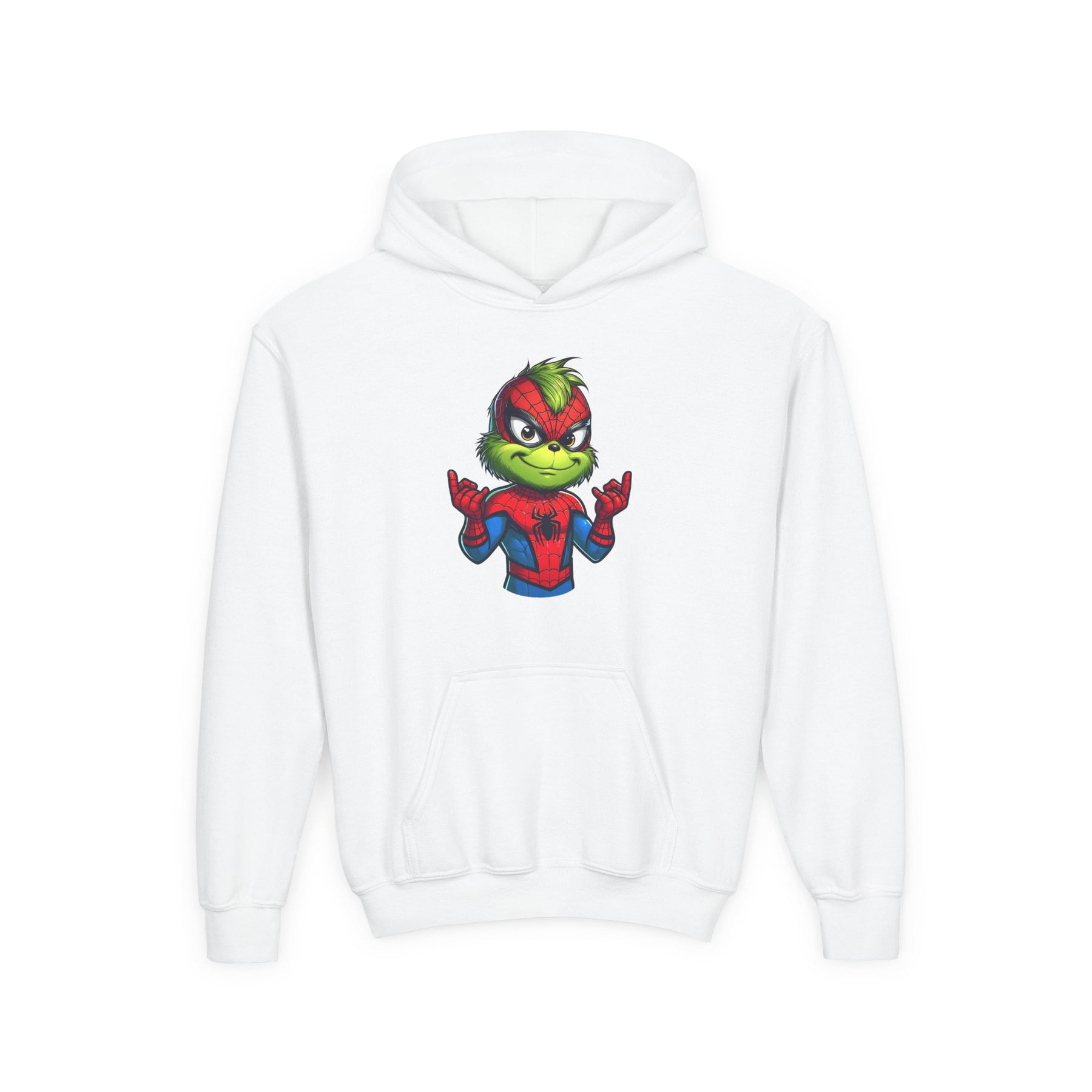 Christmas Spider Youth Hoodie featuring a Grinch-like character in Spider-Man costume, showcasing web-shooting gesture. Ultra-soft fleece with kangaroo pocket and reinforced neck.
