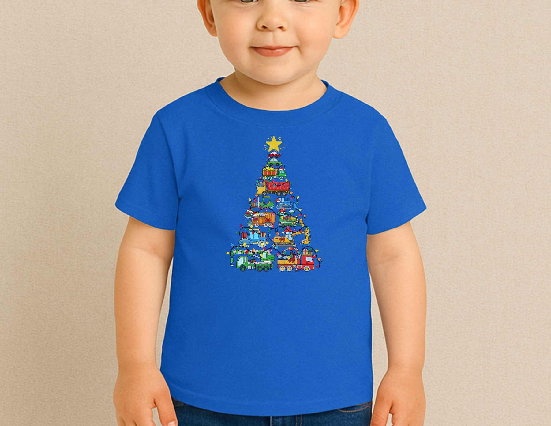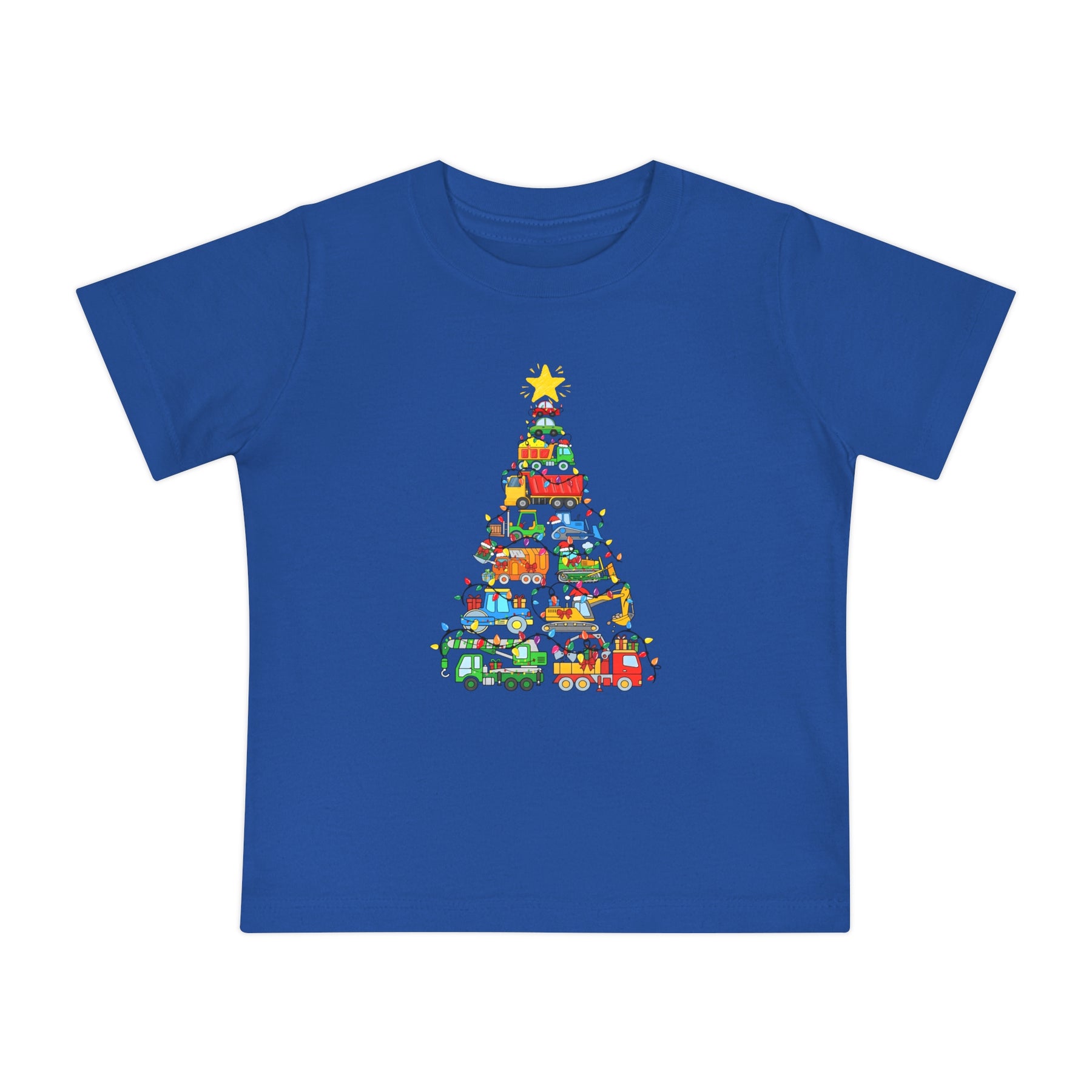 Christmas Truck Baby Tee: A royal-blue children's T-shirt featuring a festive Christmas tree of colorful vehicles with lights and a star, made from soft, durable cotton.