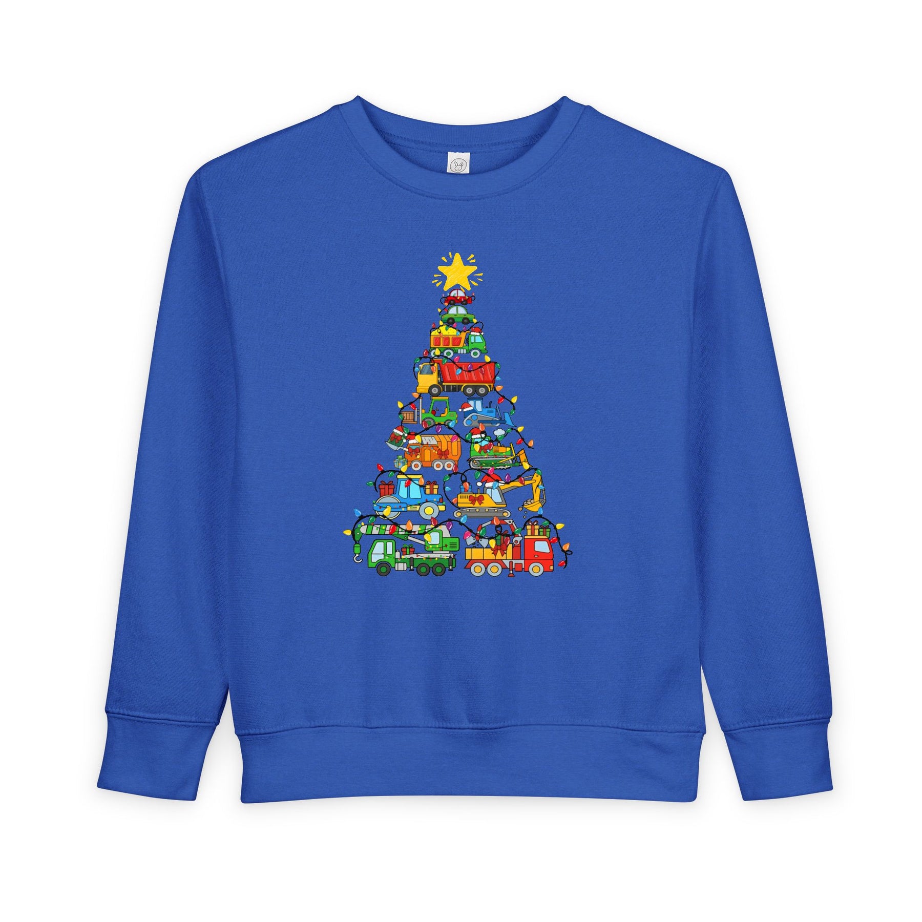 Royal-blue toddler sweatshirt with a graphic of colorful trucks forming a Christmas tree, topped with a yellow star, designed for comfort and durability.