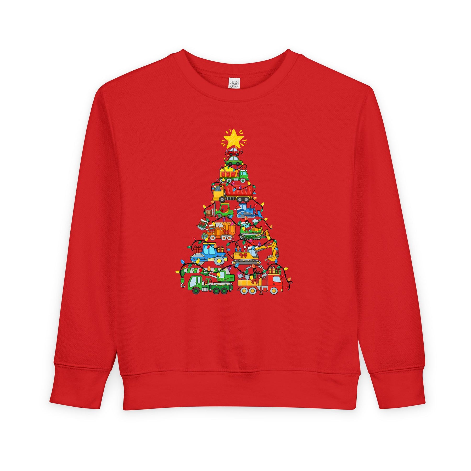 Christmas Truck Toddler Crew: Red sweatshirt with construction vehicles forming a Christmas tree, adorned with holiday lights and a star, designed for warmth and comfort.