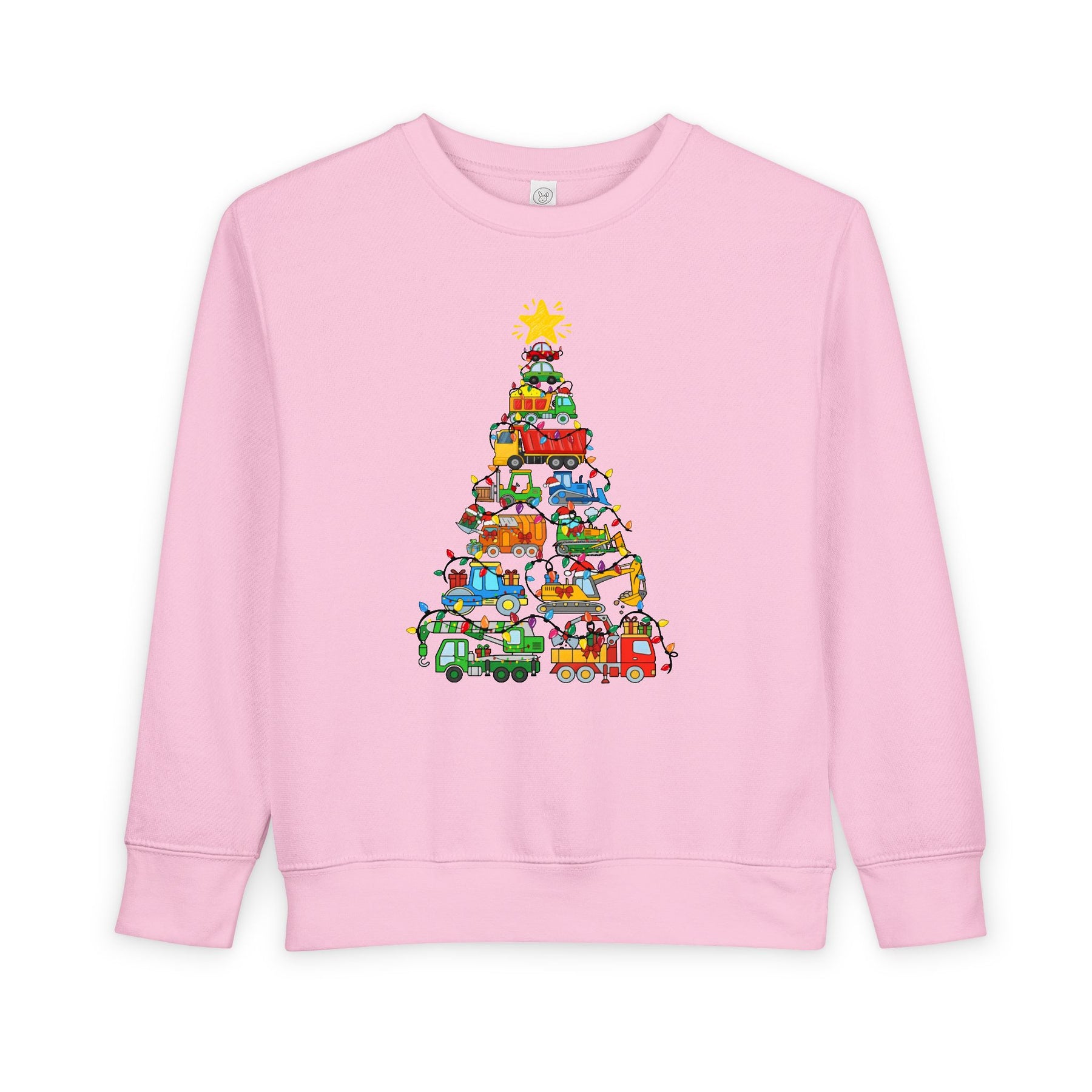 Light-pink Christmas Truck Toddler Crew sweatshirt features a colorful work truck Christmas tree graphic, combining festive charm with comfort and durability for toddlers.