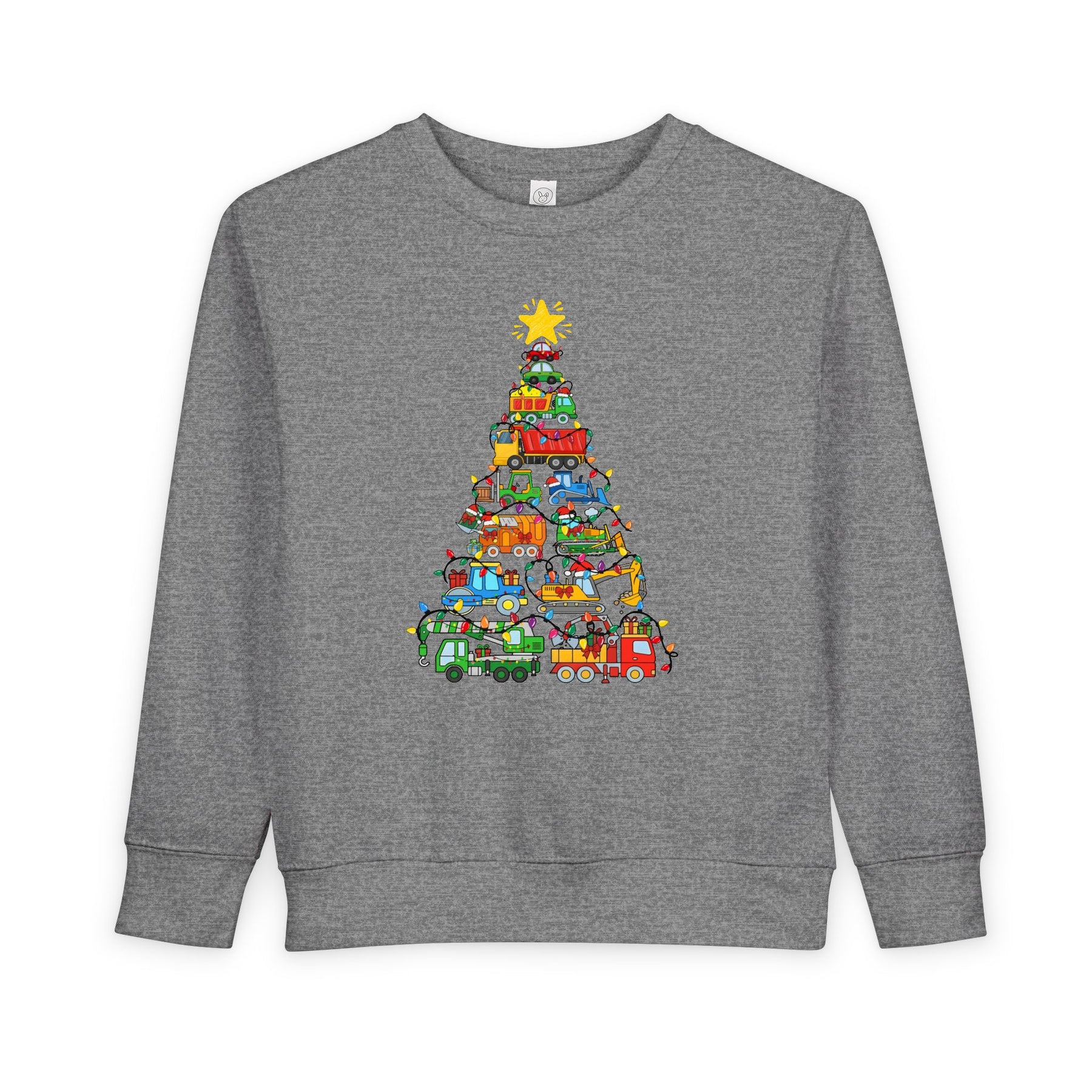 Heather-gray Christmas Truck Toddler Crewneck, featuring a festive graphic of colorful vehicles forming a Christmas tree, adorned with lights and gifts, topped with a star.