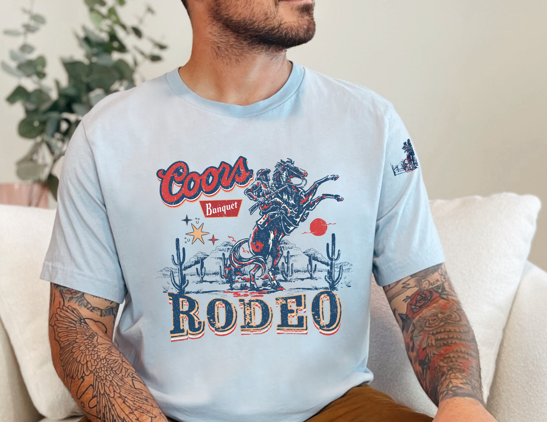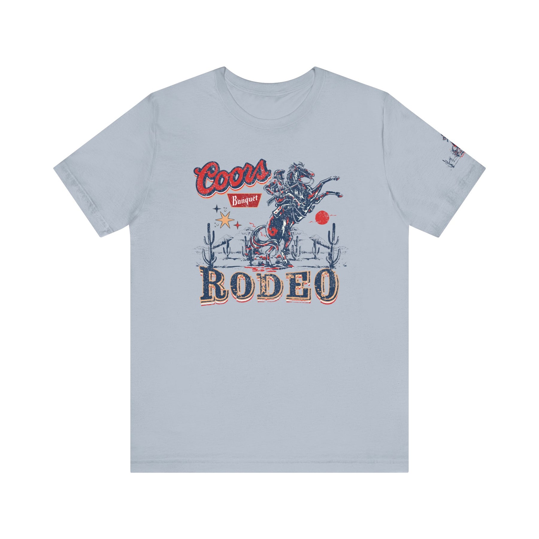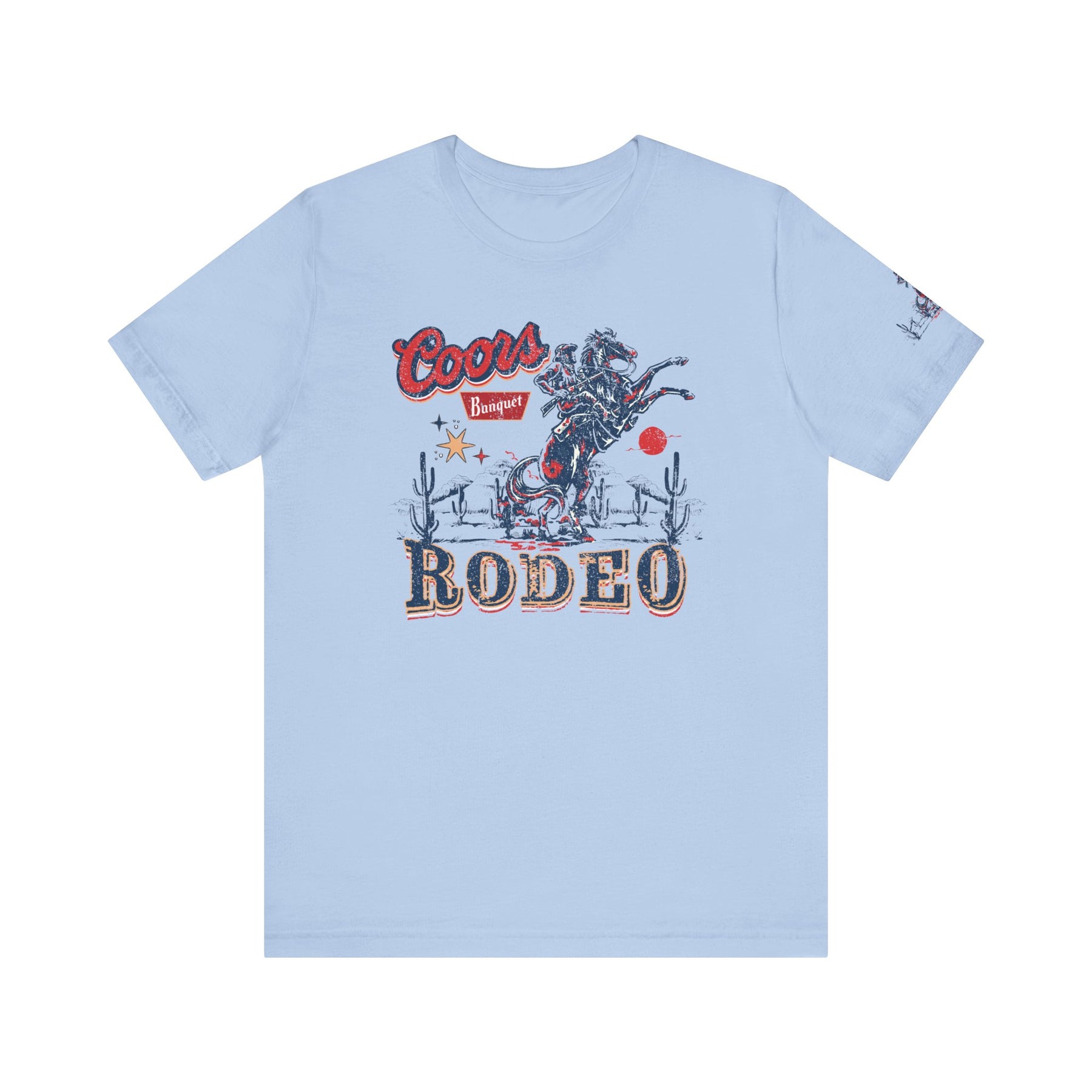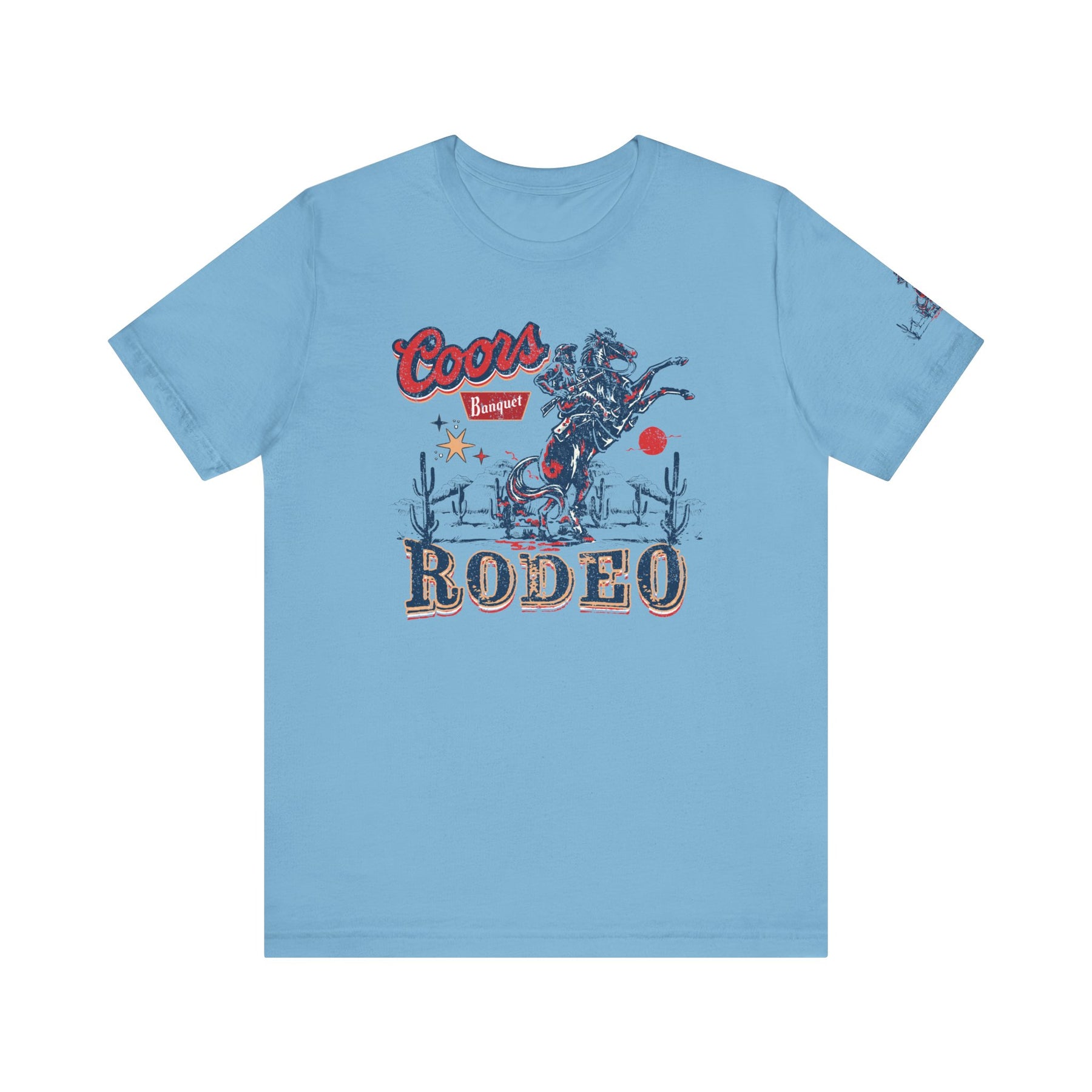 A classic Coors Rodeo Tee featuring a cowboy logo and red/blue design. Unisex jersey tee with ribbed knit collars, 100% cotton, retail fit, tear away label, and true-to-size fit.