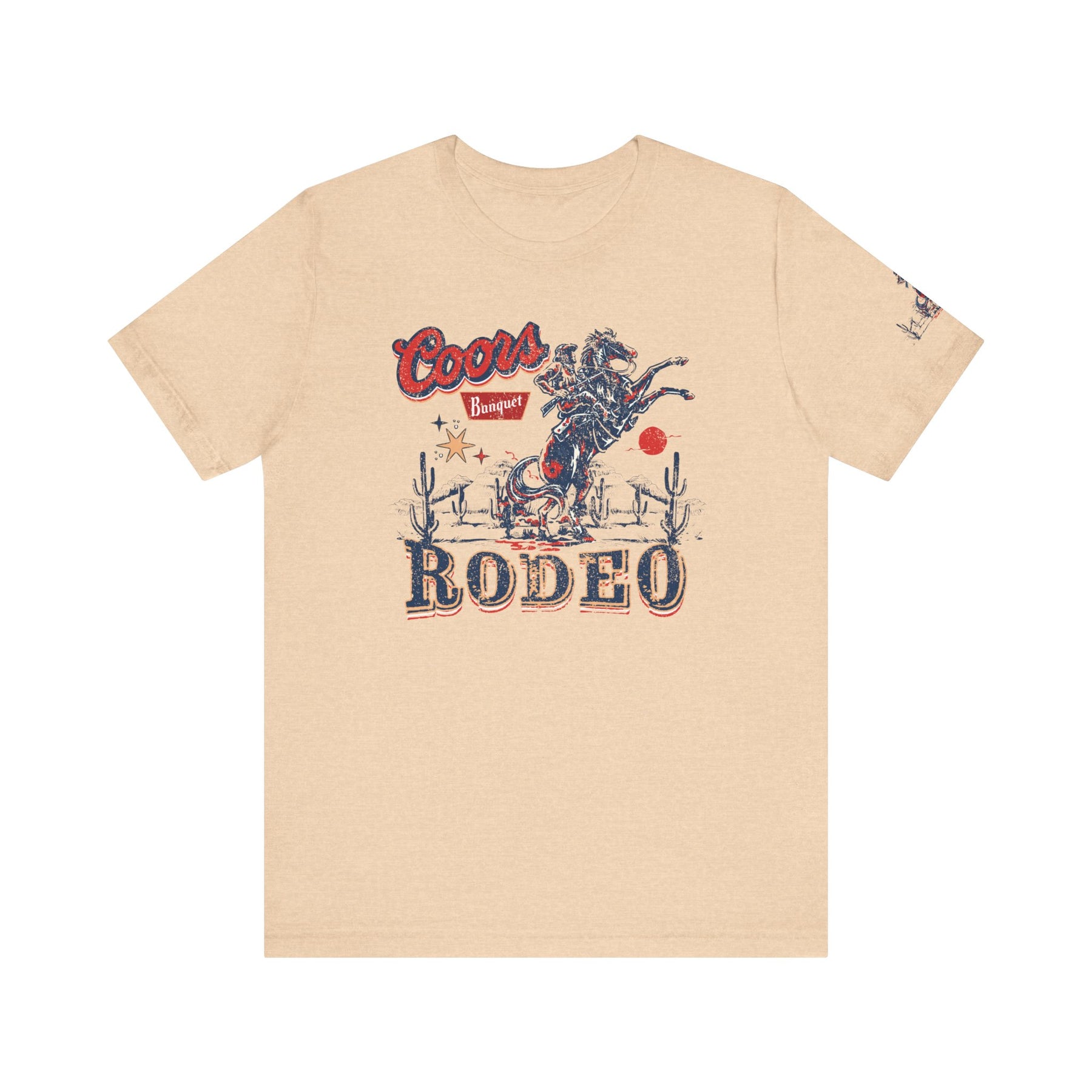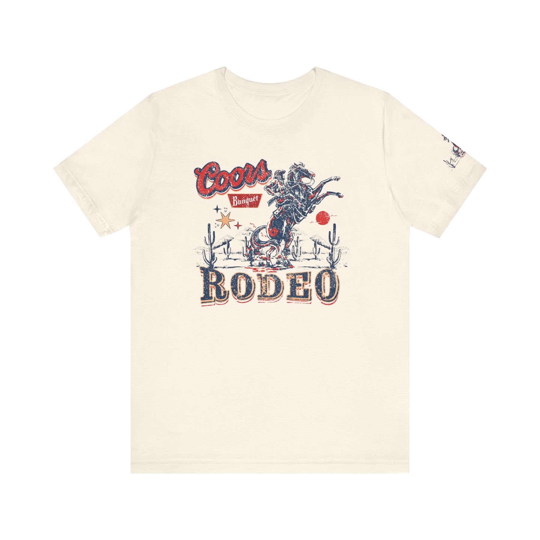 Coors Rodeo Tee: A tan t-shirt featuring a cowboy graphic. Unisex jersey tee with ribbed knit collar, 100% Airlume combed cotton, retail fit, tear away label. Sizes XS-3XL. Ideal for casual wear.