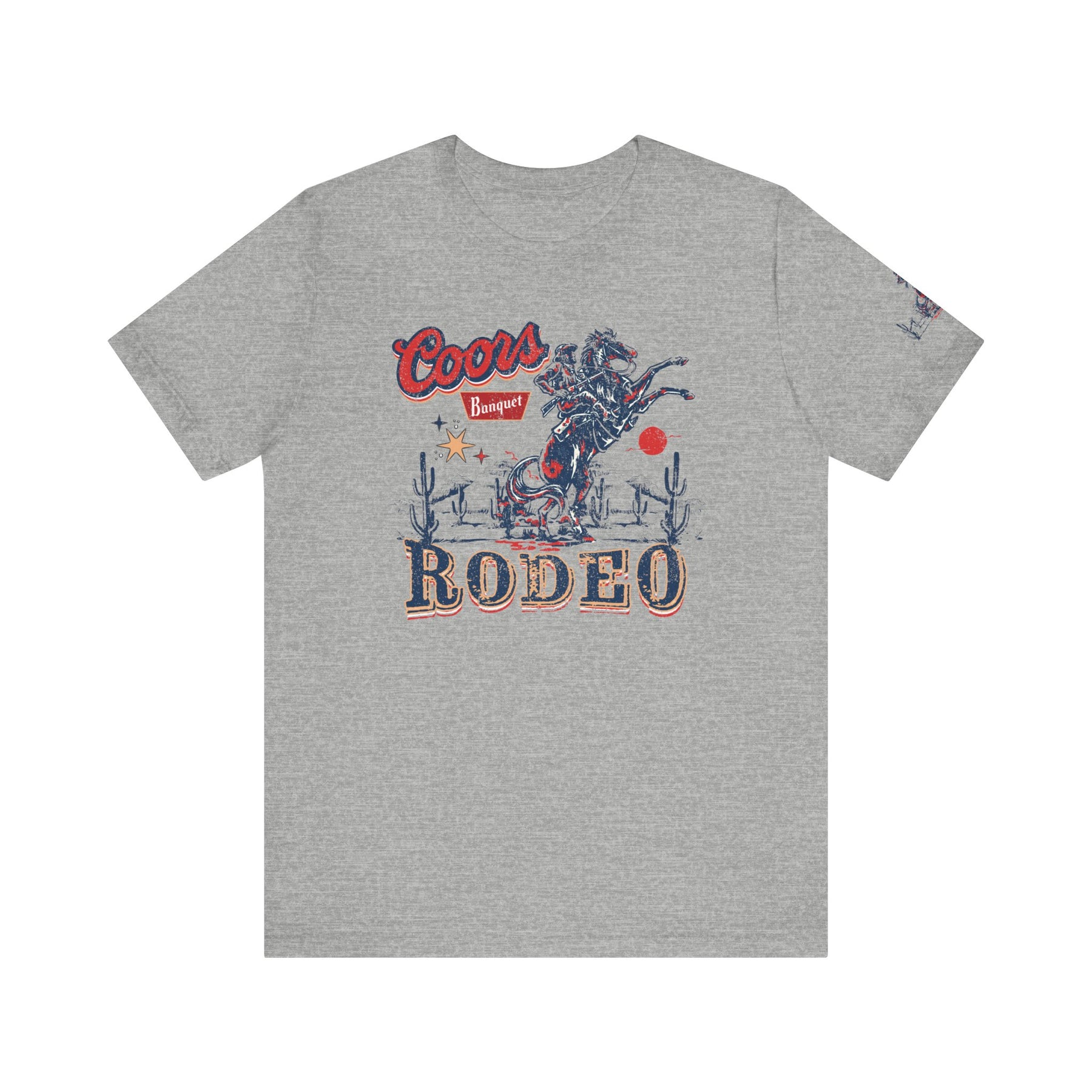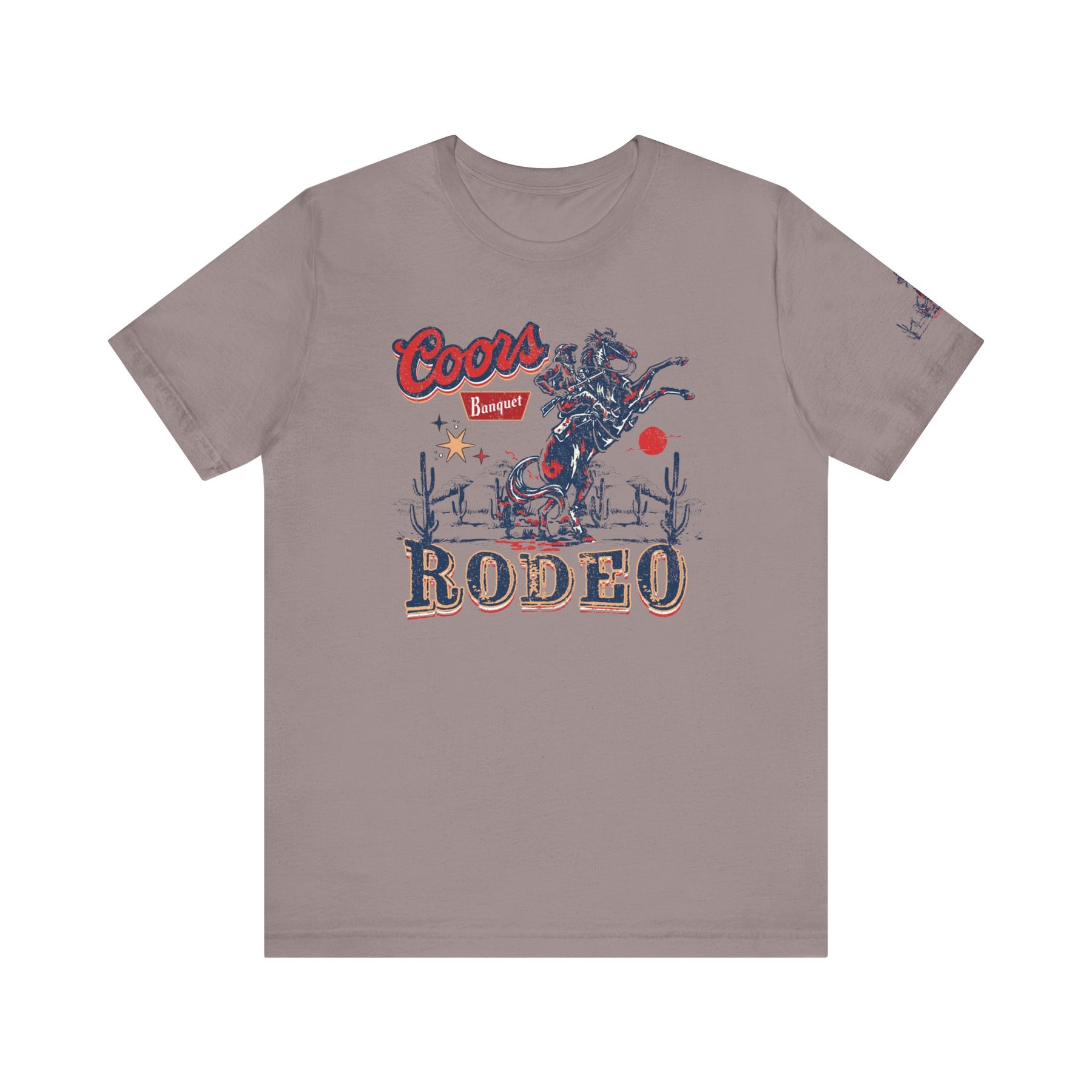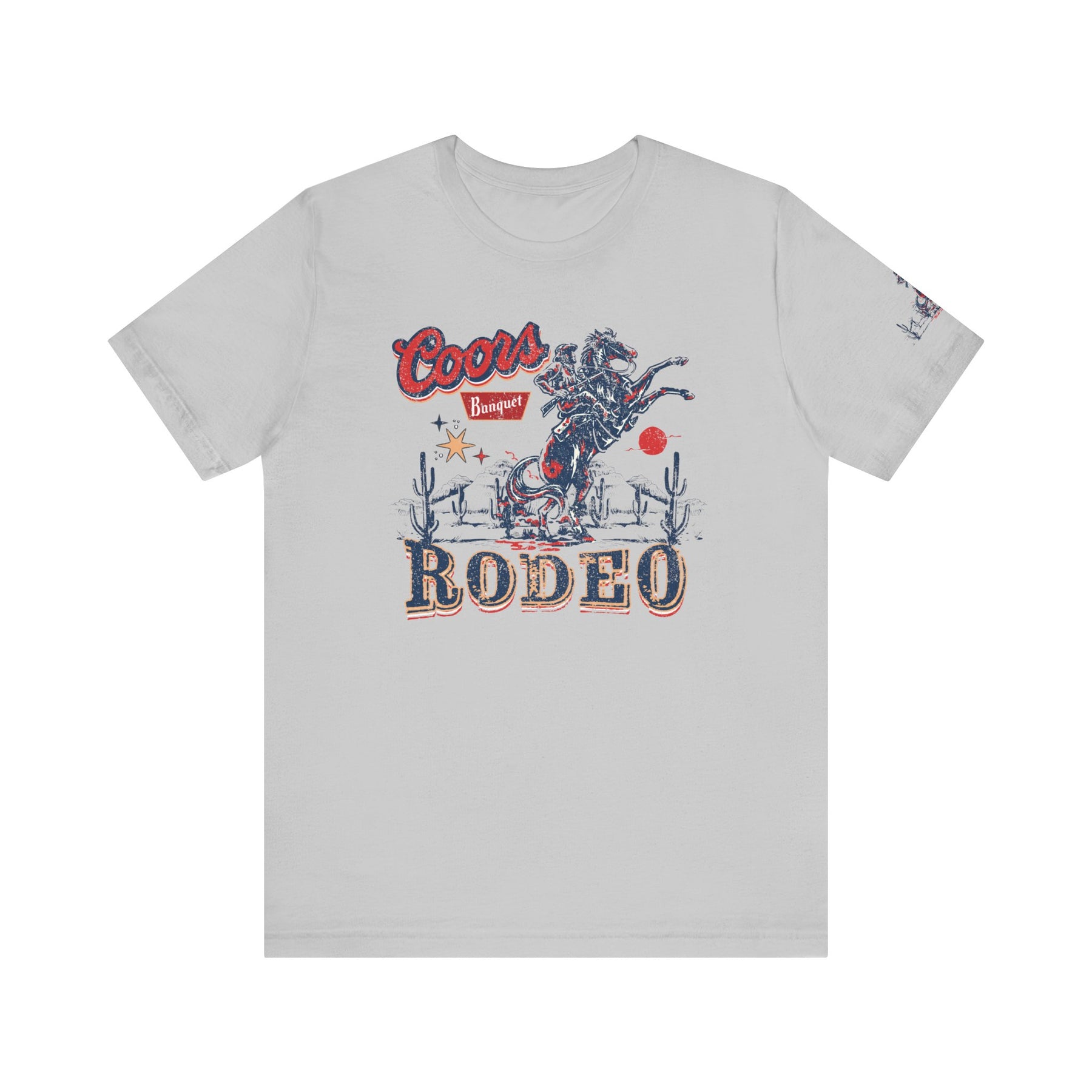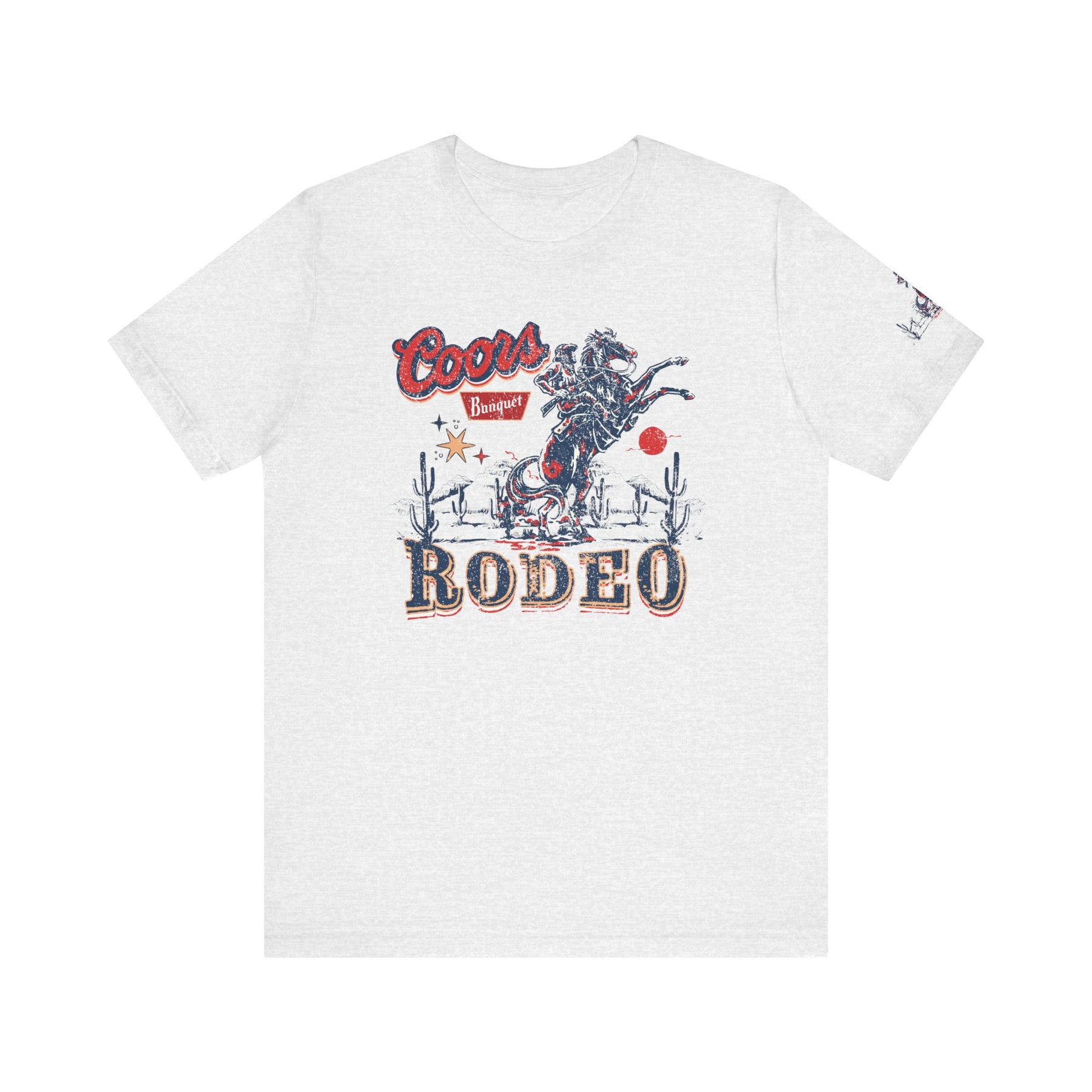 Coors Rodeo Tee: A grey t-shirt featuring red and blue text and a graphic design. Unisex jersey tee with ribbed knit collars, taping on shoulders, and 100% Airlume combed cotton for a comfortable fit.
