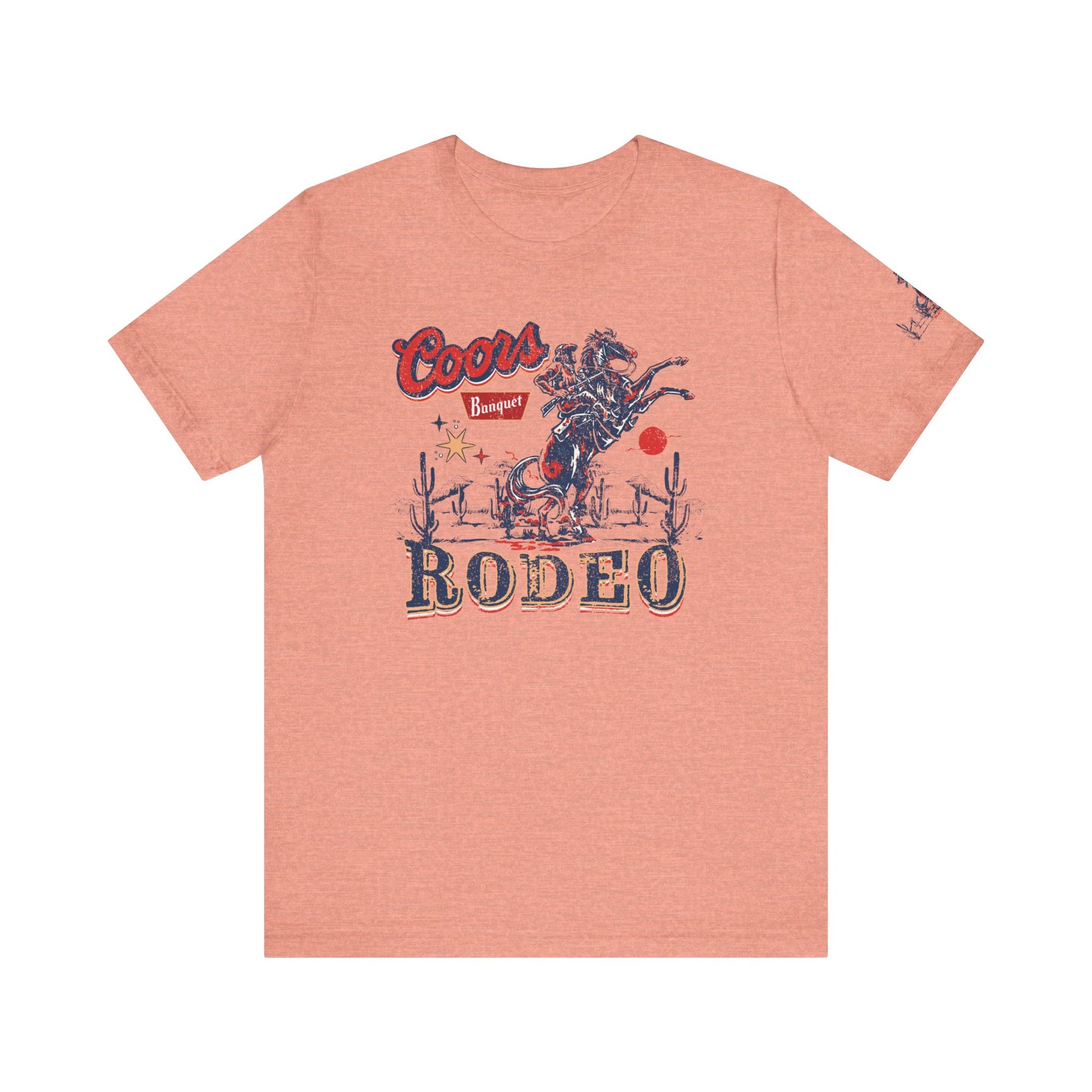 A Coors Rodeo Tee, a classic unisex jersey shirt with a graphic design of a cowboy. Made of 100% cotton, featuring ribbed knit collars and taping on shoulders for a better fit.
