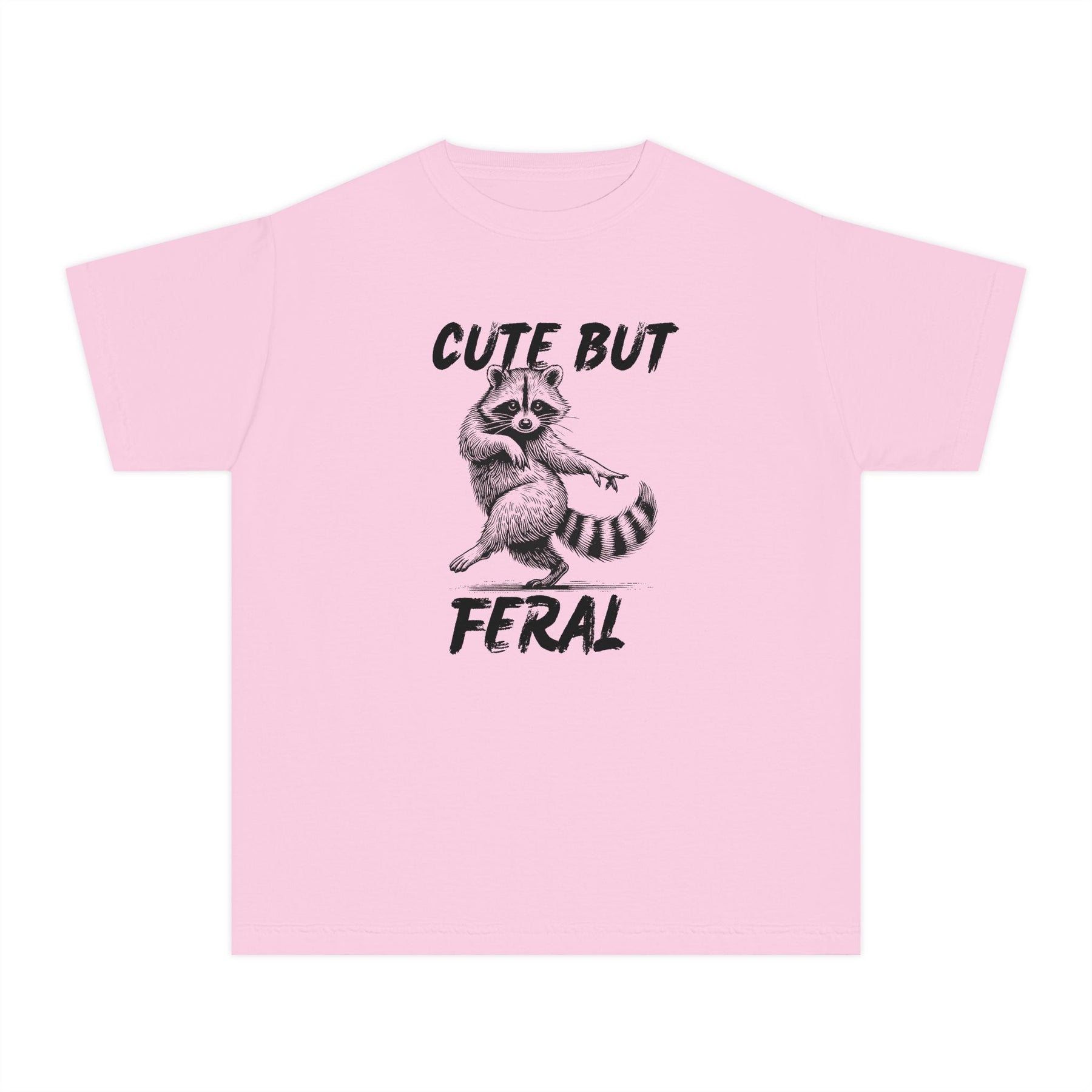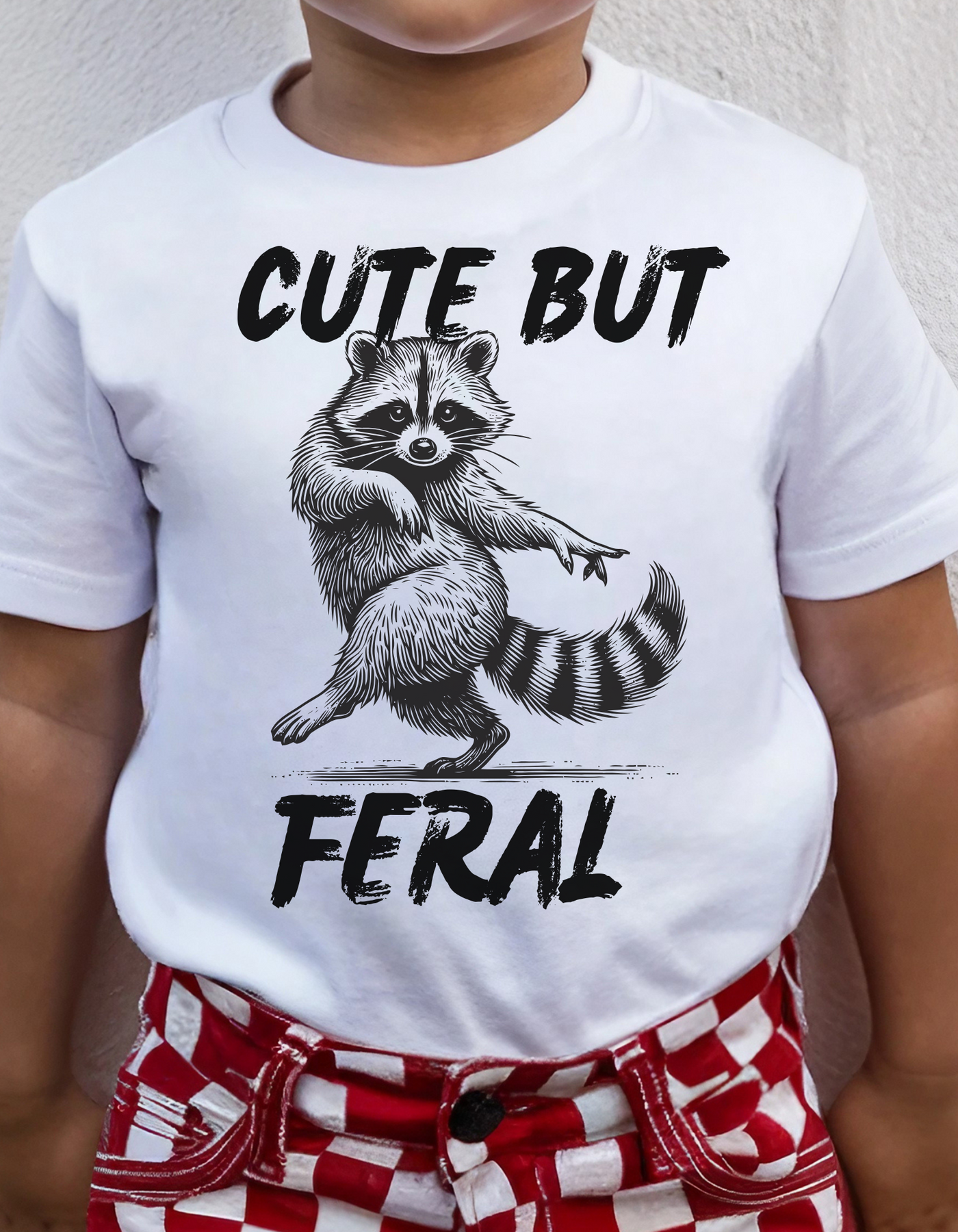 Cute but Feral Kids Tee featuring a playful raccoon illustration and bold text, designed for comfort with 100% combed cotton, ideal for active kids.