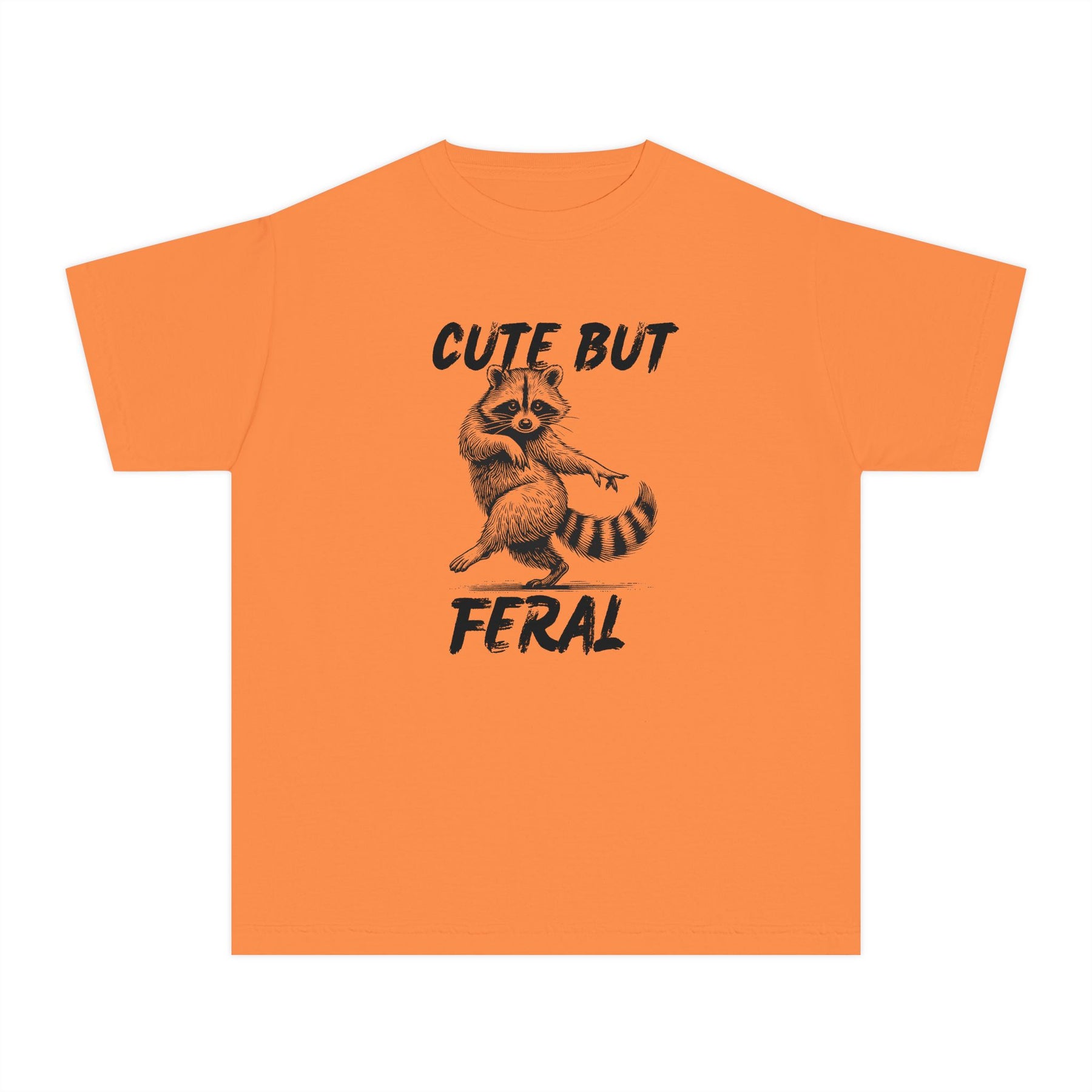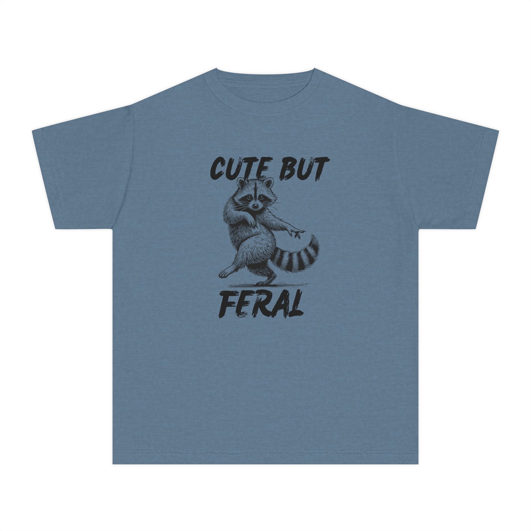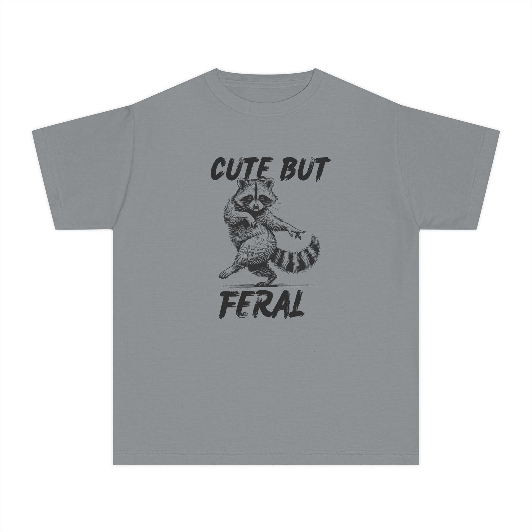 Cute but Feral Kids Tee features a playful raccoon illustration with CUTE BUT above and FERAL below, perfect for active kids seeking comfort and style.