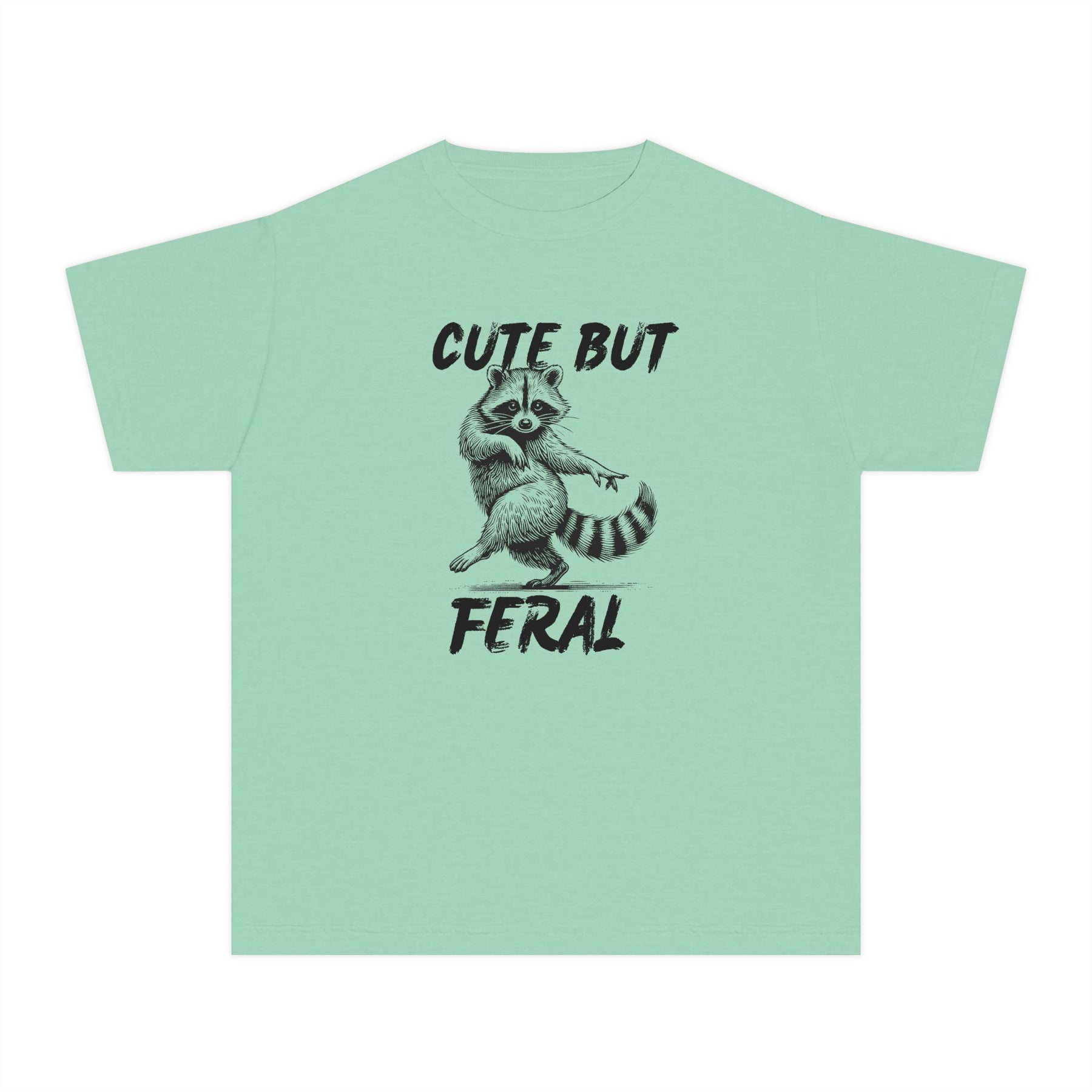 Cute but Feral Kids Tee featuring a stylized raccoon and slogan, designed for comfort and agility in 100% combed cotton, perfect for active kids.