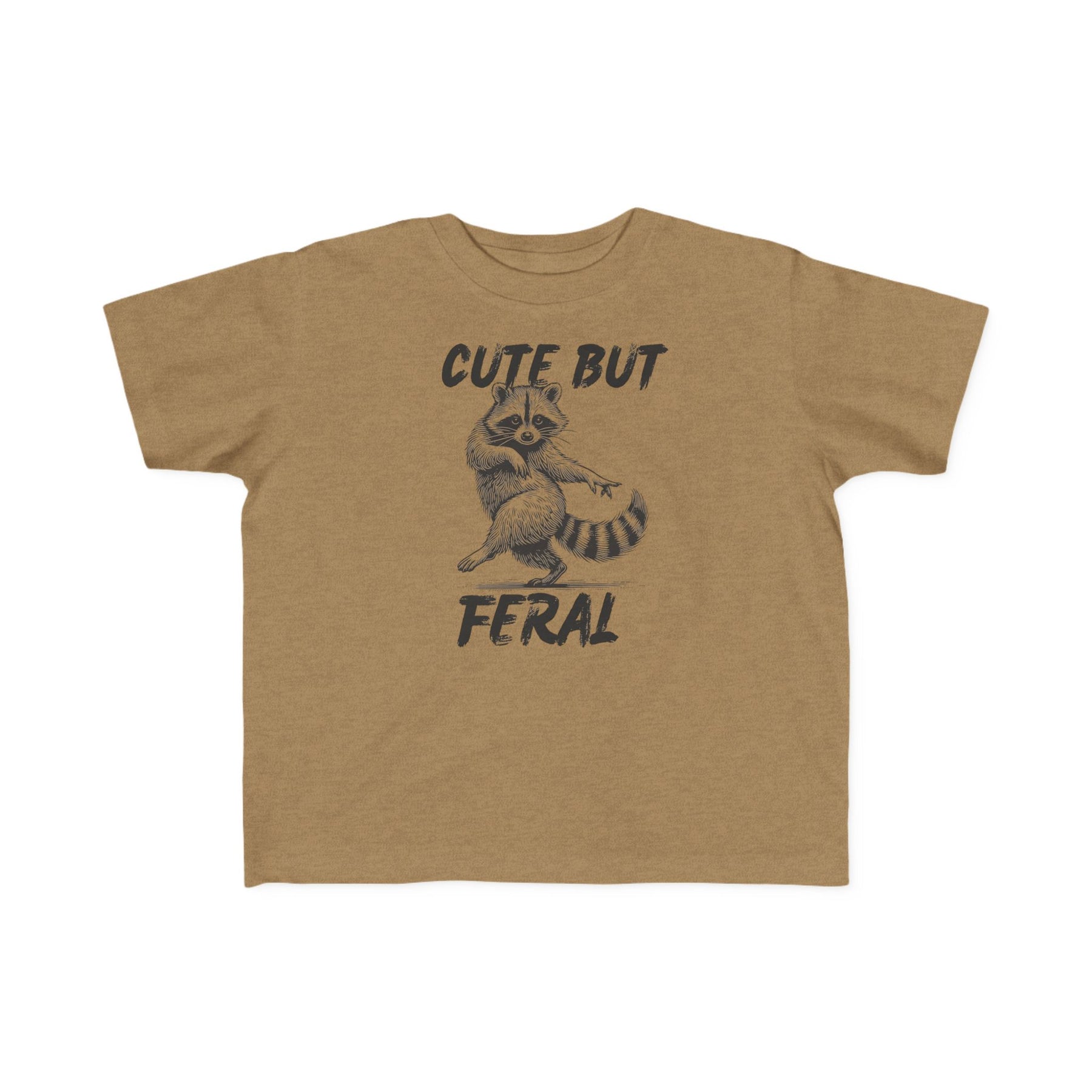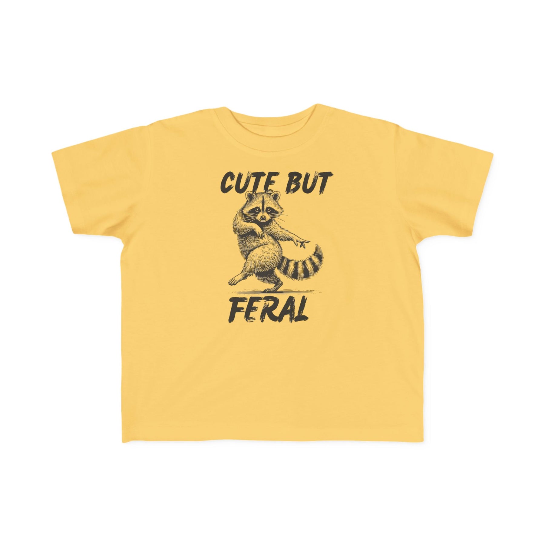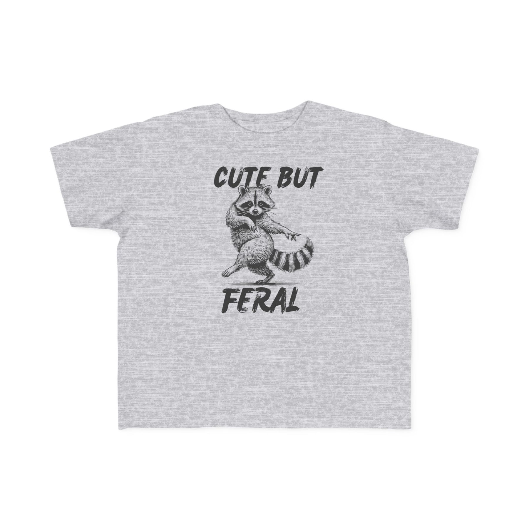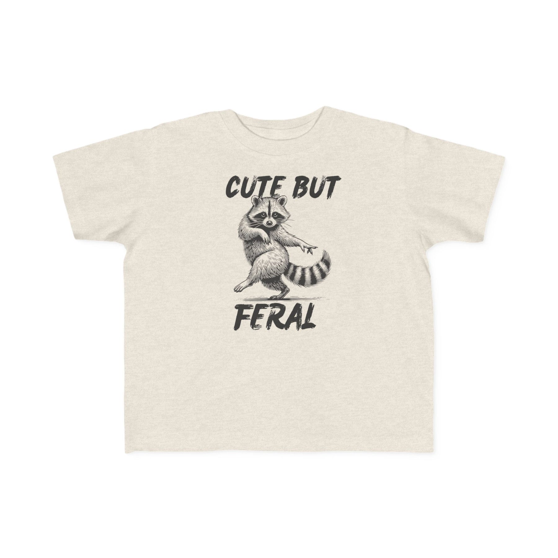 Cute but Feral Toddler Tee featuring a playful raccoon illustration and distressed text, designed for toddler comfort with soft, durable cotton and a classic fit.